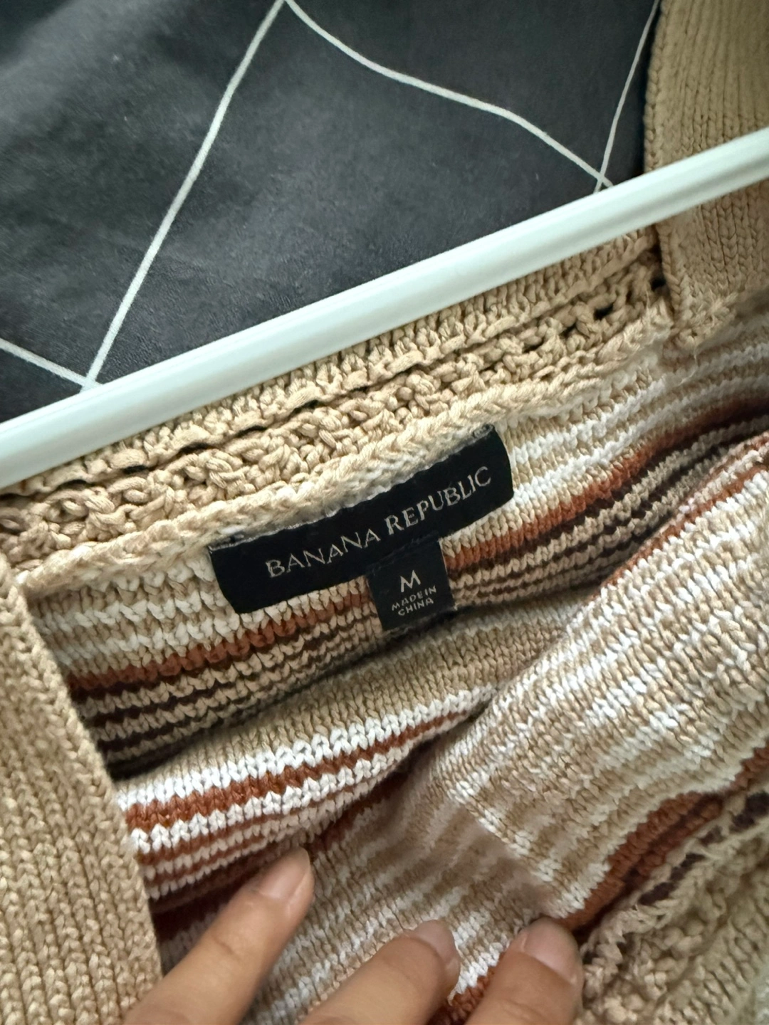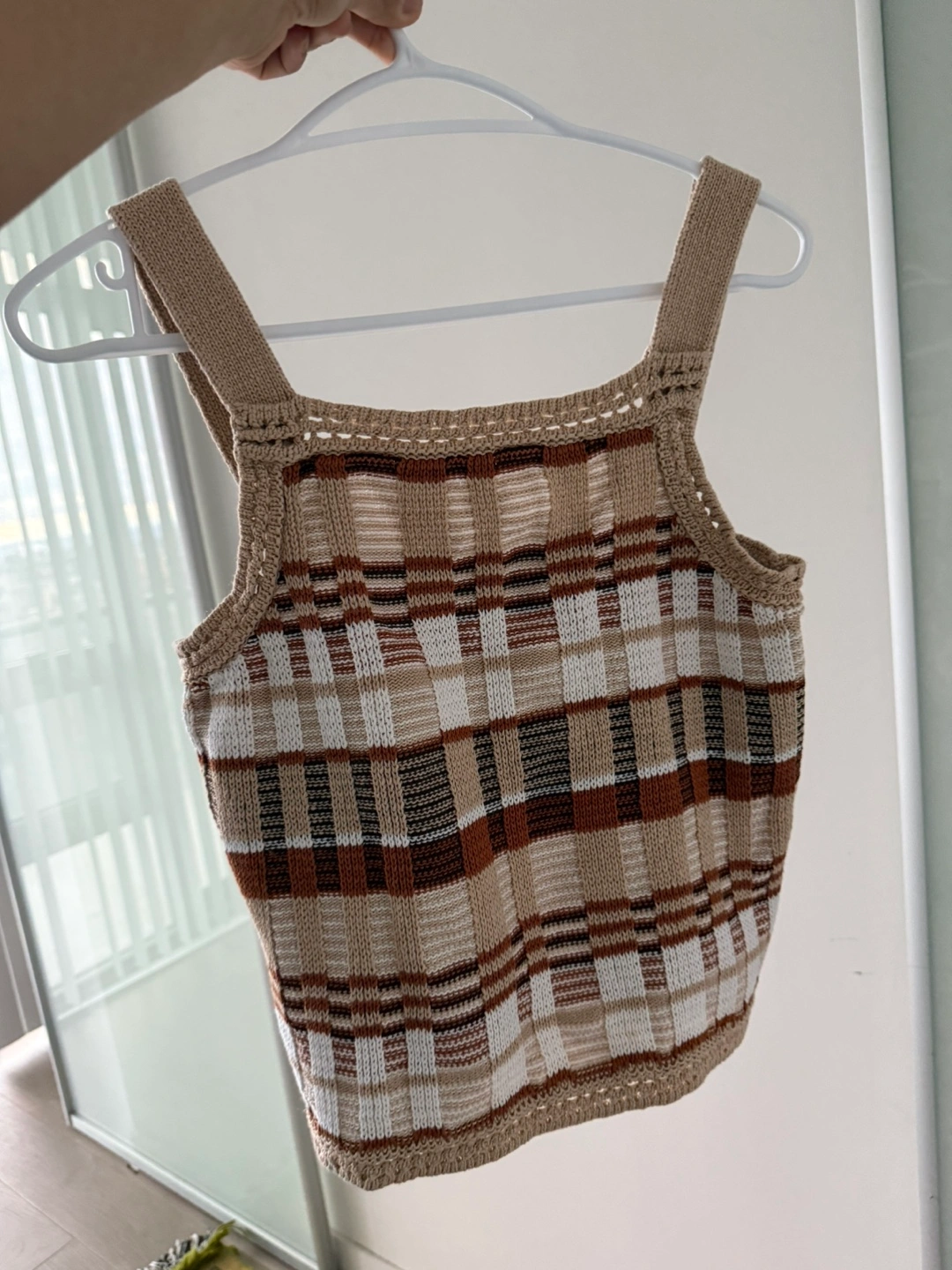 Adorable knit tank top. Brown, beige and white plaid pattern. Crochet detailing at the neckline and bottom hem. Size medium.