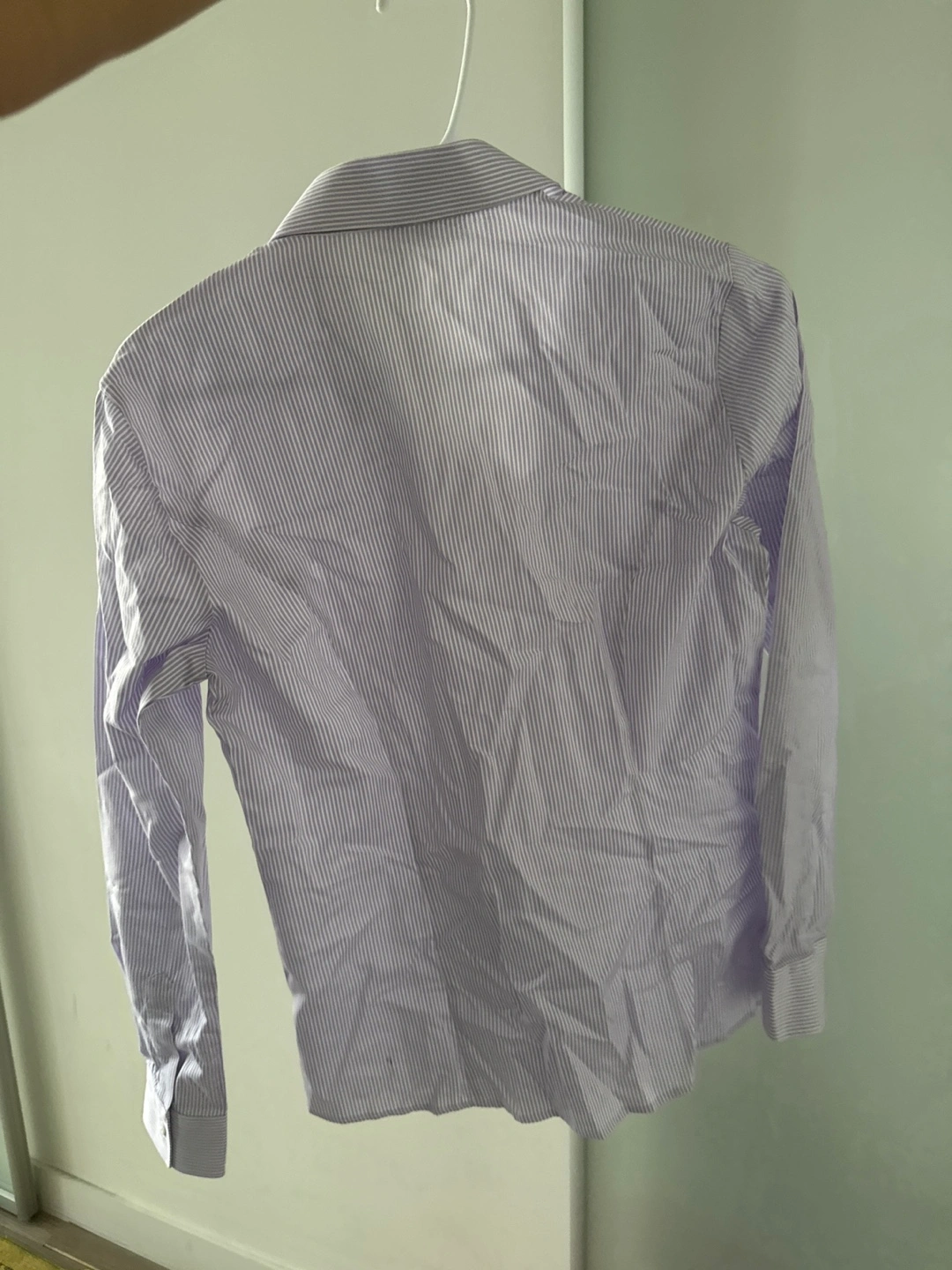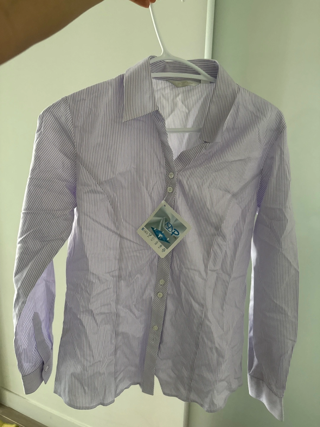 177Women's long-sleeve button-down shirt. Lavender colour with thin white stripes. Size Small. New with tags.