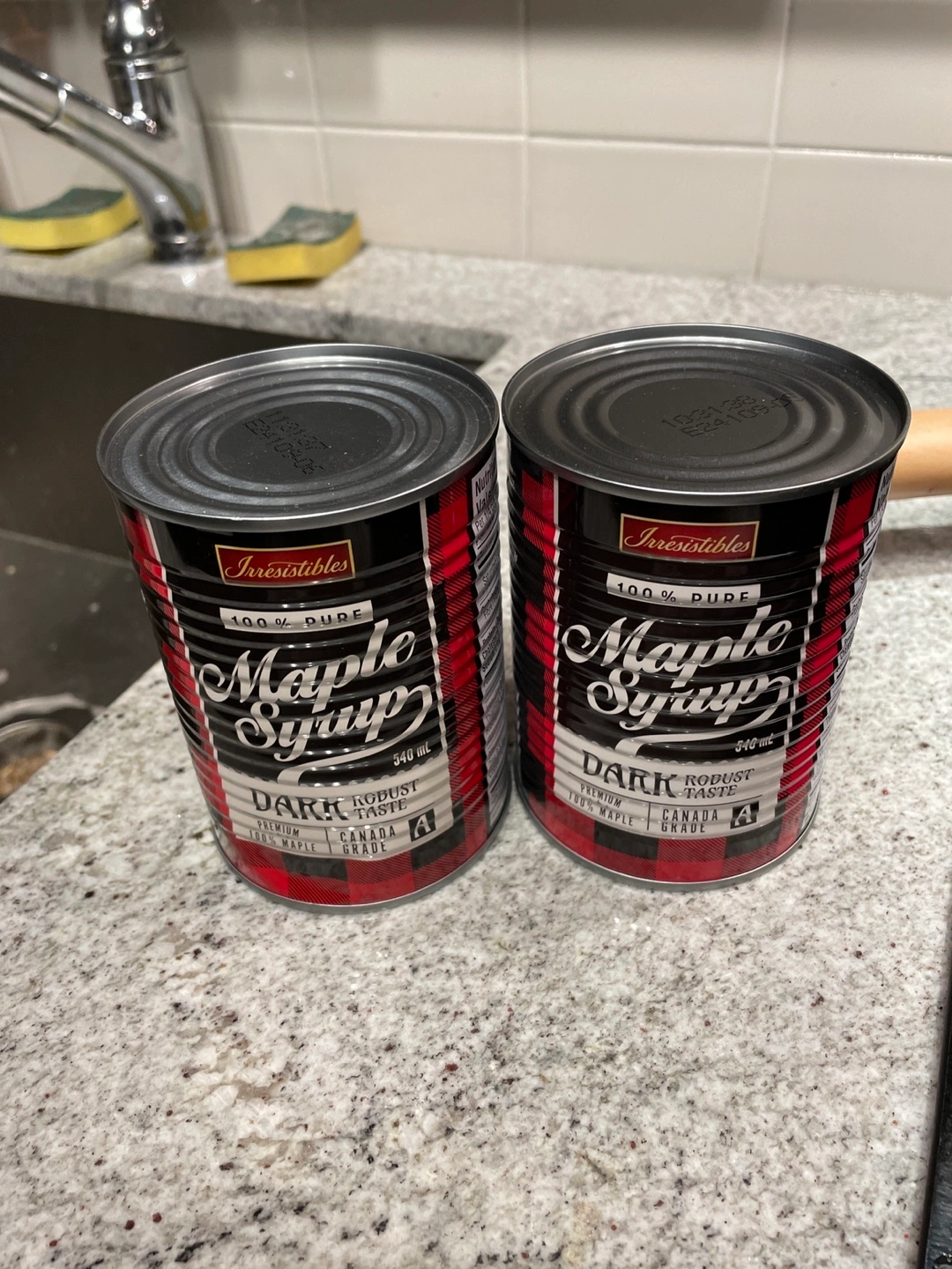 Two cans of Irresistibles 100% pure maple syrup. Dark robust taste. Premium quality. Unopened, new. Canadian grade A.