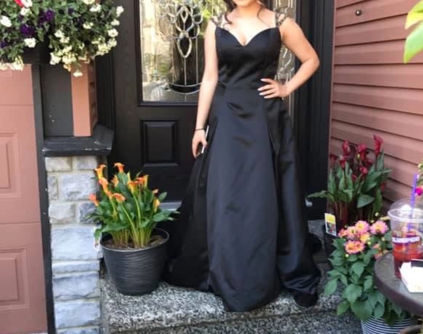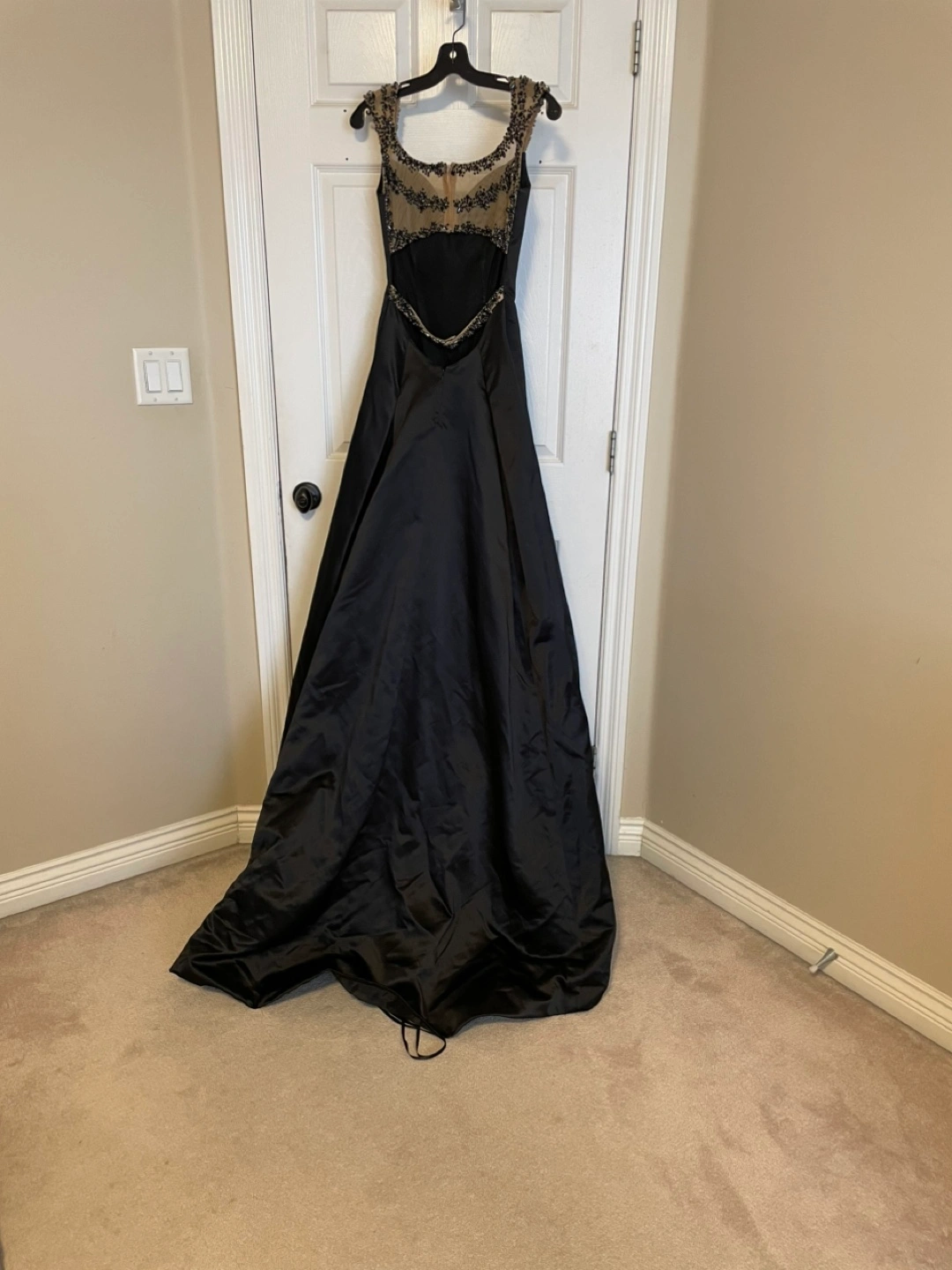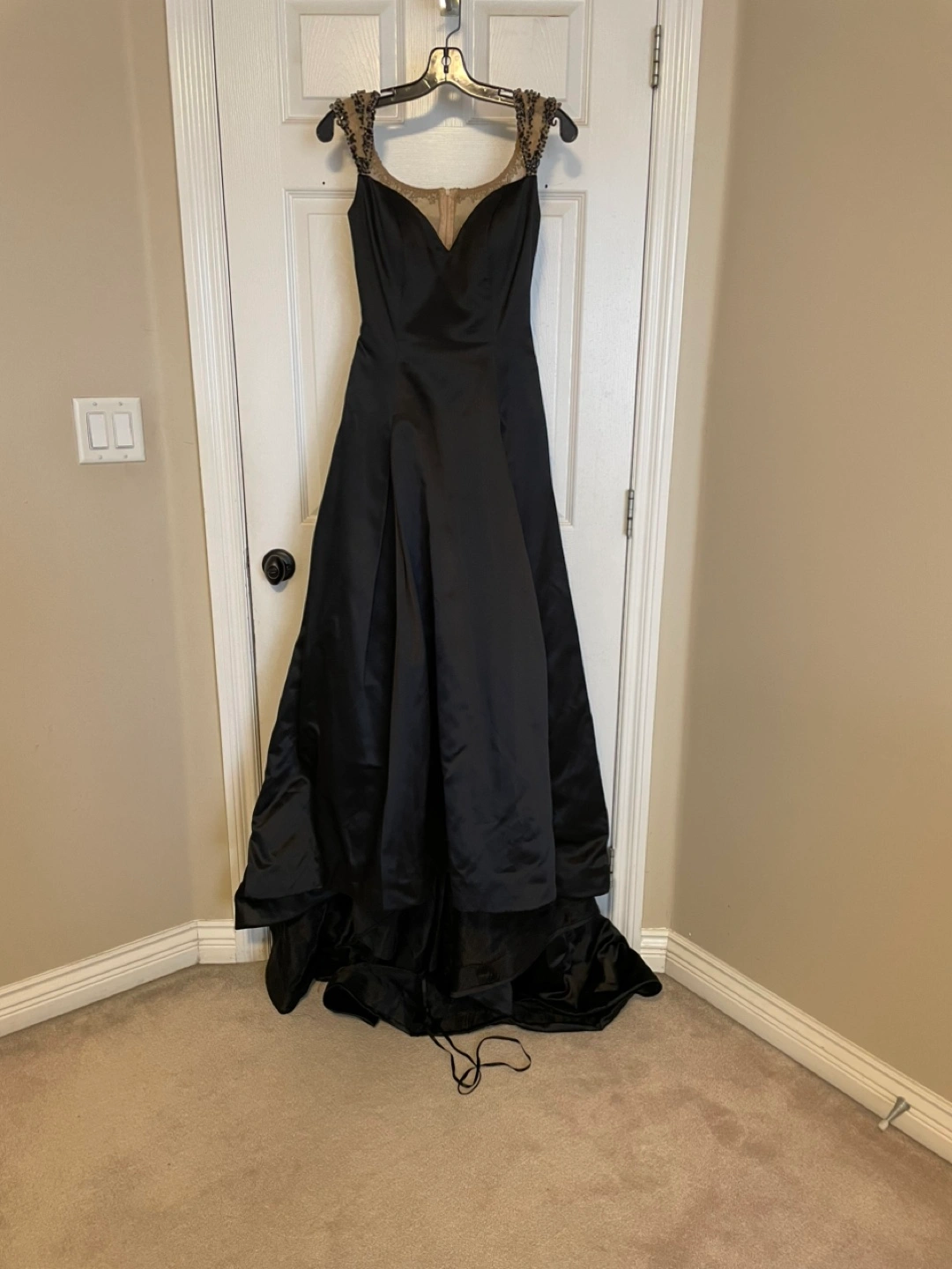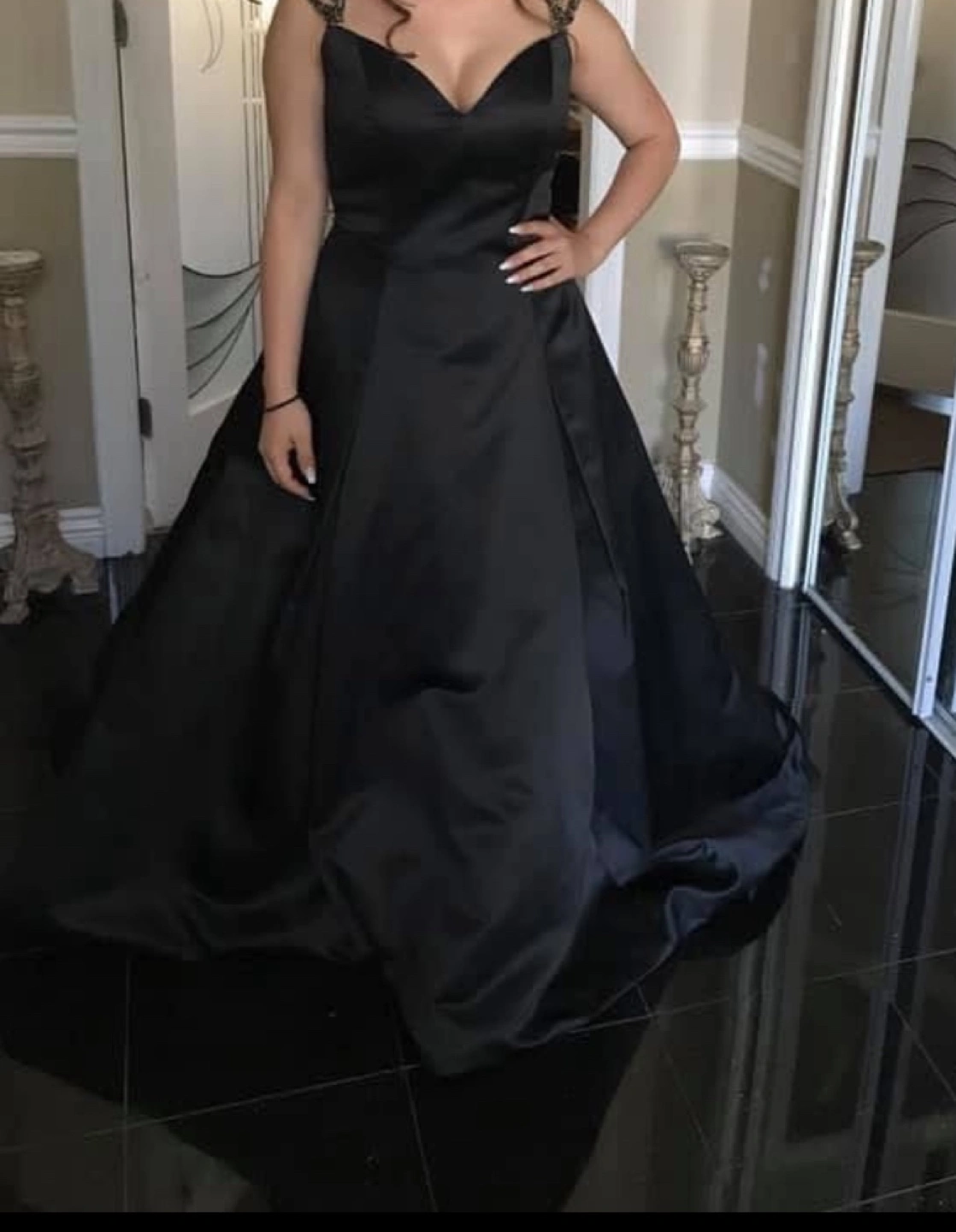 Elegant black floor-length gown. Features a V-neckline, beaded straps, and a fitted bodice. A-line skirt flows beautifully. Open back detail. Perfect for prom, special occasion, or formal event. Used only once. Bought it for $900 but selling it for $220