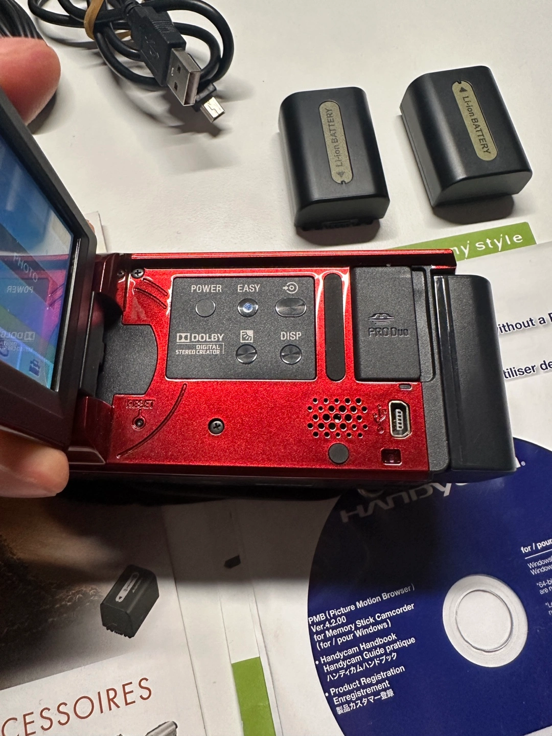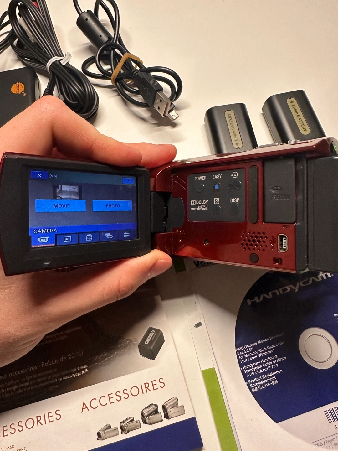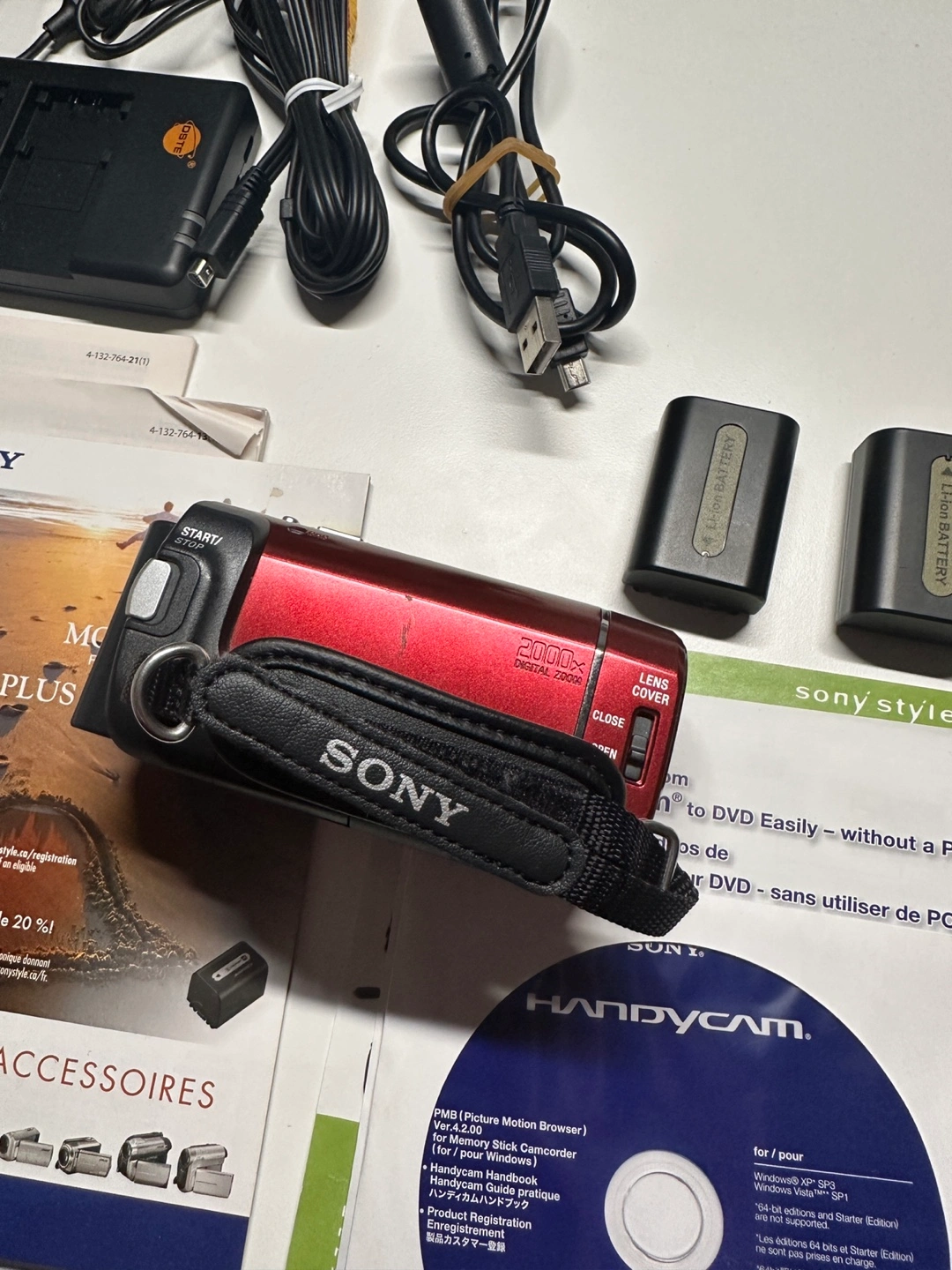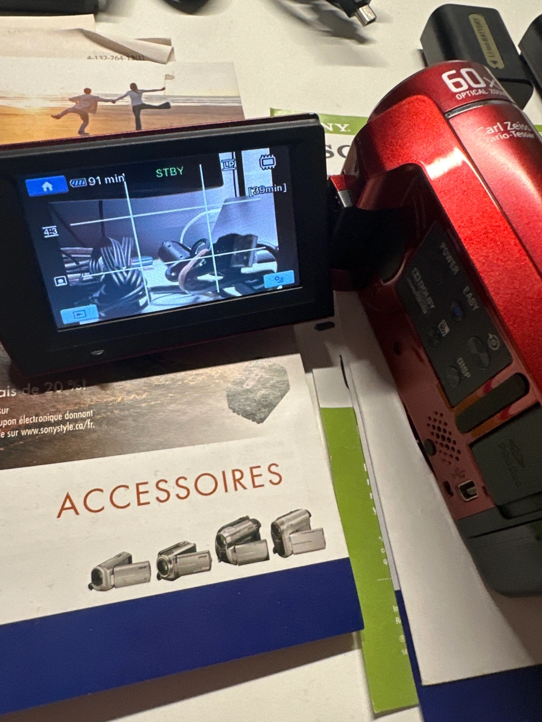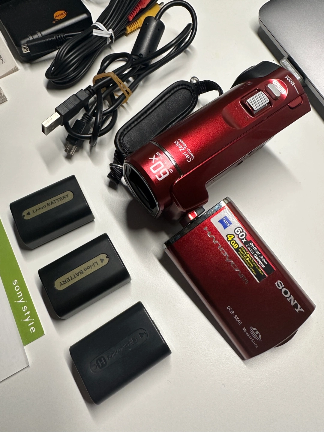 Vintage charm using this fully functional Sony Handycam DCR-SX40! This red camcorder offers 60x optical zoom and records directly to an SD card, perfect for nostalgic video enthusiasts or creative projects.