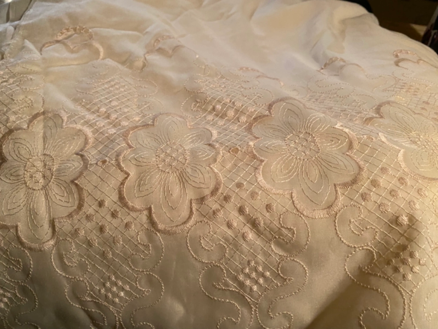 Beautiful cream-coloured fabric to make drapes/curtains. Features delicate floral embroidery. Adds a touch of elegance to any room. Perfect for special occasions or everyday use.