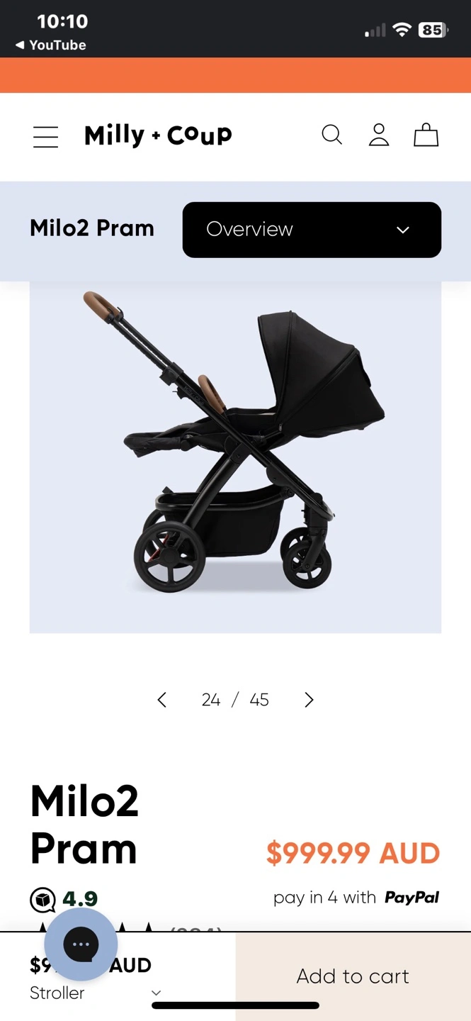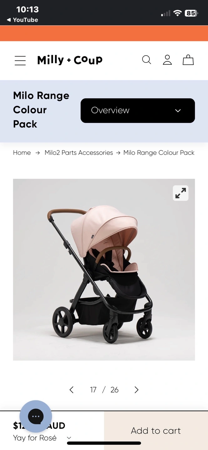 Milo2 pram, includes colour pack. Excellent condition. Features a rose-coloured canopy and matching liner. Black chassis. Lightweight and easy to manoeuvre. Suitable from birth.