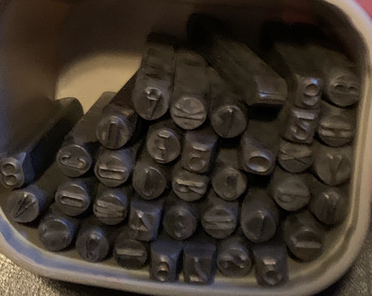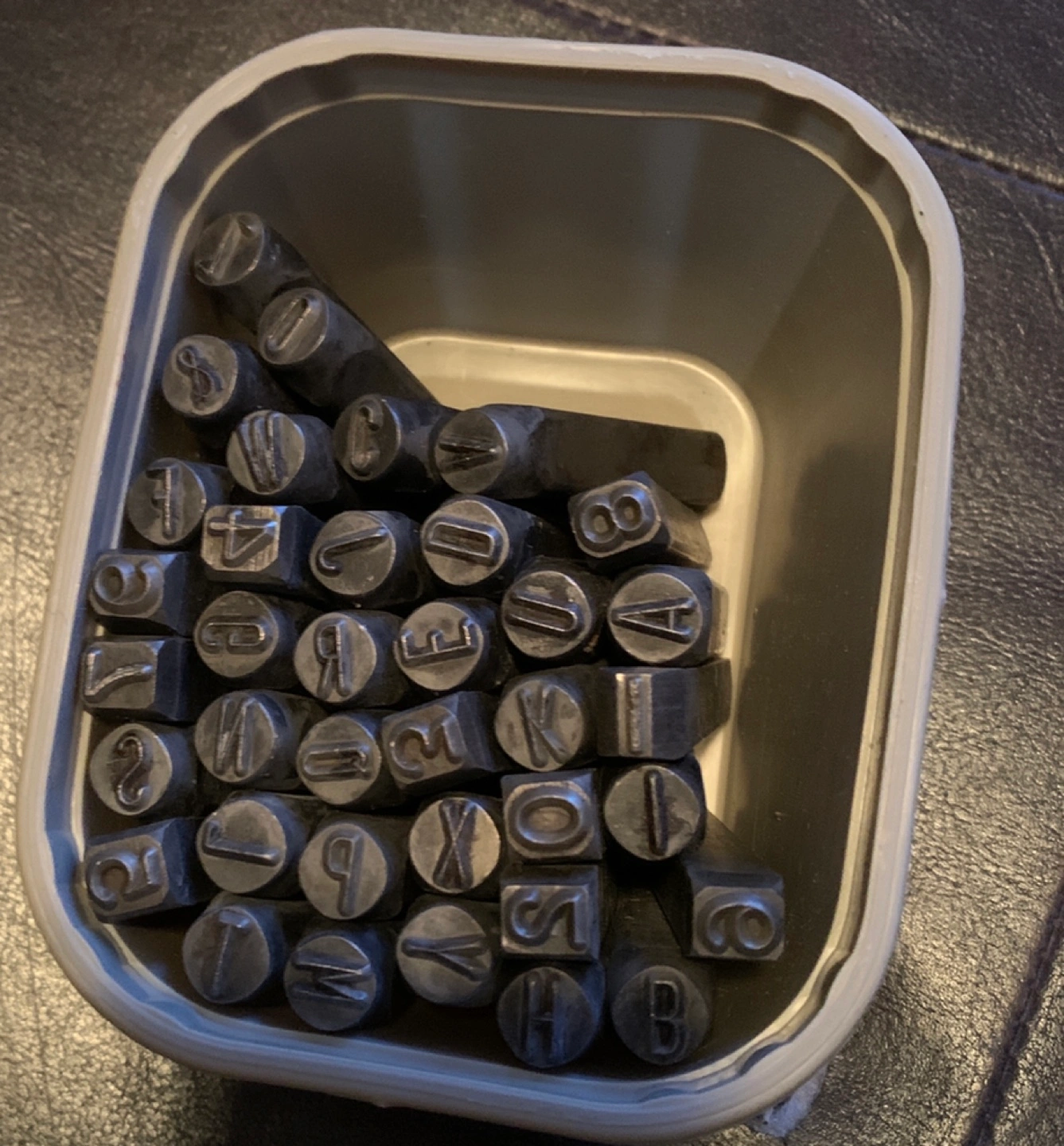 Assortment of metal letter and number stamps. Ideal for stamping metal, leather or other materials. Comes in a plastic container. Great for crafting and jewellery making.
