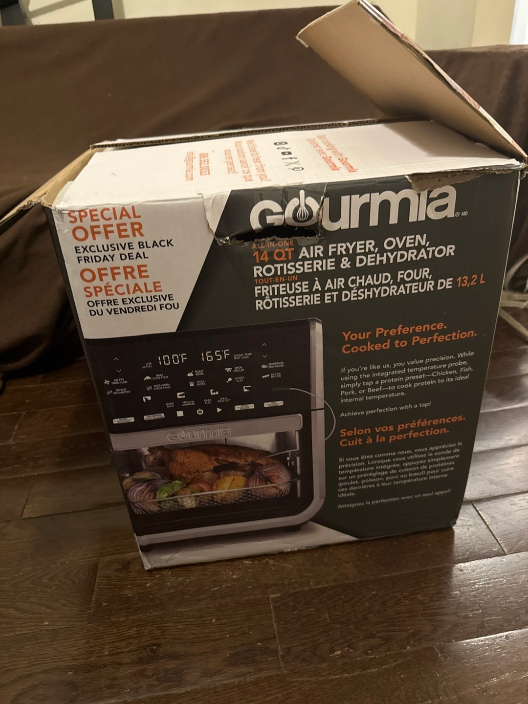 Brand new, still in box. All-in-one kitchen appliance. Air fryer, oven, rotisserie, and dehydrator functions. 13.2L capacity. Includes accessories.