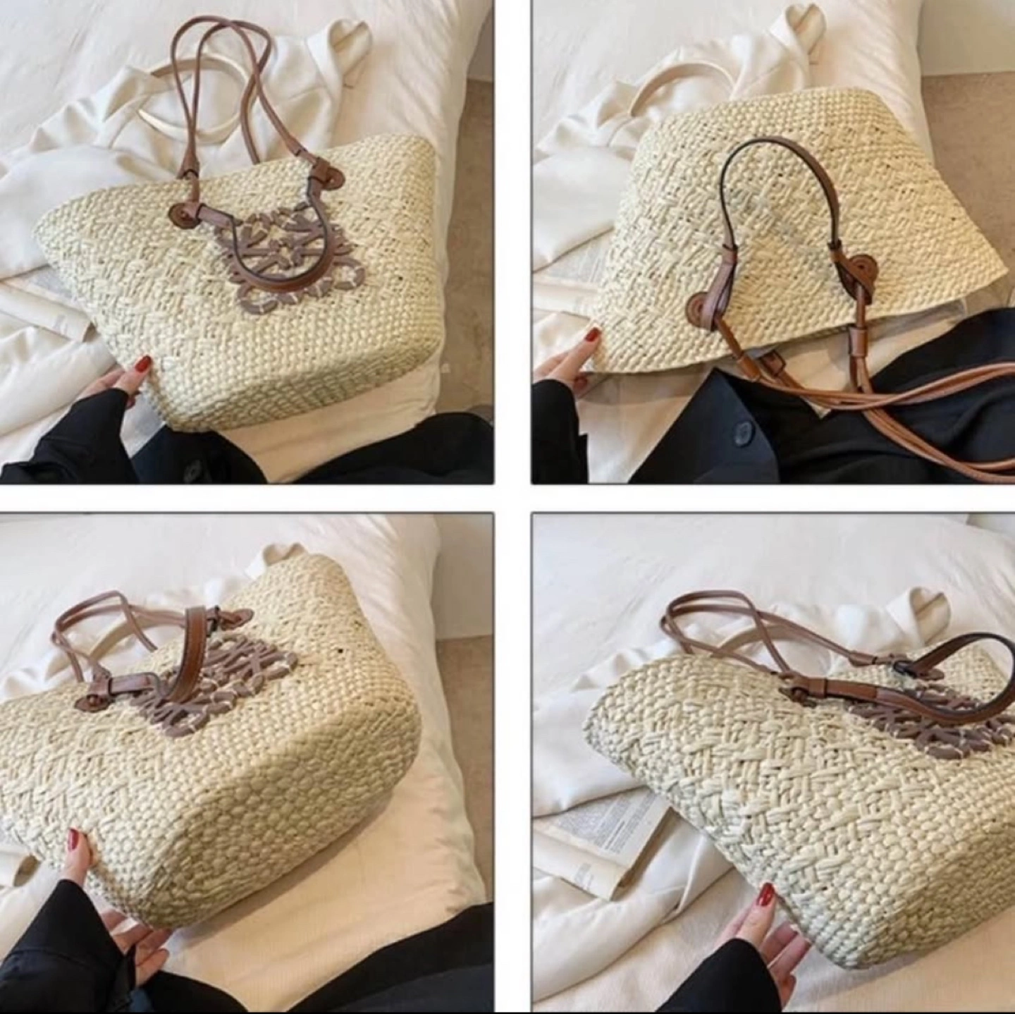 Large straw tote bag. Features woven straw construction and leather accents. Two top handles. Spacious interior. Perfect for summer.