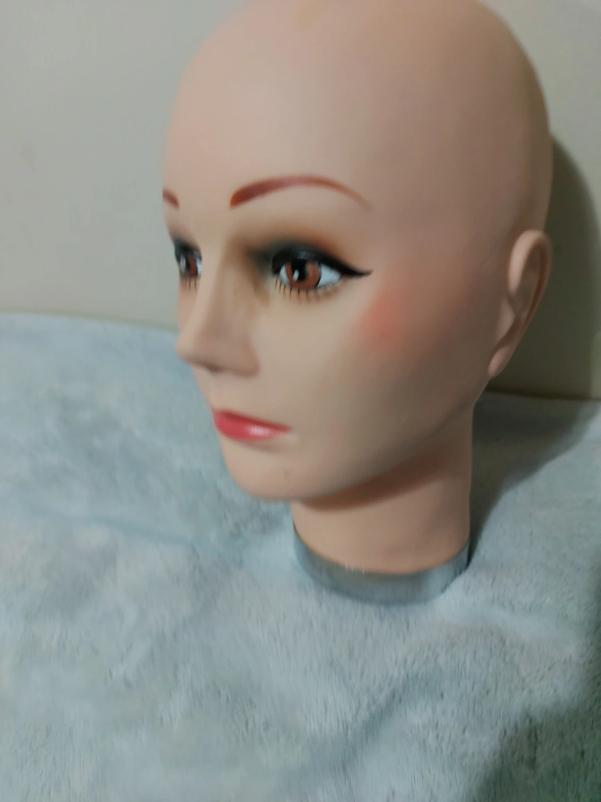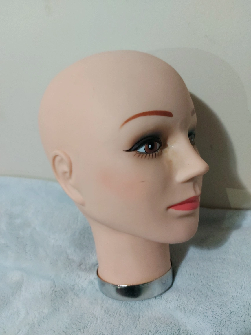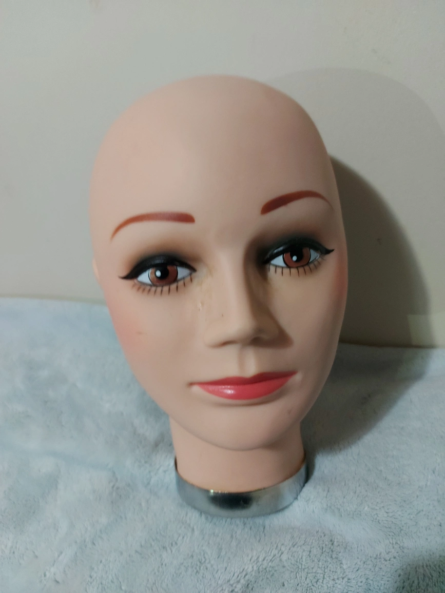 Female mannequin head. Bald, painted features. Metal base. Great for wig display or hair practice.