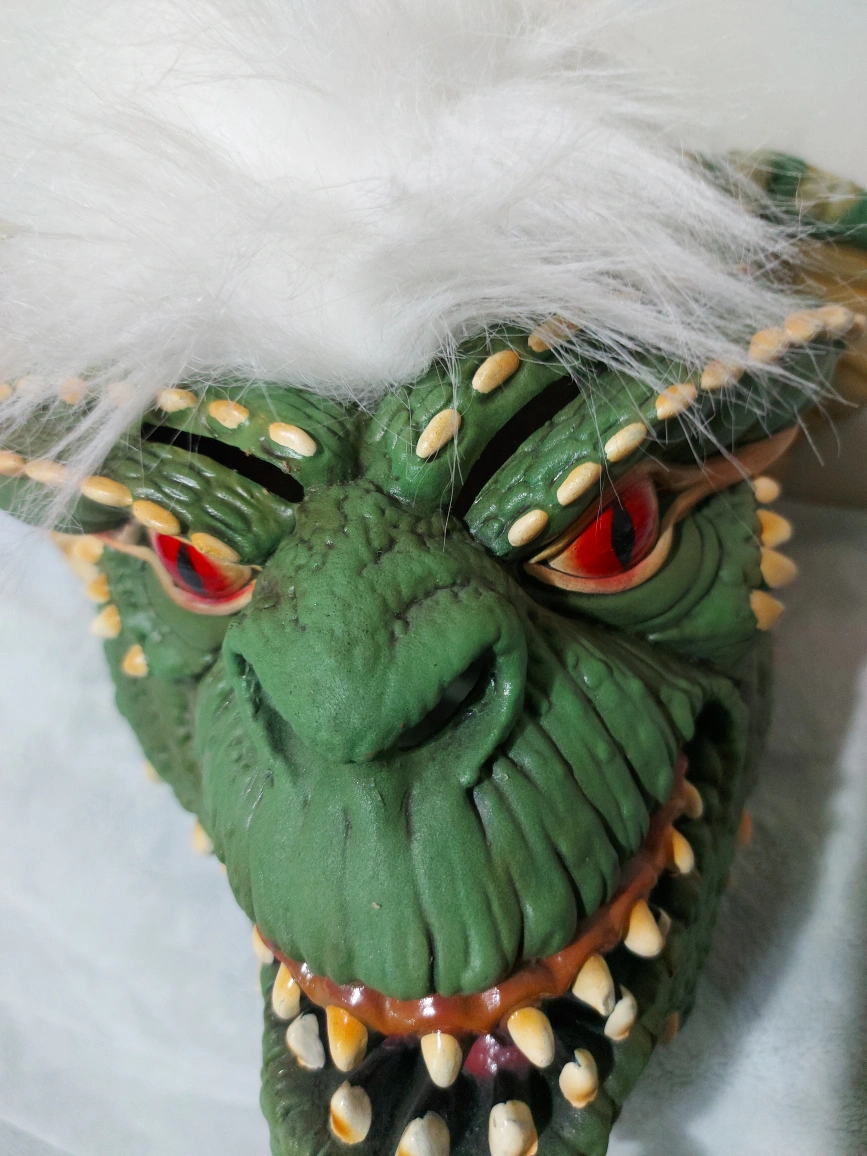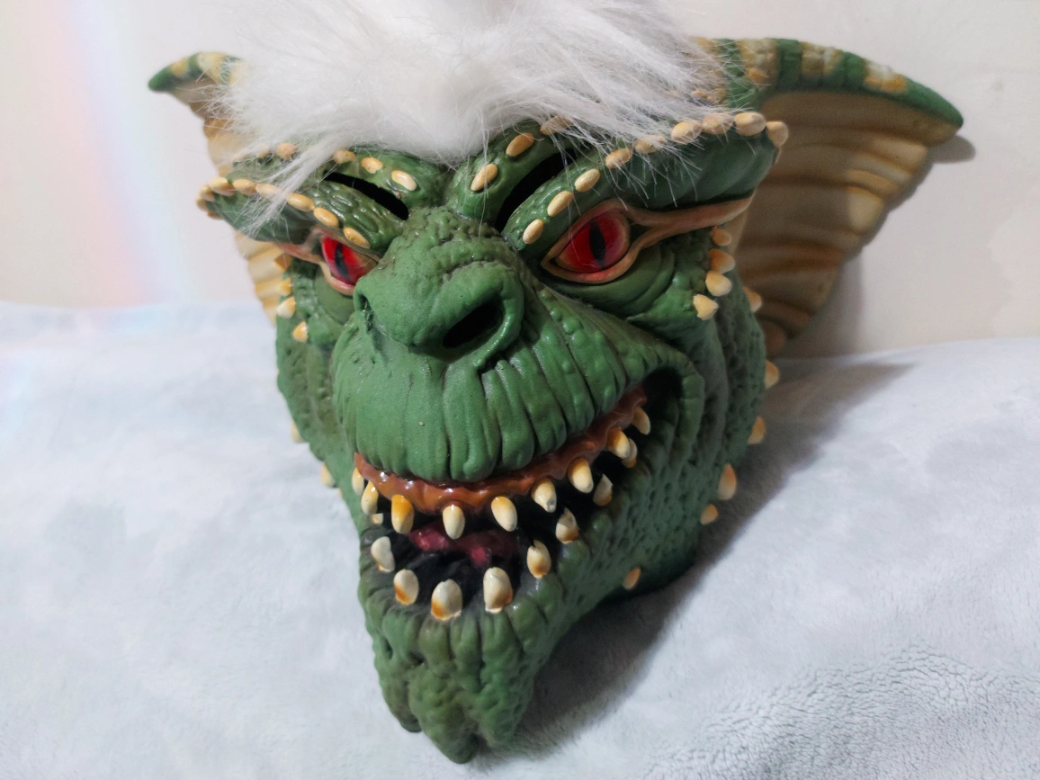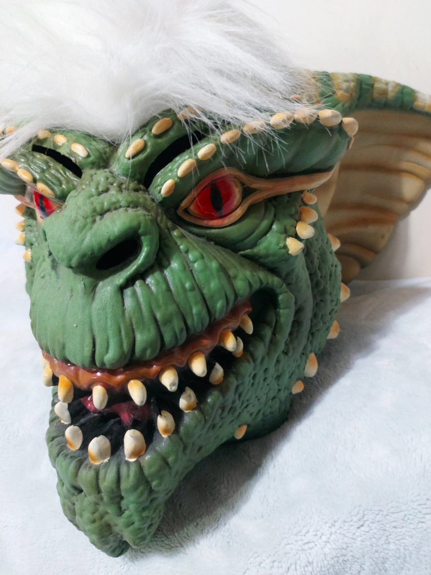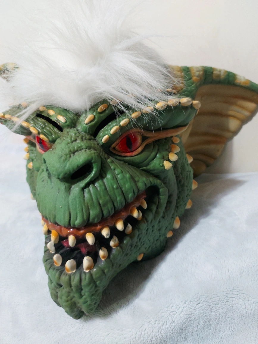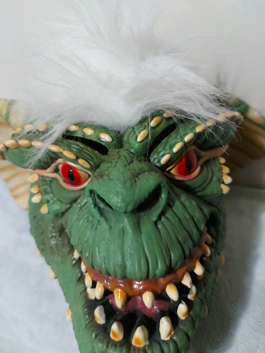 Vintage Gremlin mask. Green rubber with white fur. Red eyes. Great for Halloween.