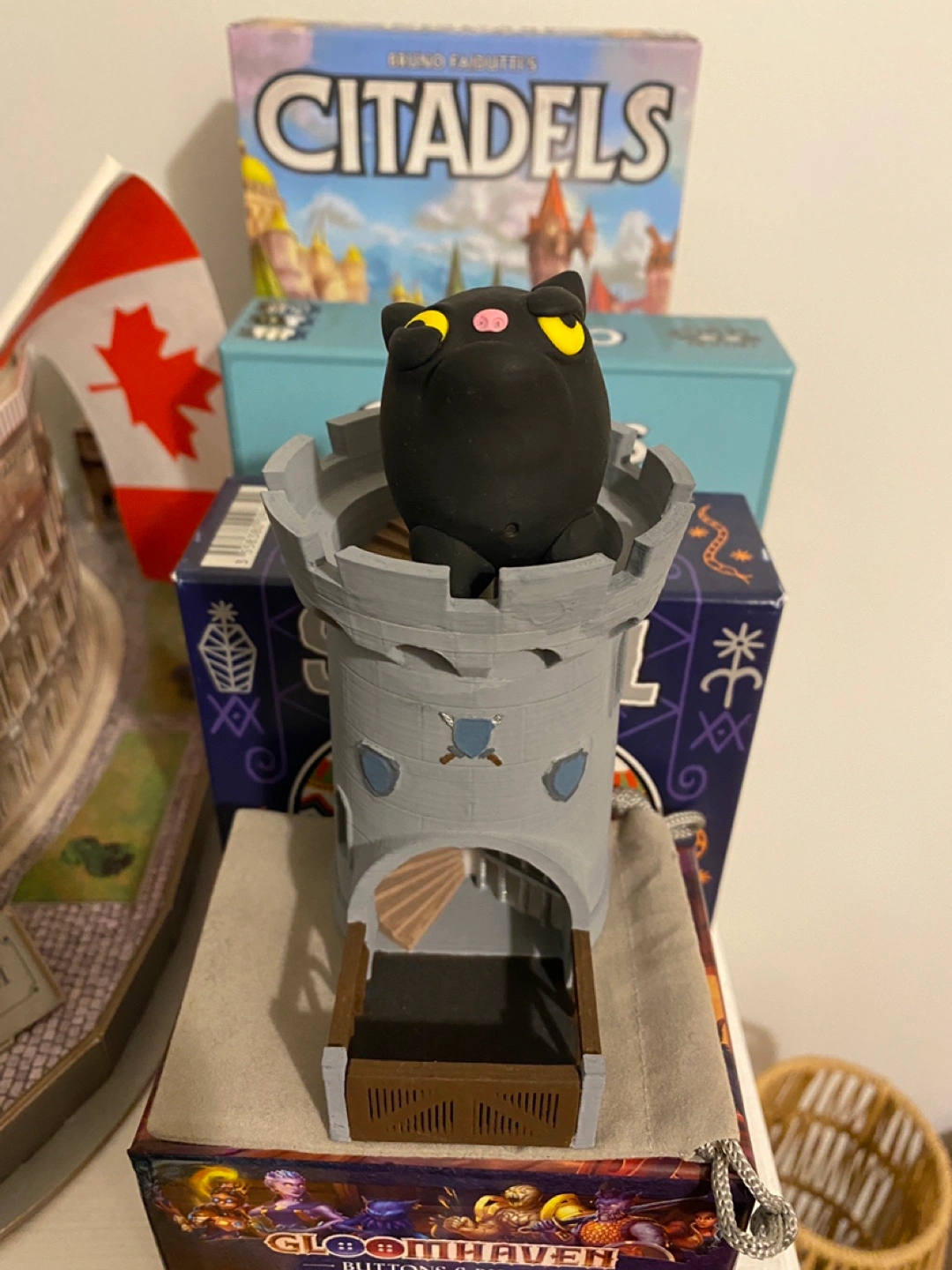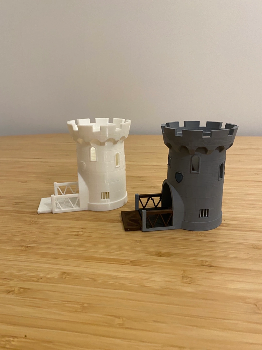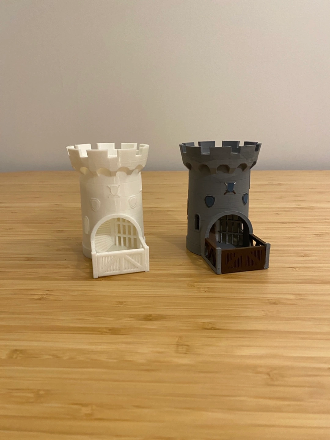 48I got two but only need one. Selling the new unpainted one for $10. It's a dice tower that has a small bridge gate that can open for dice to roll out on the table or to keep closed and let the dice stop inside the bridge. Dice are fed in from the top of the castle like any other dice tower.