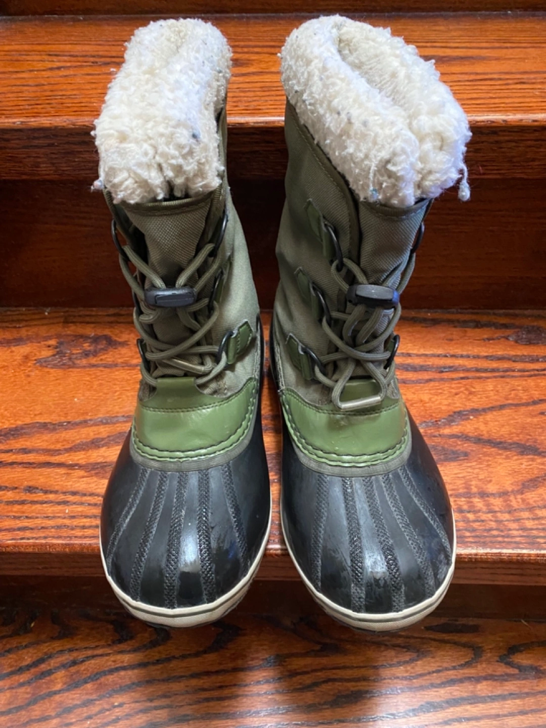 496Green and black waterproof winter boots. Lace-up style with faux fur lining. Great for snow. Pre-owned. Cash Only