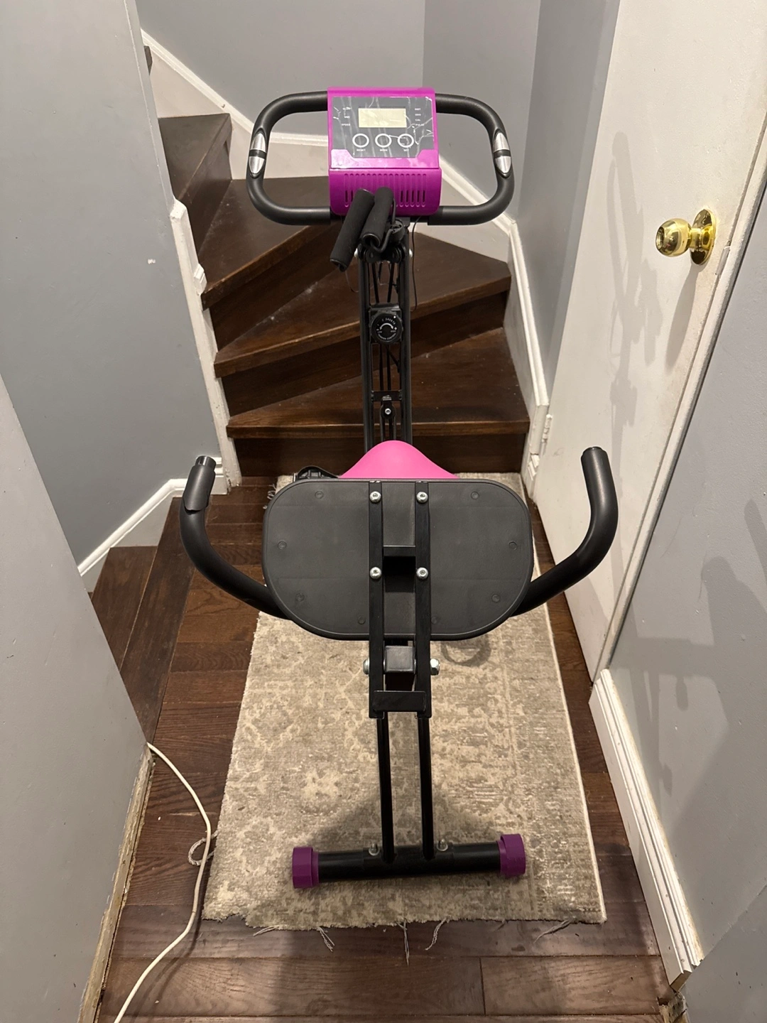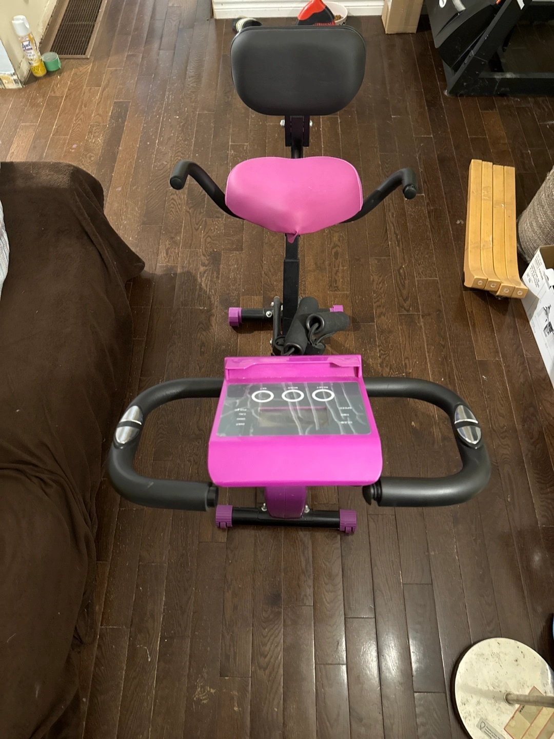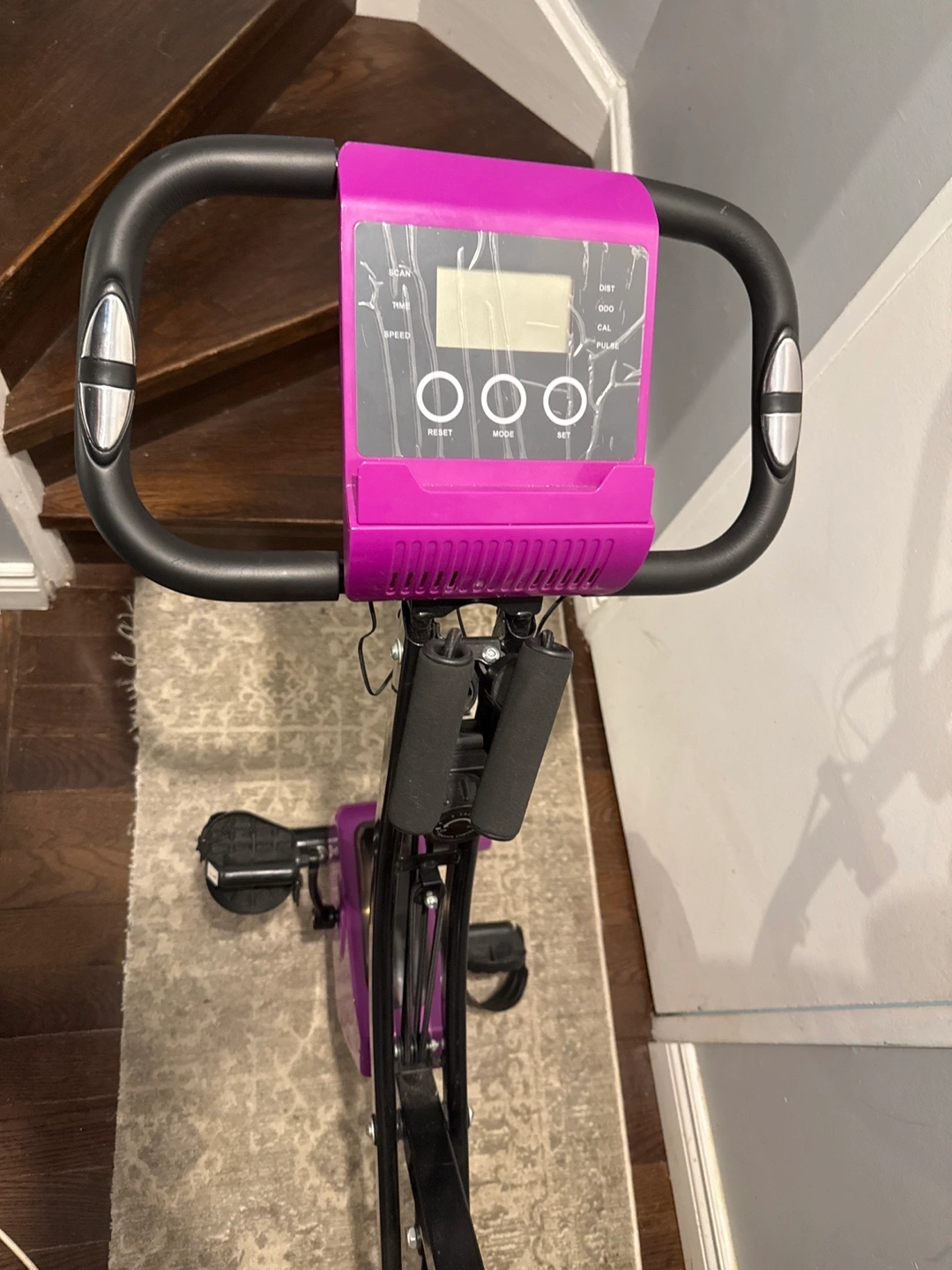 BRAND NEW NEVER USED!! Recumbent exercise bike. Purple and black. Features adjustable resistance, monitor, and arm resistance bands. Compact design.