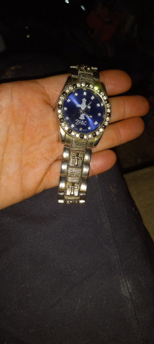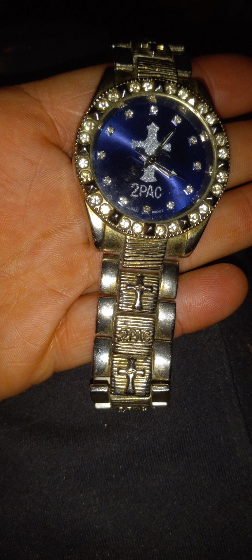 1000+2PAC branded wristwatch. no box Features a blue face, silver band, and crystal accents. Japan movement, made in China. Stainless steel.