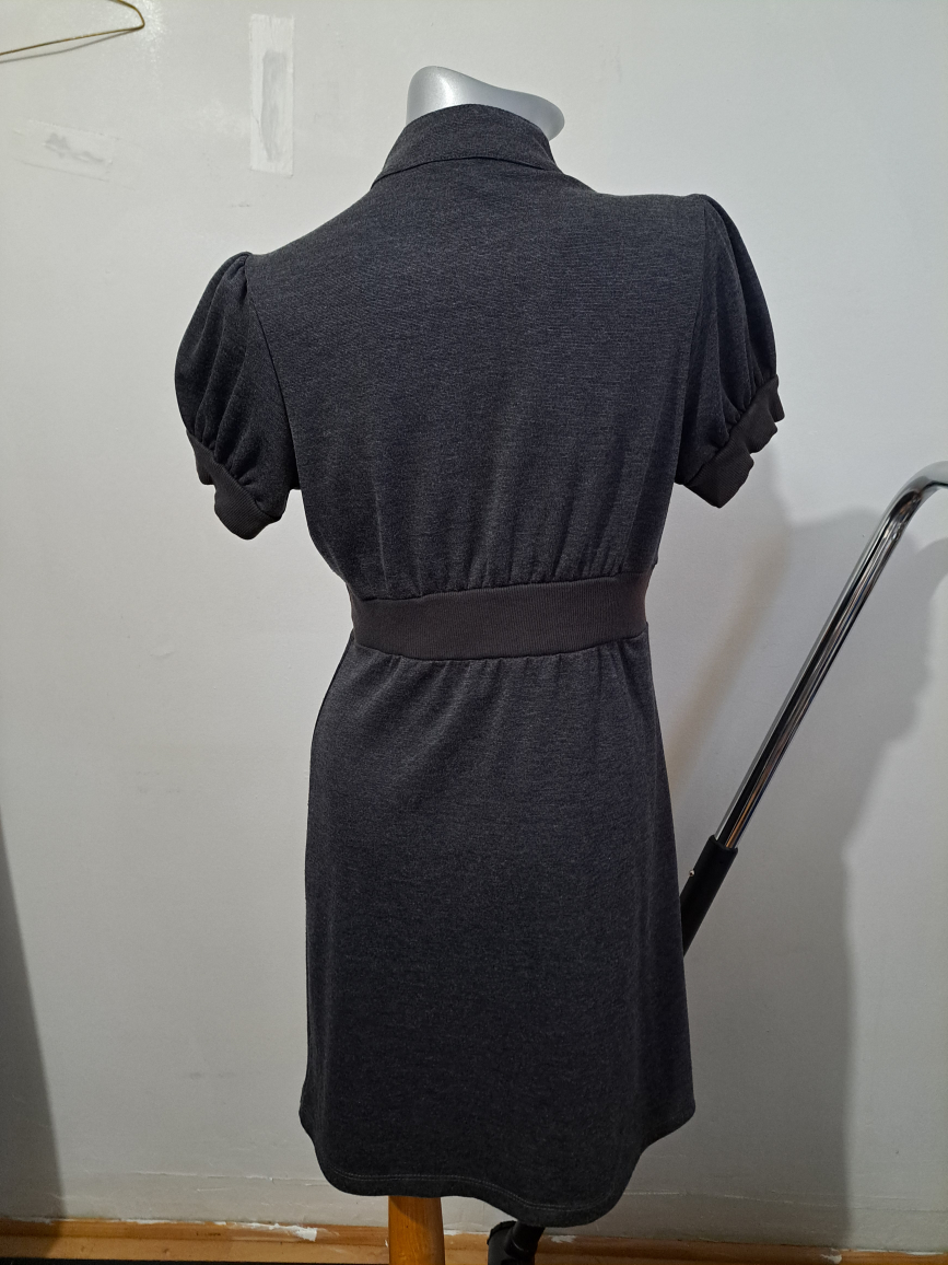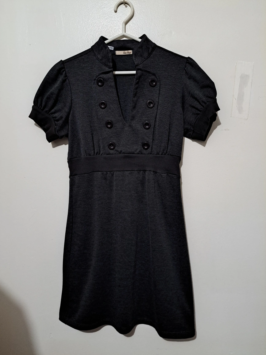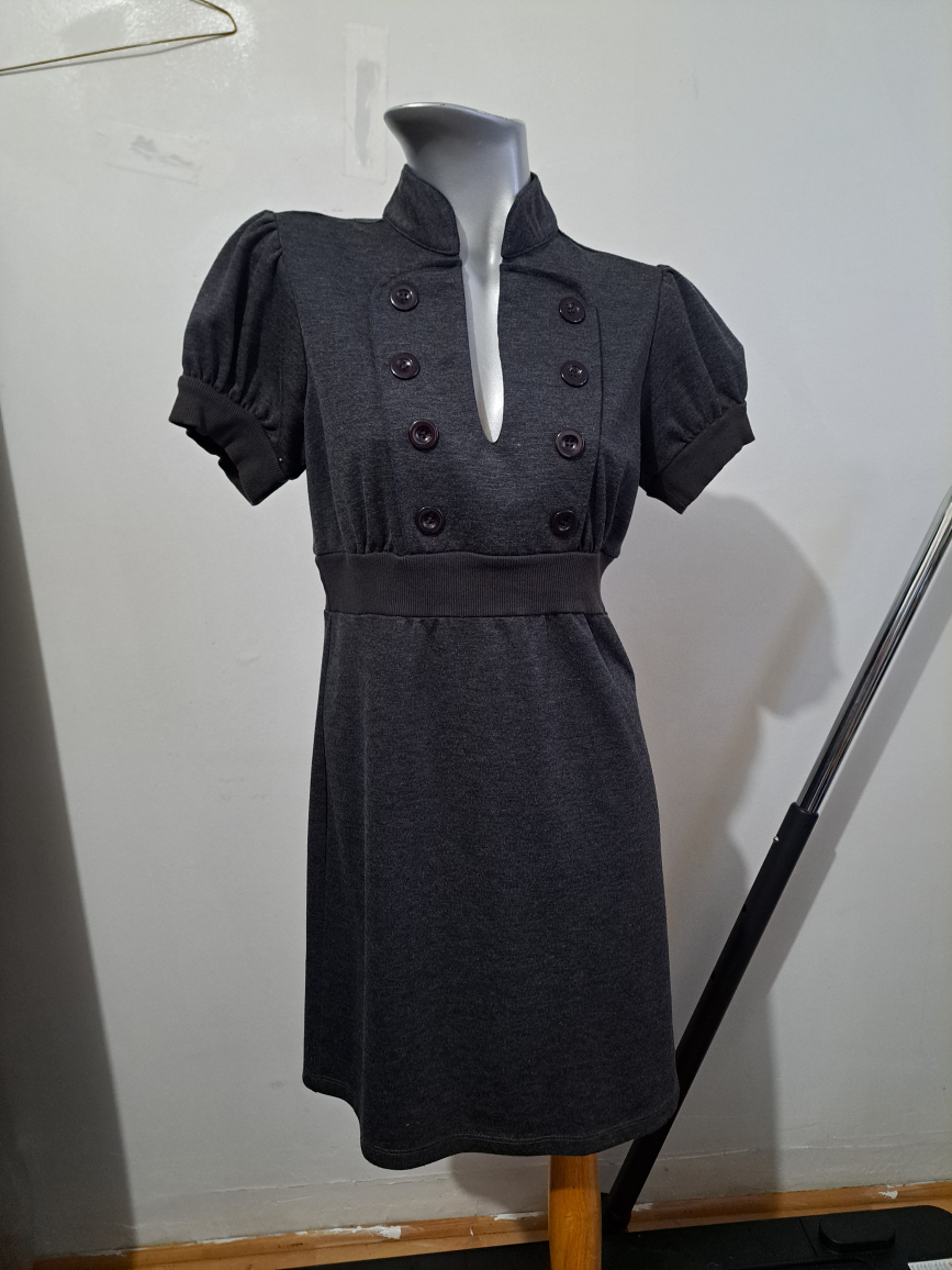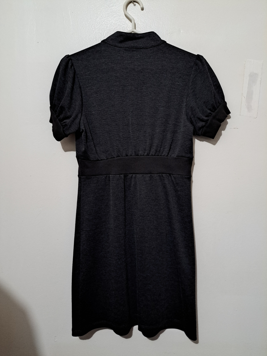 Cute dark grey mini dress. Features short puff sleeves, a v-neck, and button detailing. Relaxed fit.