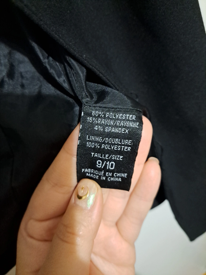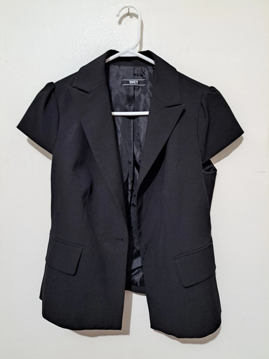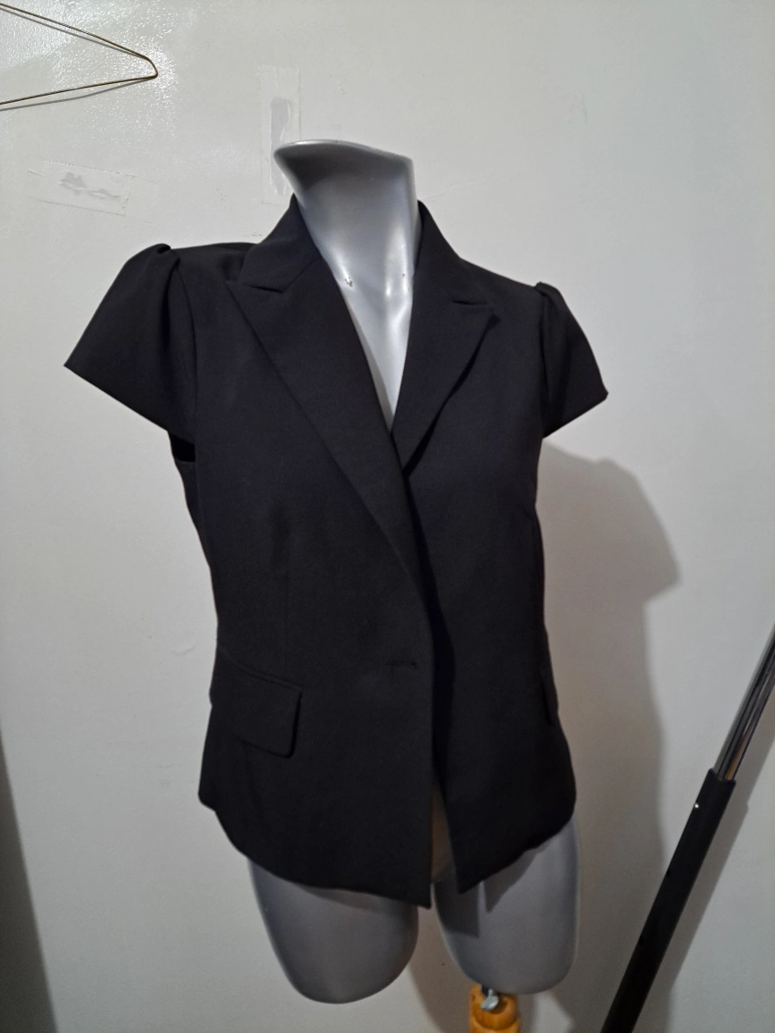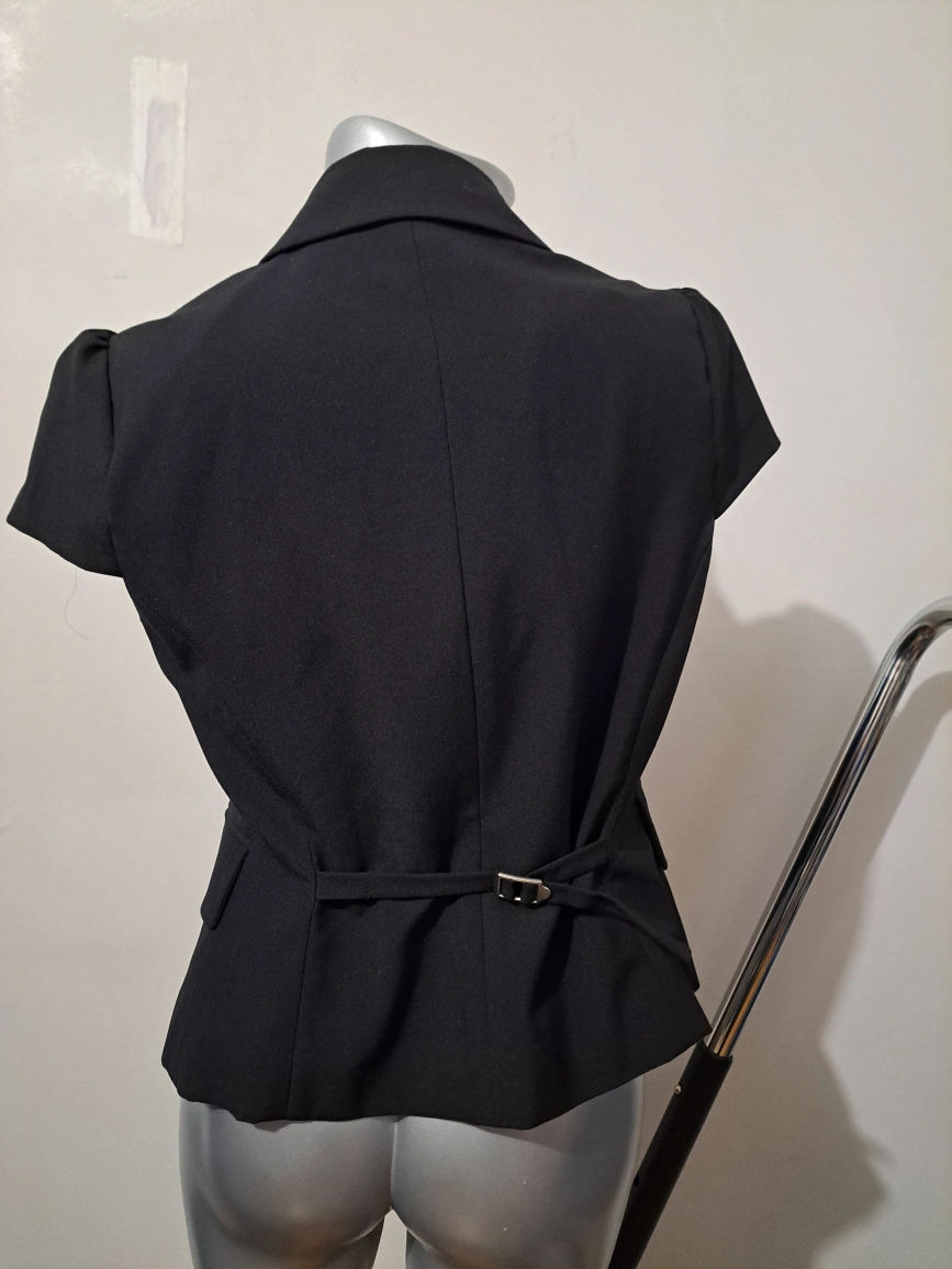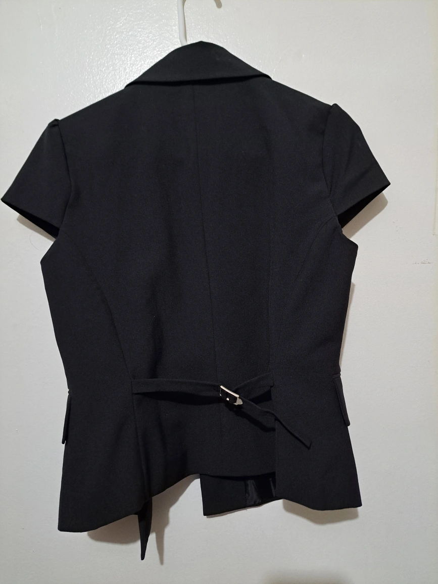 Women's black short sleeve blazer. Size 9/10. Features a back belt with buckle in the back.
