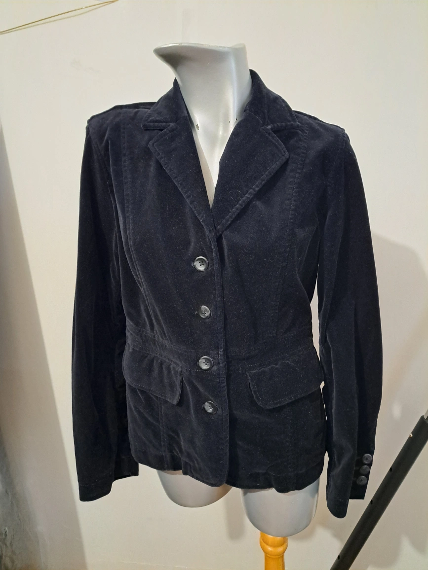 Women's black blazer. Three button closure. Long sleeves. Feels like corduroy, but is a cotton- spandex blend. Size 4.