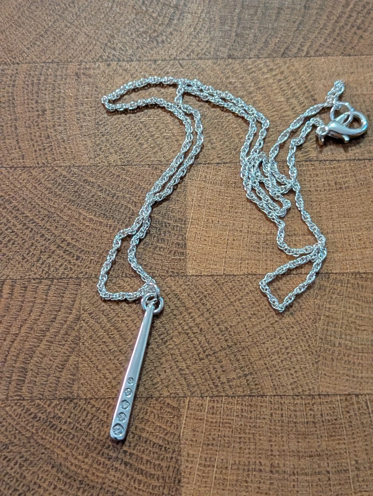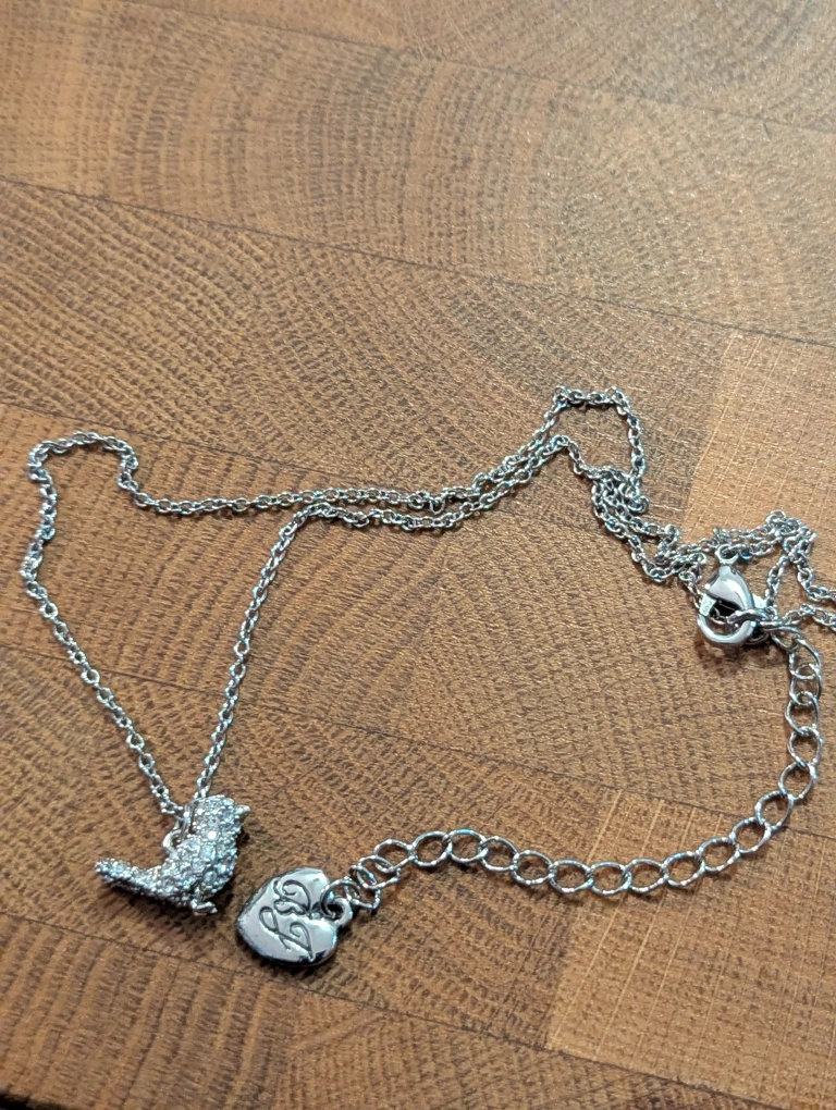 Silver-tone necklace features a sparkly bird charm and a heart charm. Delicate chain. Great for layering.
