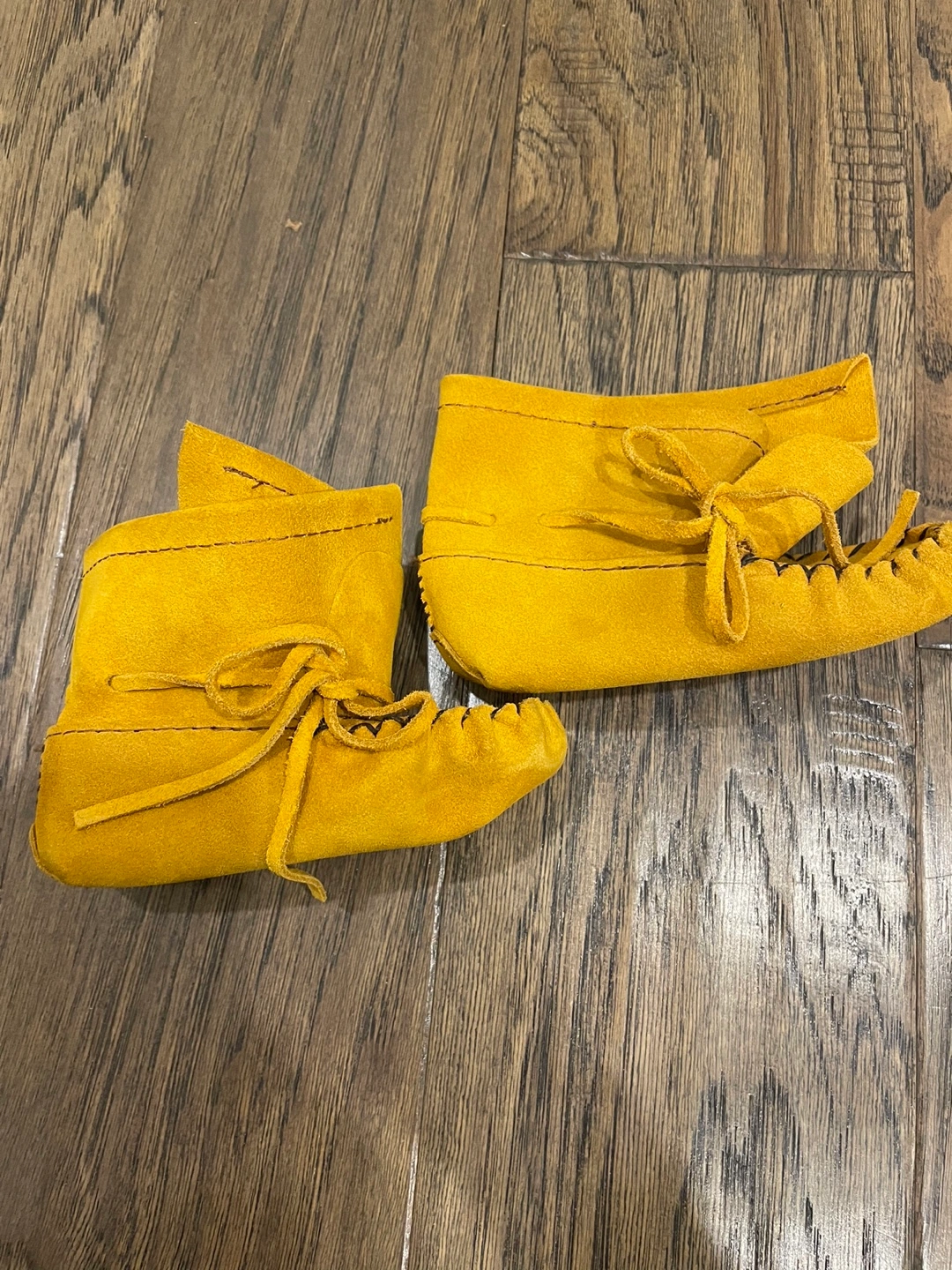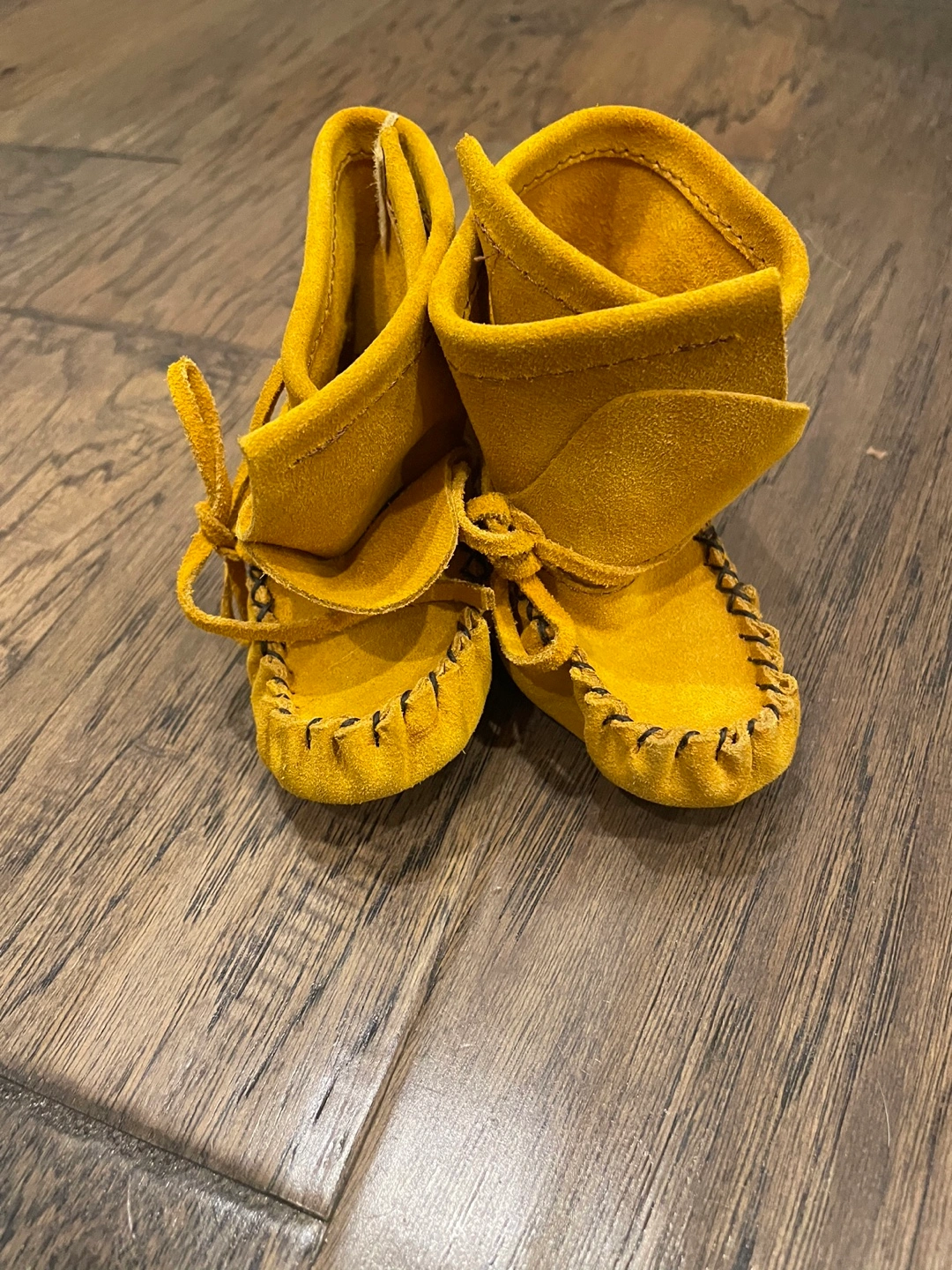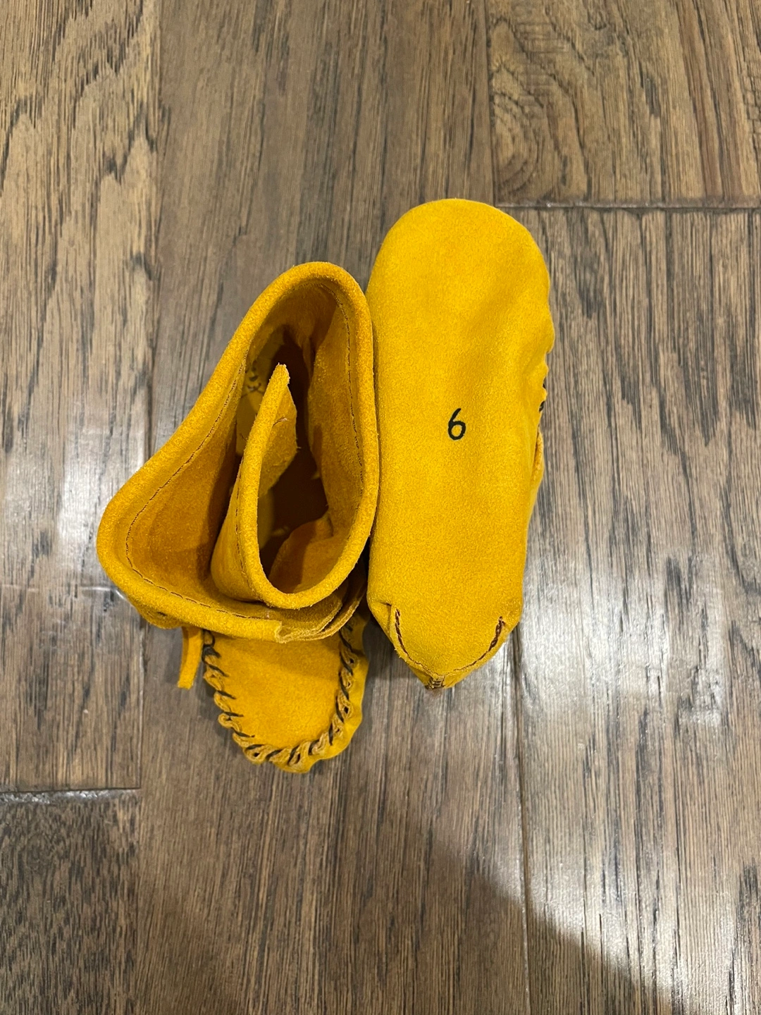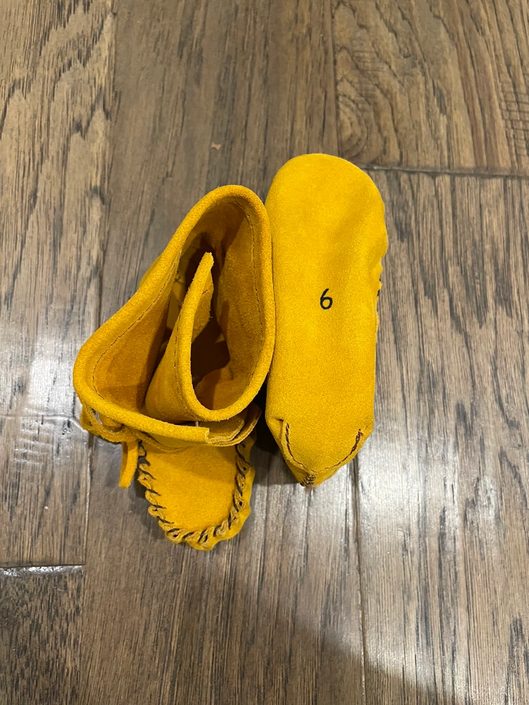Adorable mustard yellow baby moccasins. Size 6. Soft suede leather. Handcrafted style. Perfect for a little one.