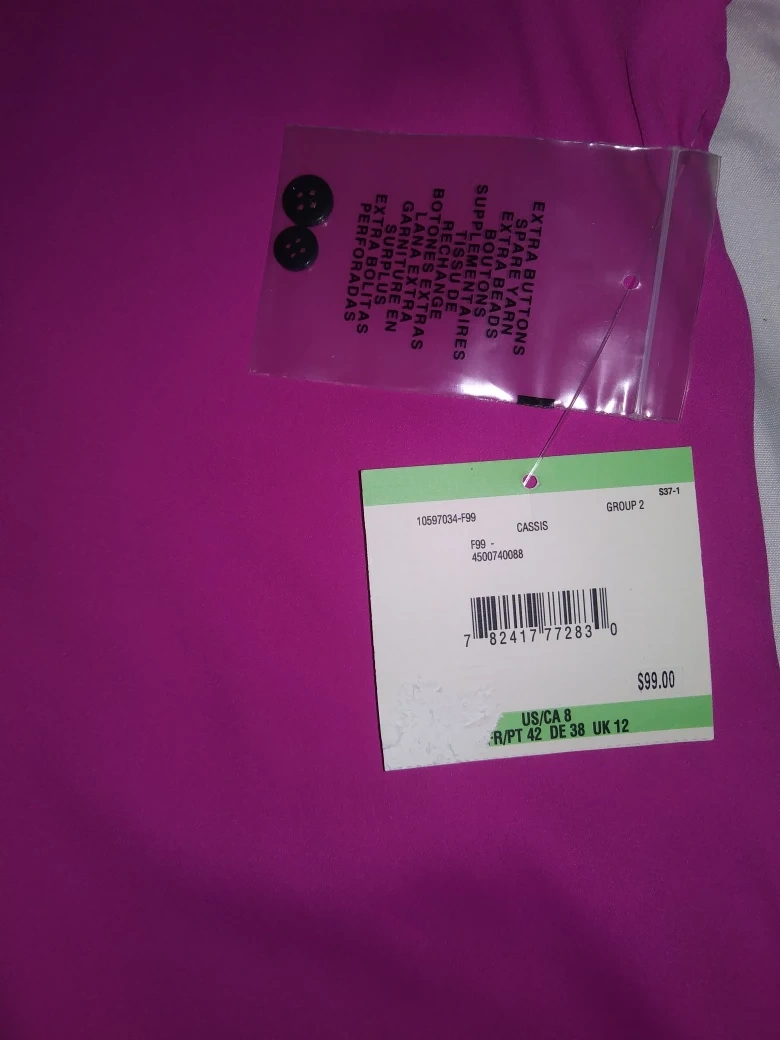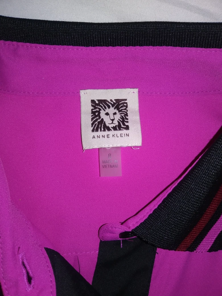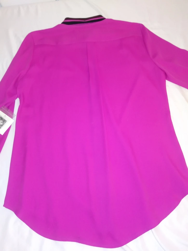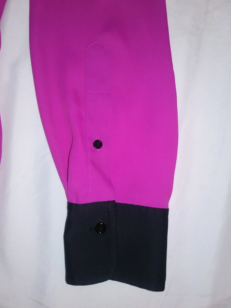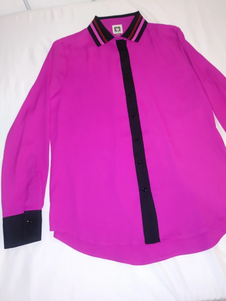Women's long-sleeve button-down blouse. Size 8. Bright pink with black collar and cuffs. Made in Vietnam.100% polyester