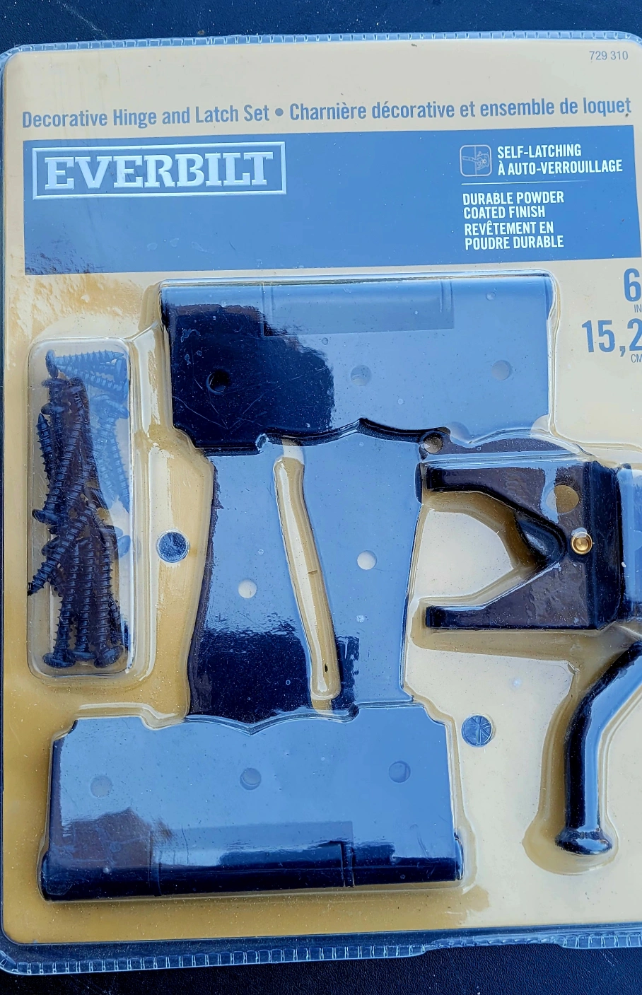 New in package. Black powder-coated finish. Self-latching. Includes screws. Ideal for outdoor gates or shed doors. 6 inch.