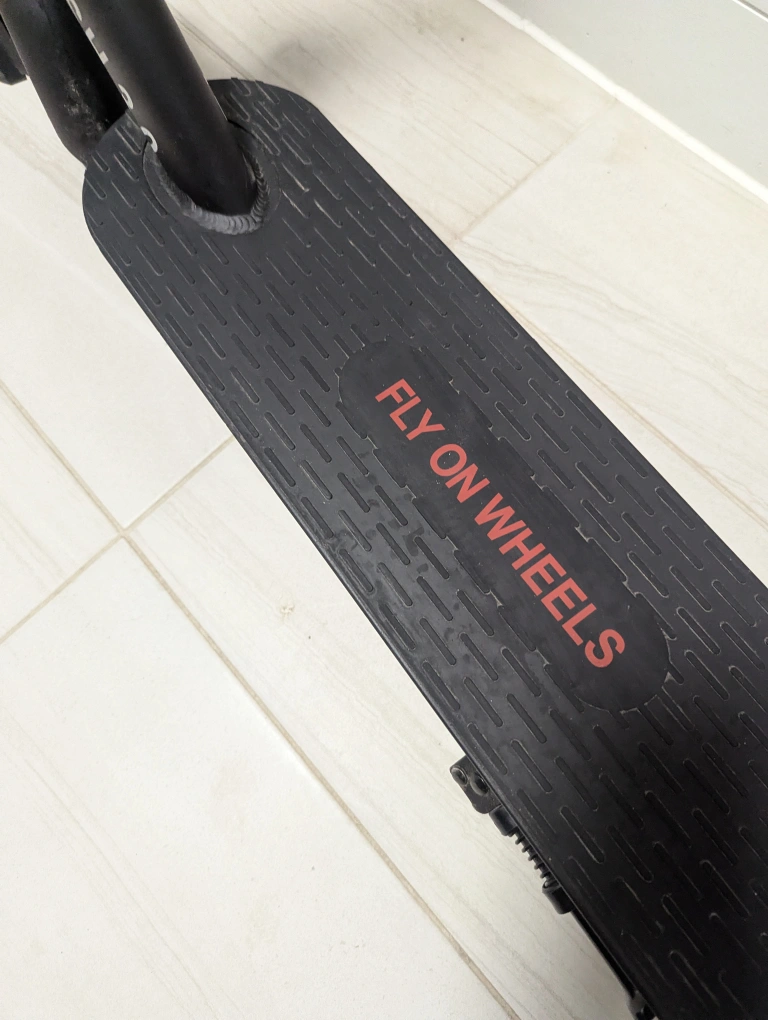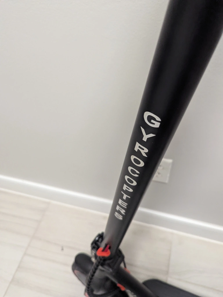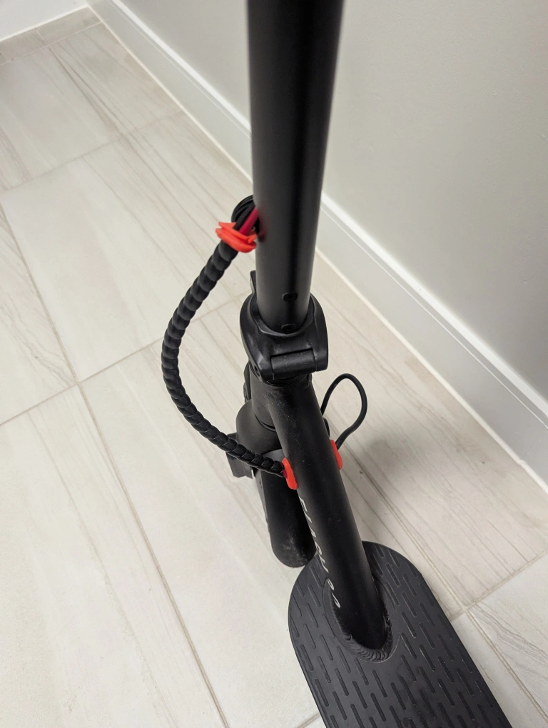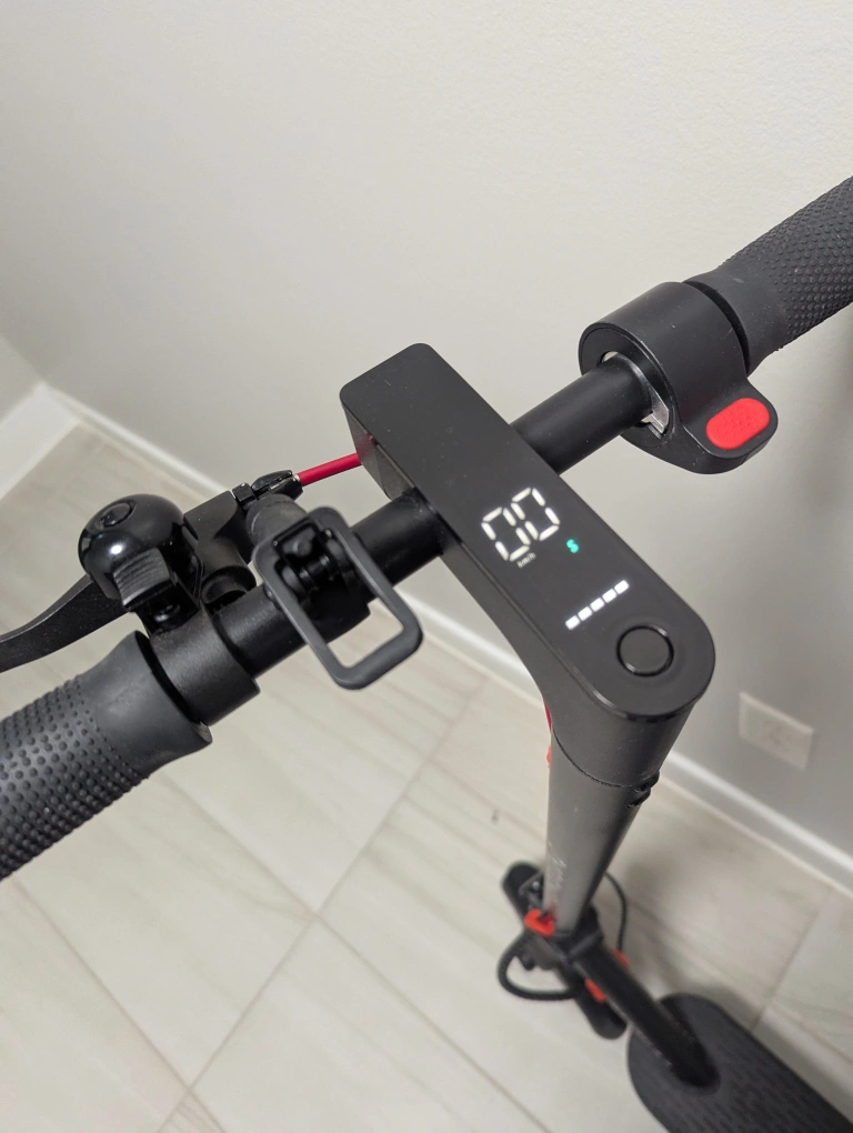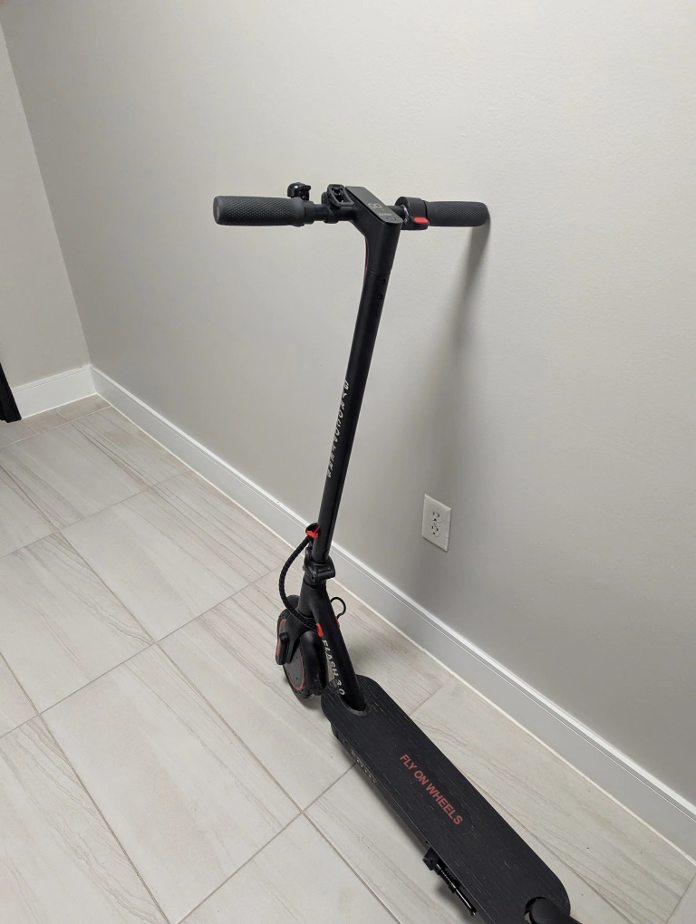 Foldable electric scooter. Black with red accents. Features a digital display and hand brakes. Good condition. With Charger included