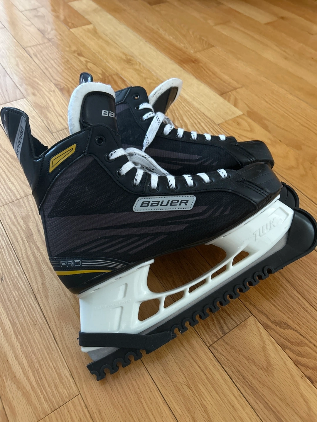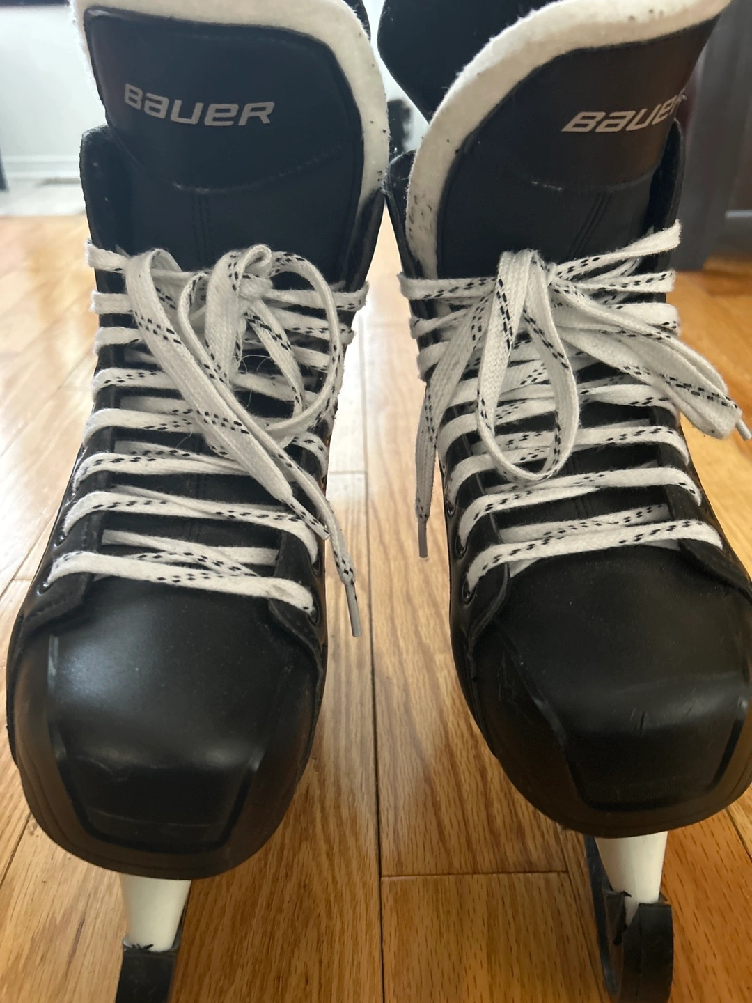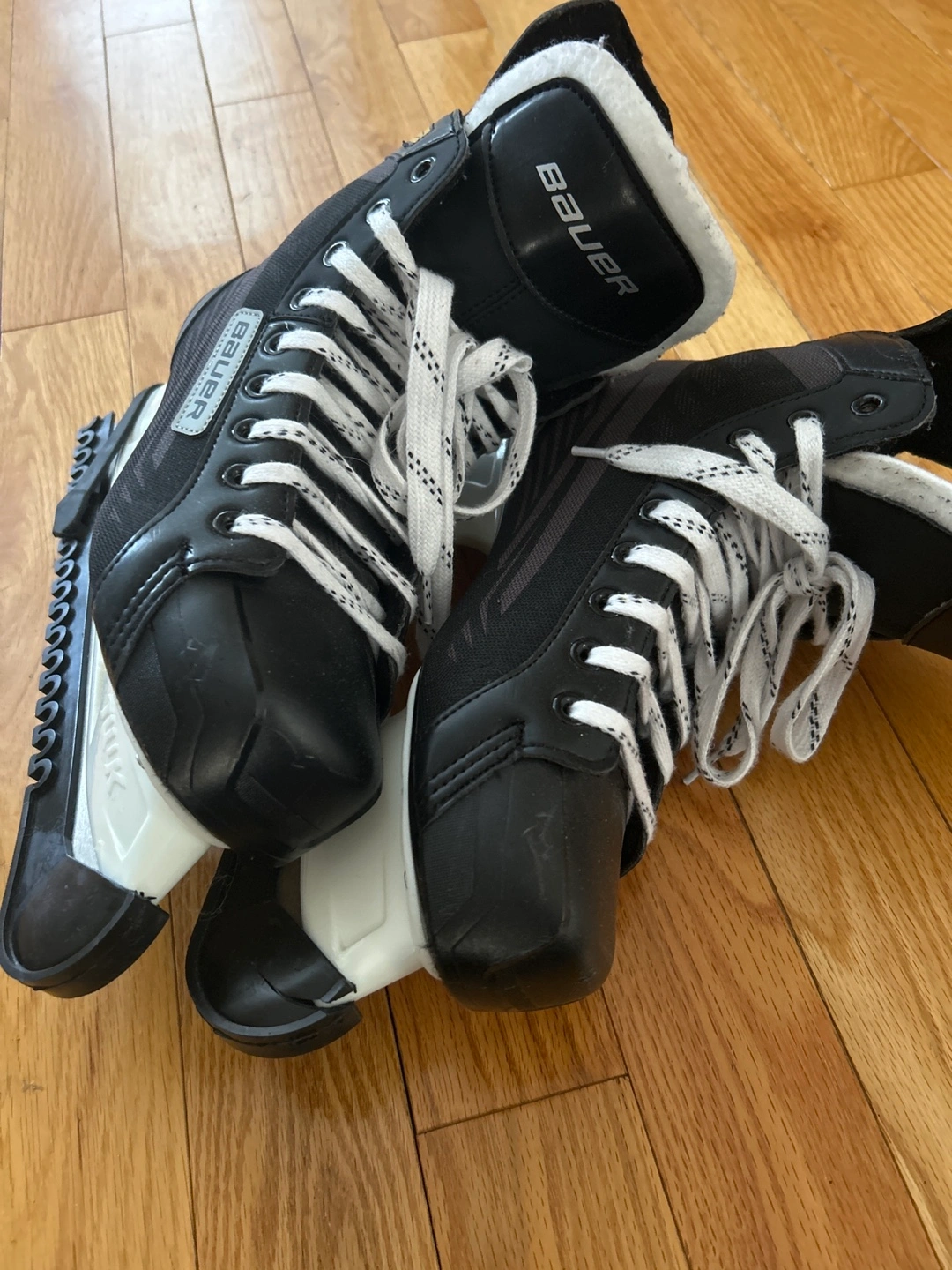 35Used Bauer mens hockey skates size 11.5. Black with white laces. Good condition. Includes skate guards.