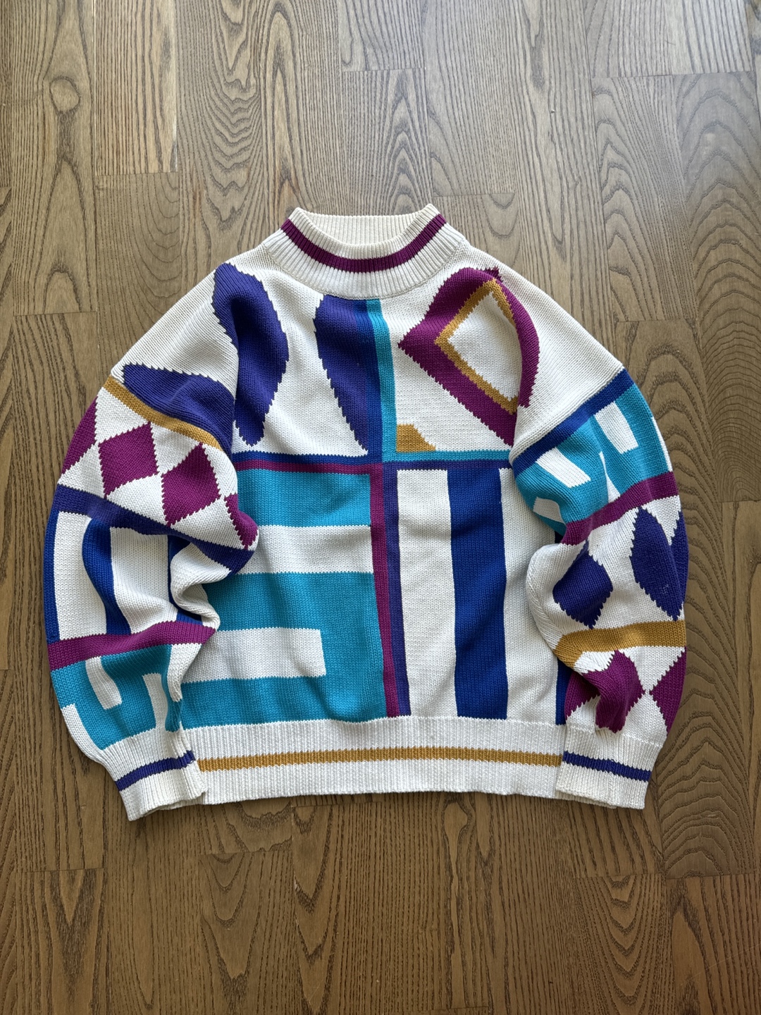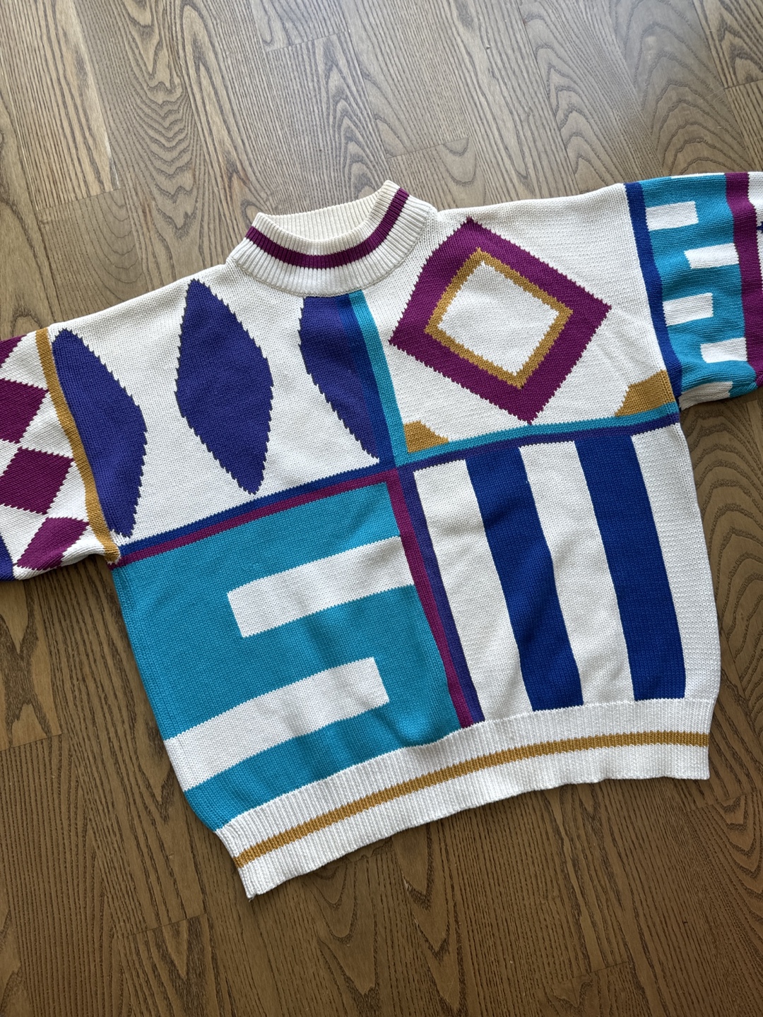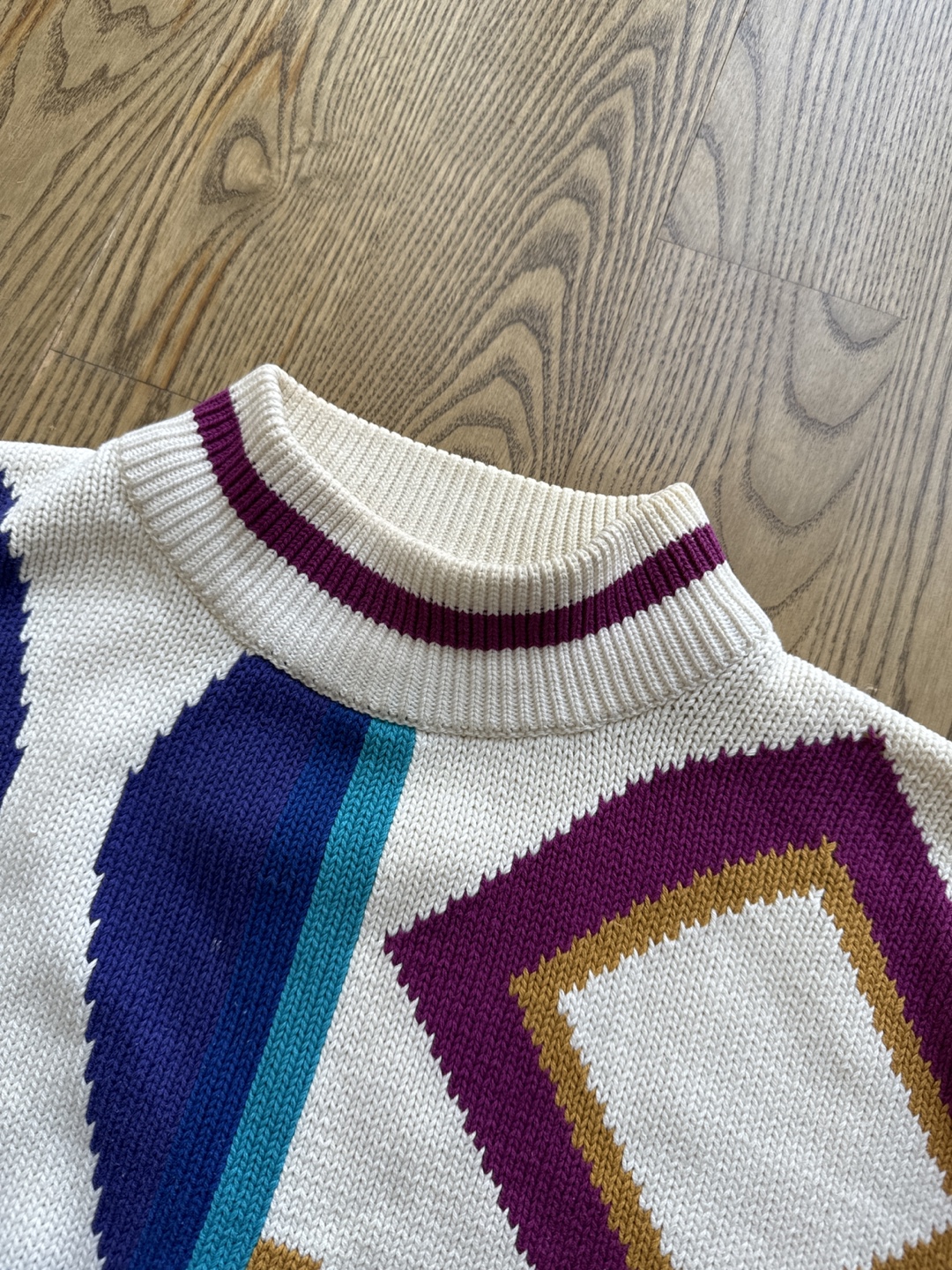 Colourful geometric patterned knit sweater. Cream base with teal, purple, and gold accents. Crew neck. Long sleeves. Loose fit. Excellent condition.