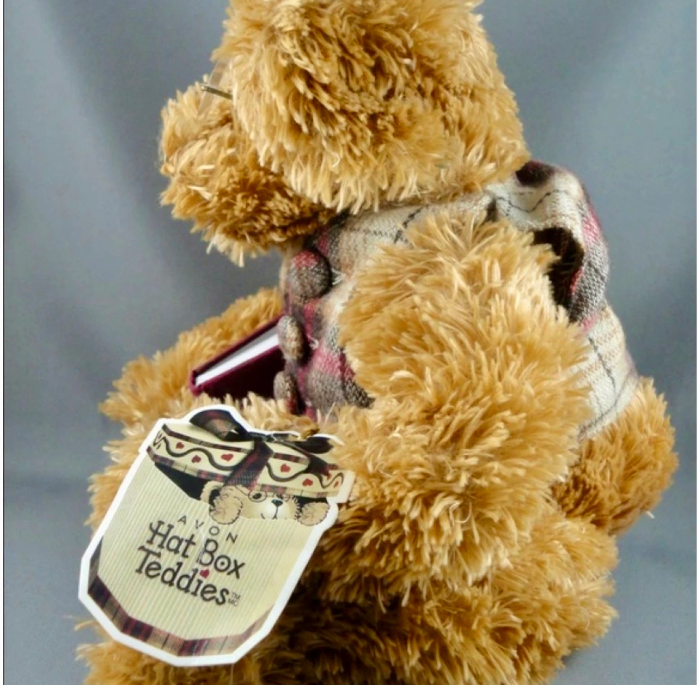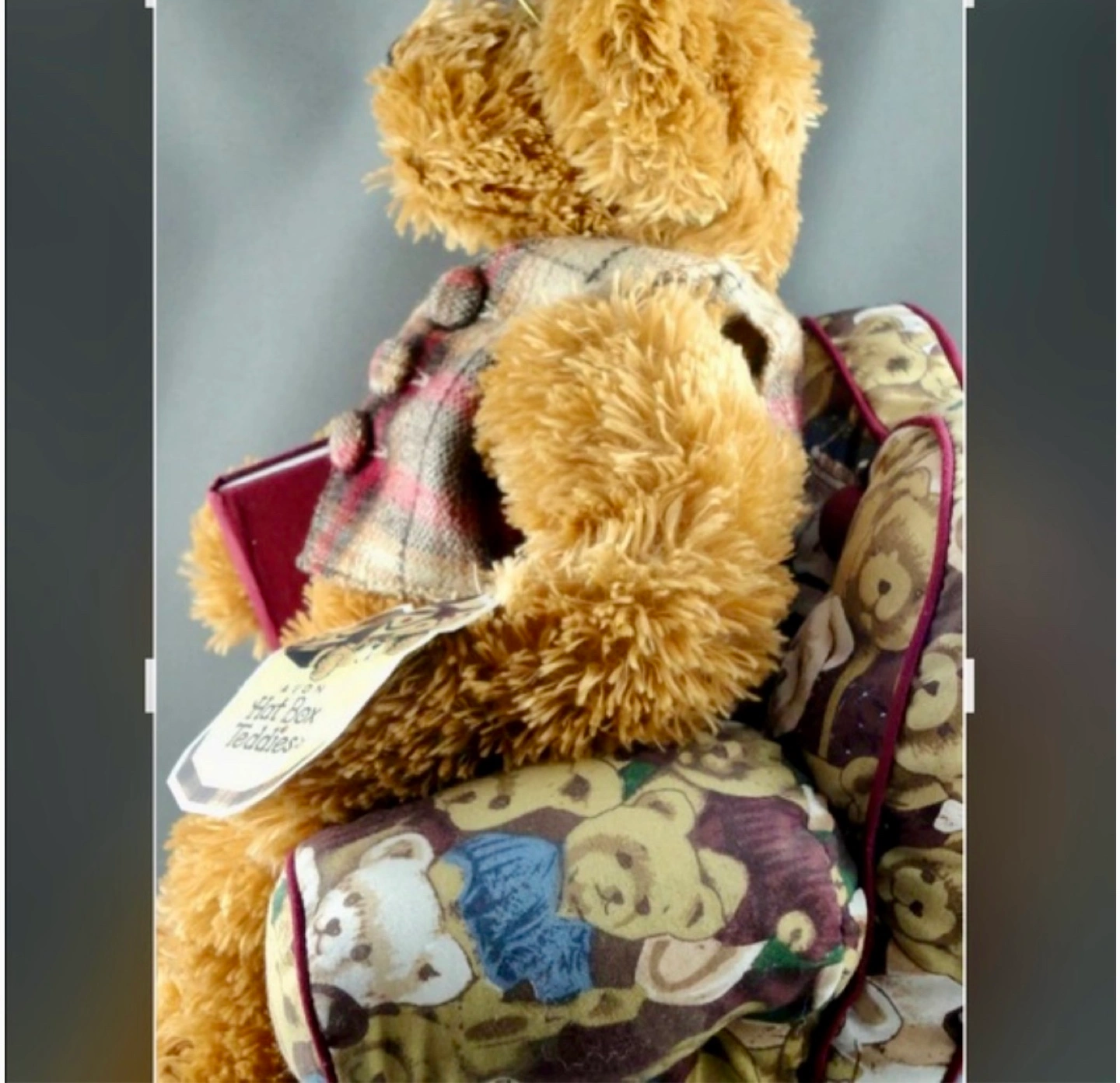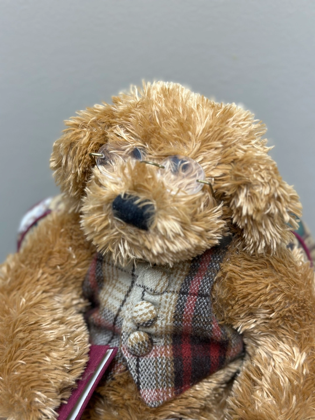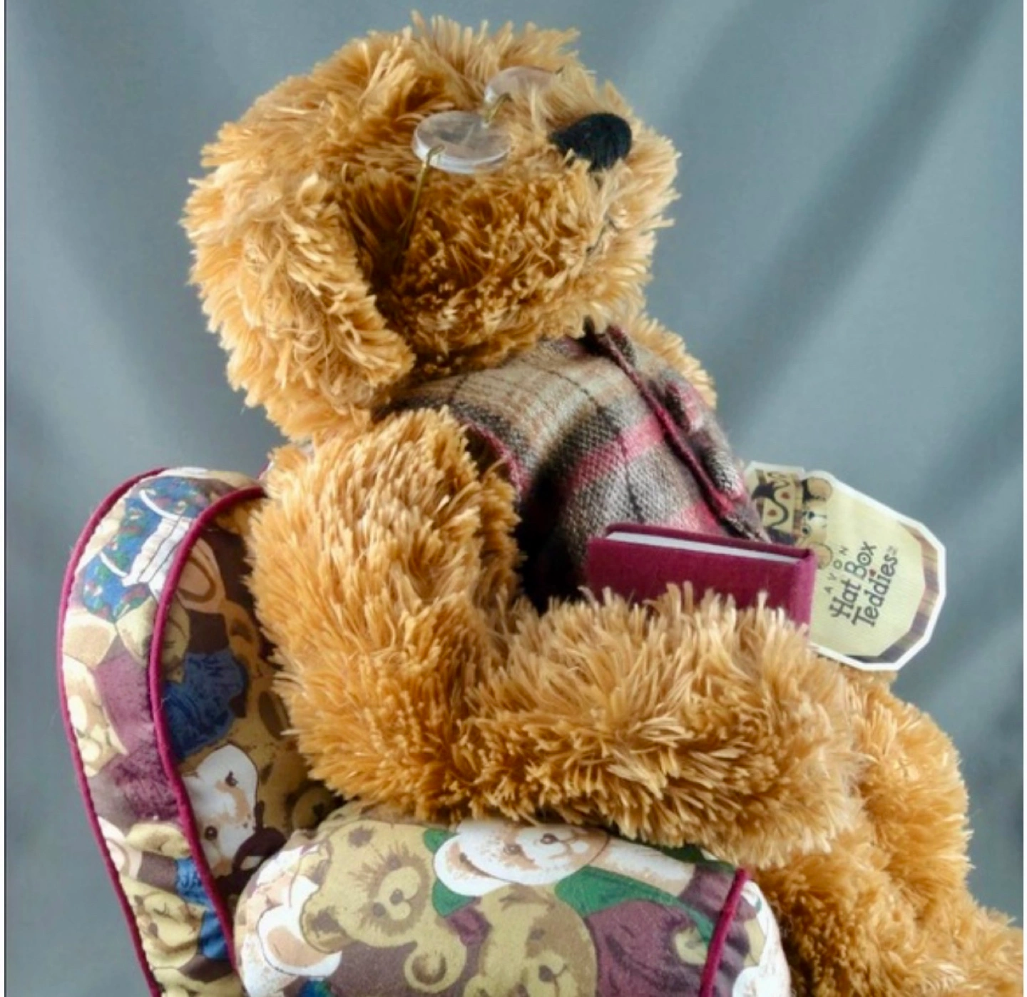A Harrods Teddy Bear sitting in a small, overstuffed armchair. The bear is wearing a plaid vest and glasses and is holding a small book. The chair has a teddy bear fabric. The chair is about 10 inches tall.