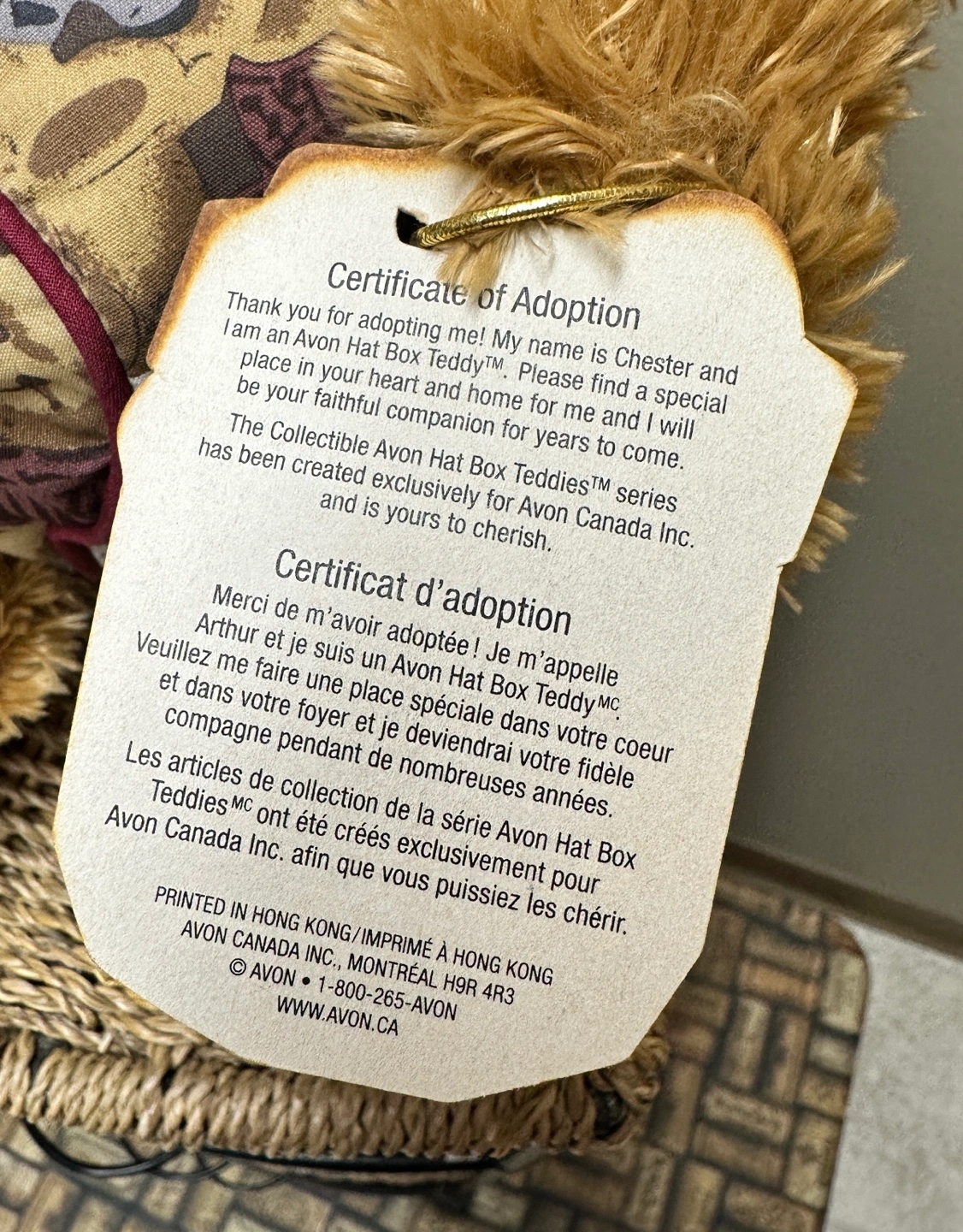 A Harrods Teddy Bear sitting in a small, overstuffed chair