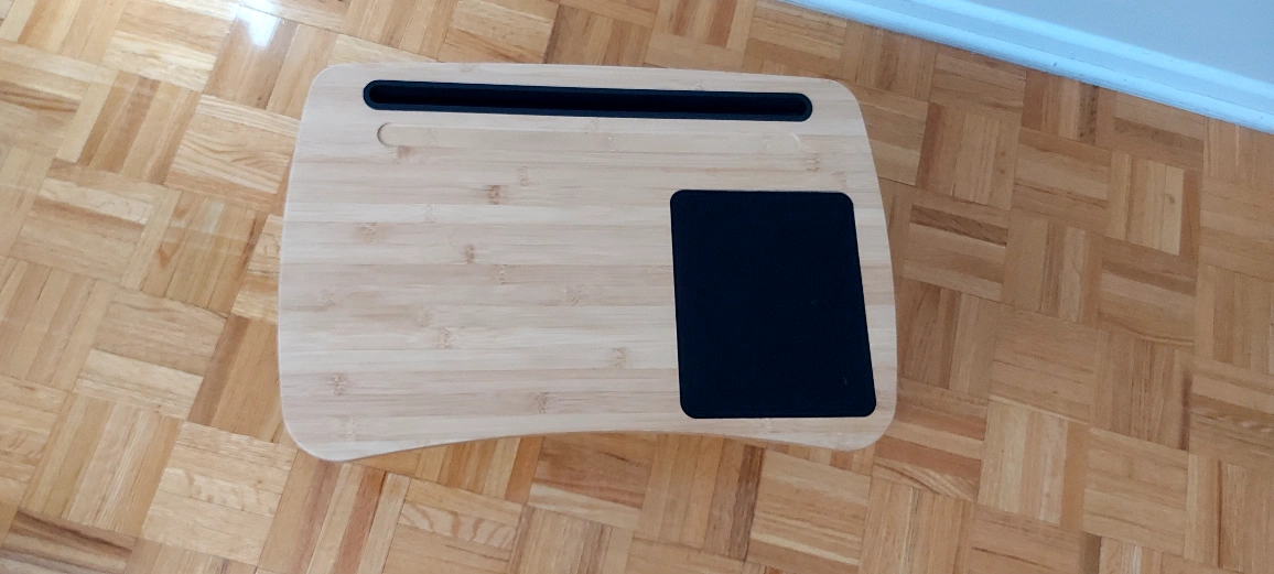 Portable bamboo laptop table. Features a phone/tablet holder and a convenient storage slot. Perfect for working from home or on the go.