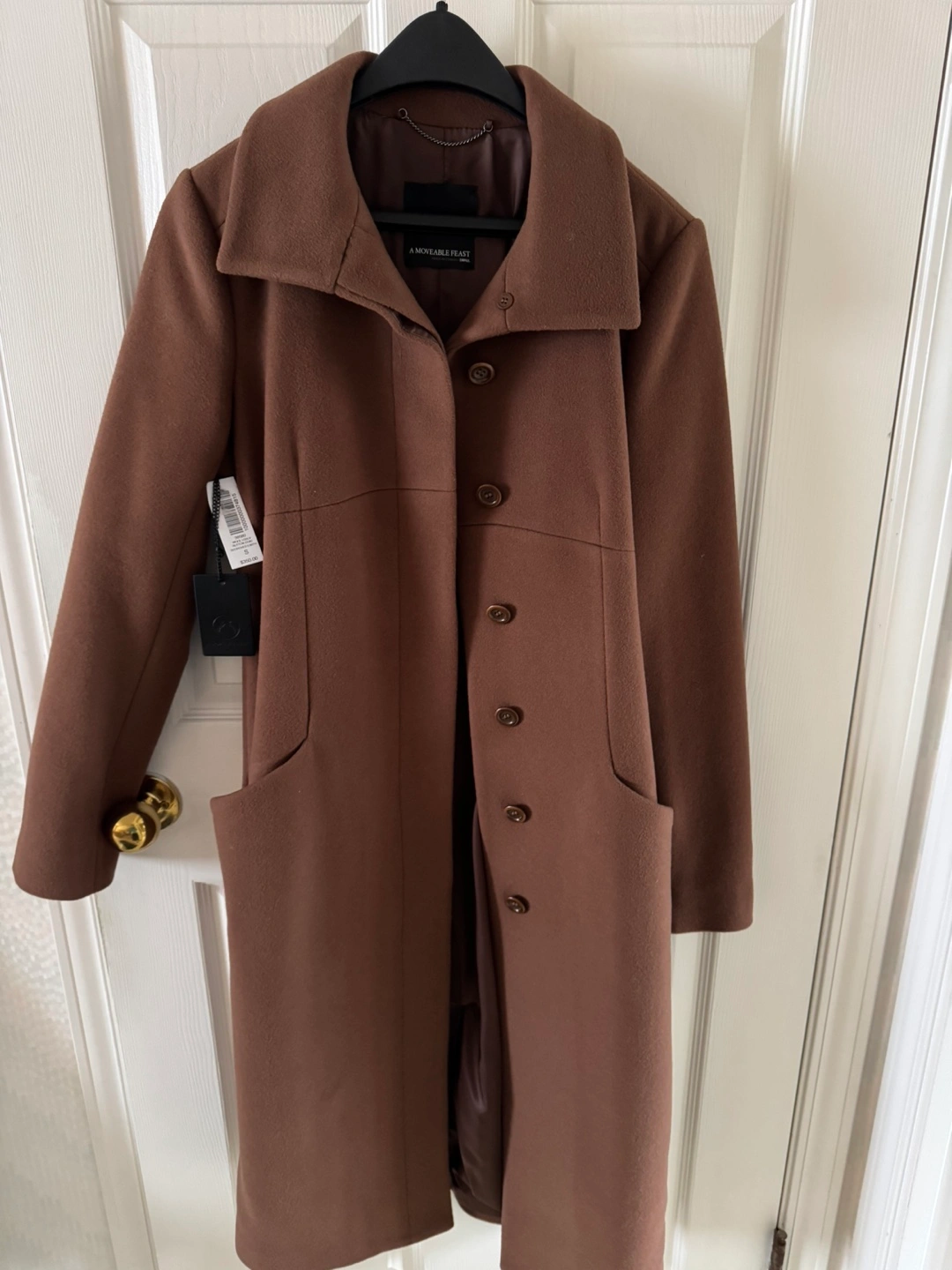 Gorgeous brown wool coat. Long sleeves, button closure. Classic A-line silhouette. 70% wool, 20% polyamide, 10% cashmere. Includes garment bag. Brand new with tag on. Made in Canada.
