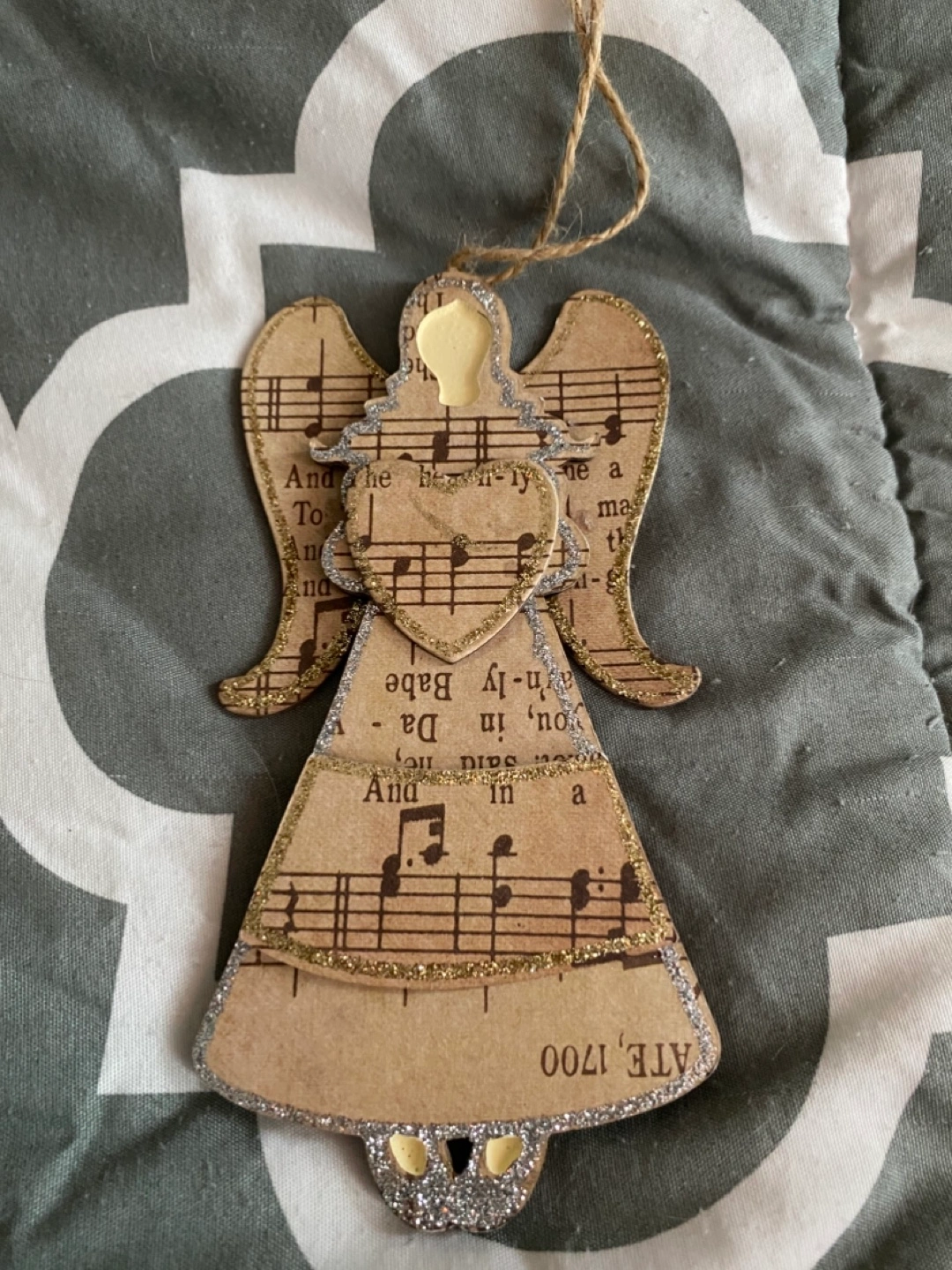 Adorable angel ornament. Made from repurposed sheet music. Features a rustic design. Perfect for your Christmas tree.🧡