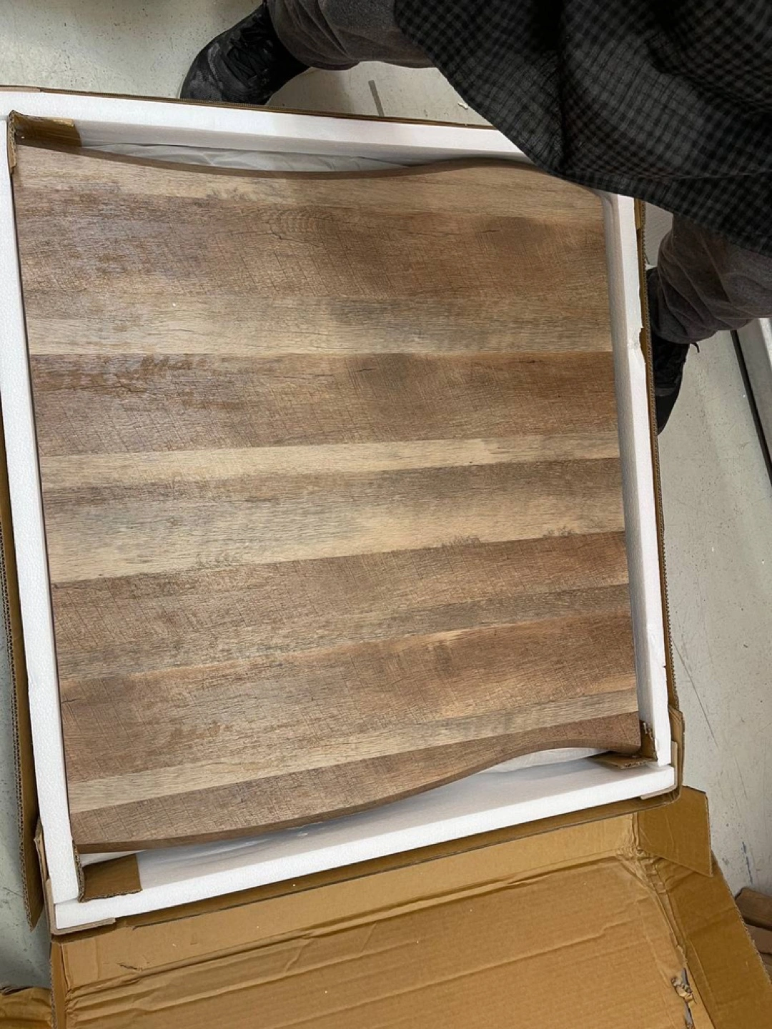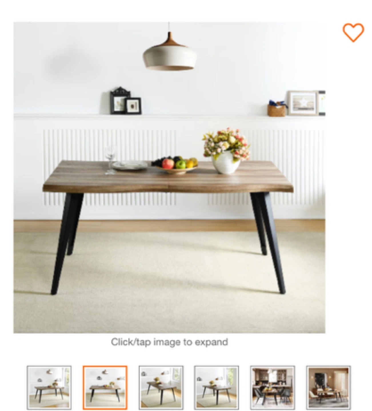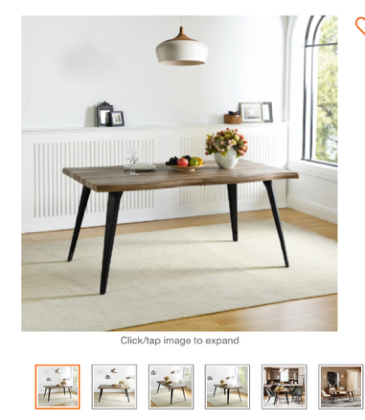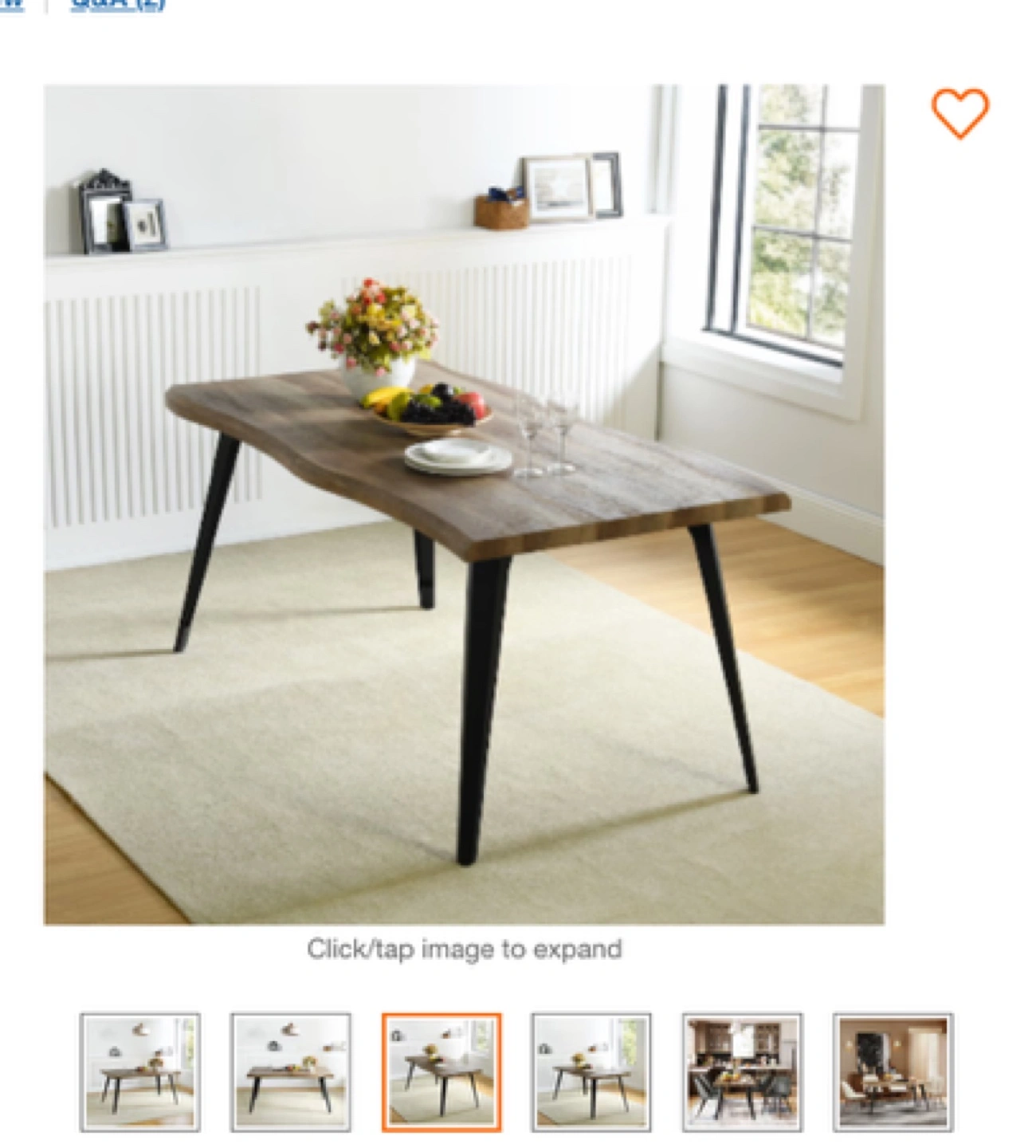 Beautiful live edge dining table. Features a light brown wood top and black metal legs. Modern farmhouse style. Great for smaller spaces.