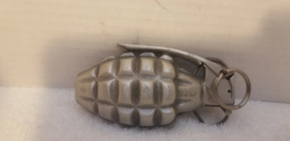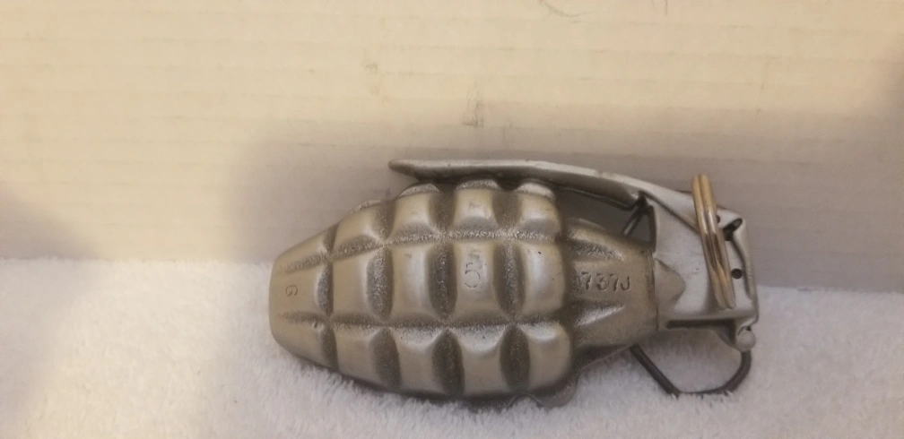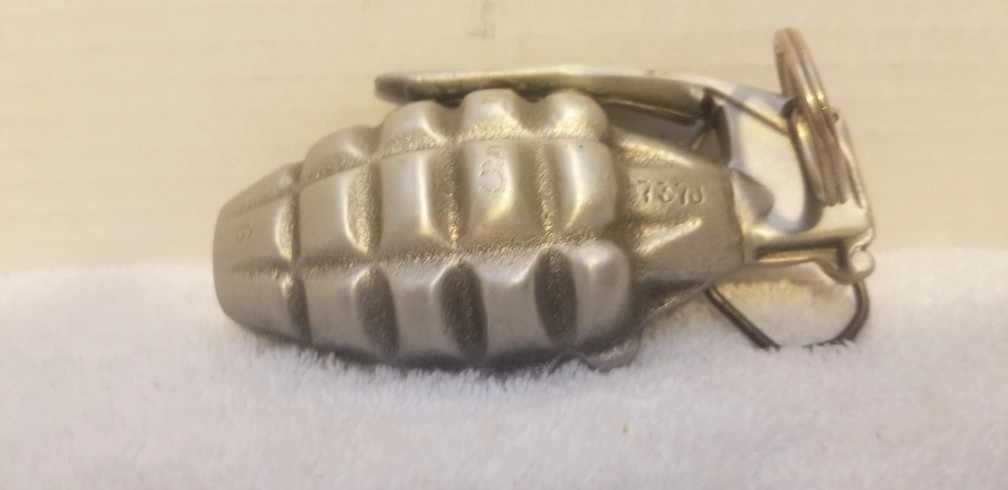 Unique pewter belt buckle. Hand grenade design. For novelty purposes only. DD142 stamped on the back. Excellent collectible item.