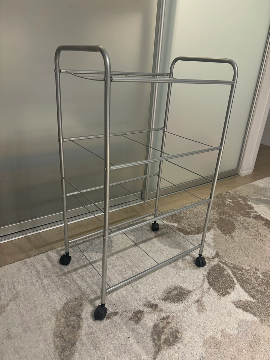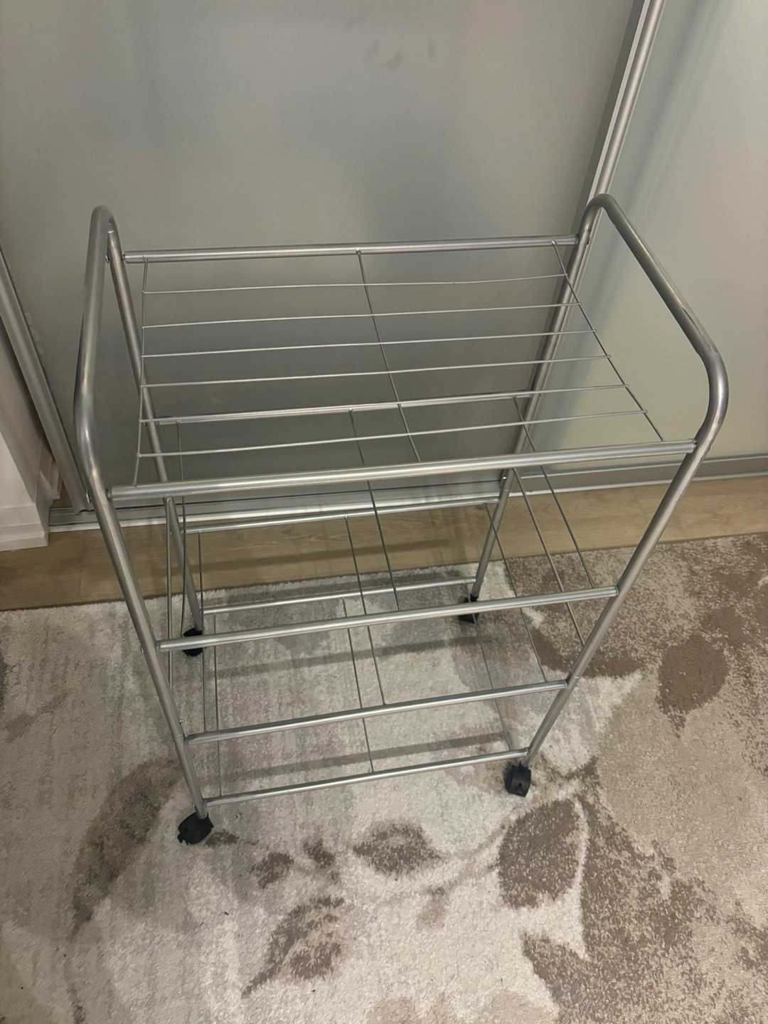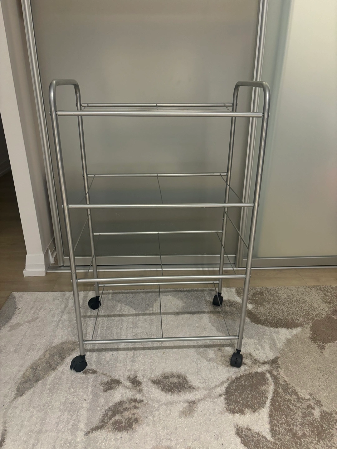 Four-tier rolling storage unit. Metal frame and wire shelves. Great for shoes, books, or other storage needs. Easy to move with four caster wheels.