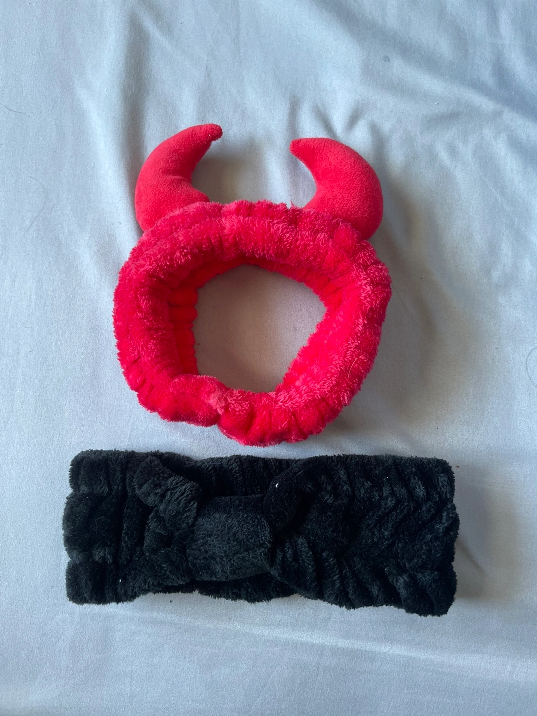 75Set of two fuzzy headbands. One red headband features devil horns. The other is black with a knotted design. Perfect for adding a fun touch to any look. and perfect for getting hair out the way while doing tasks and makeup