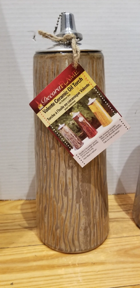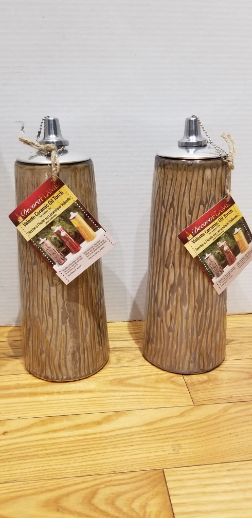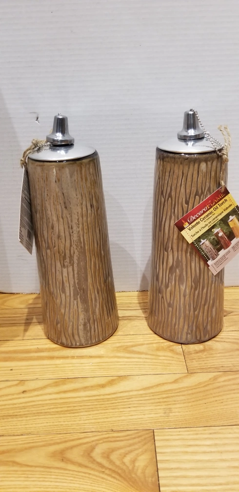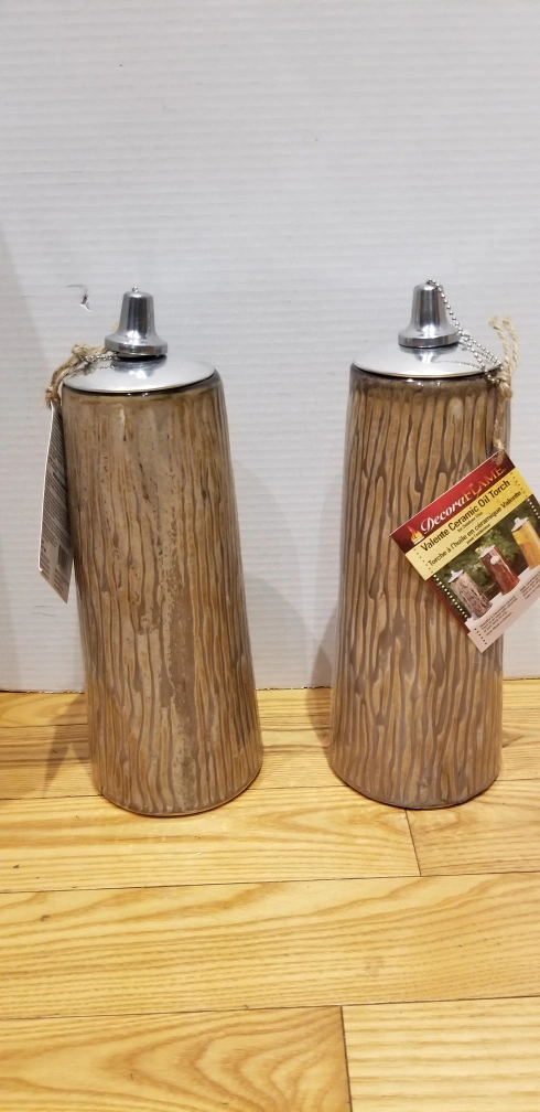 Pair of DecorFlame Valente ceramic oil torches. Wood grain design. Silver metal tops with chains. Unused.