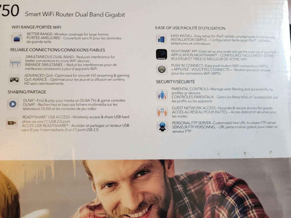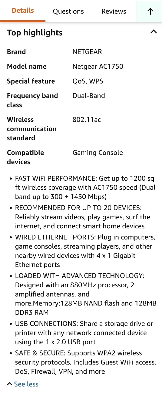 Dual-band Gigabit router. Up to 1200 sq ft wireless coverage. Up to 1750 Mbps speed. Connects up to 20 devices. 4 x 1 Gigabit Ethernet ports and 1 x 2.0 USB port. Advanced QoS and parental controls. Includes WPS.