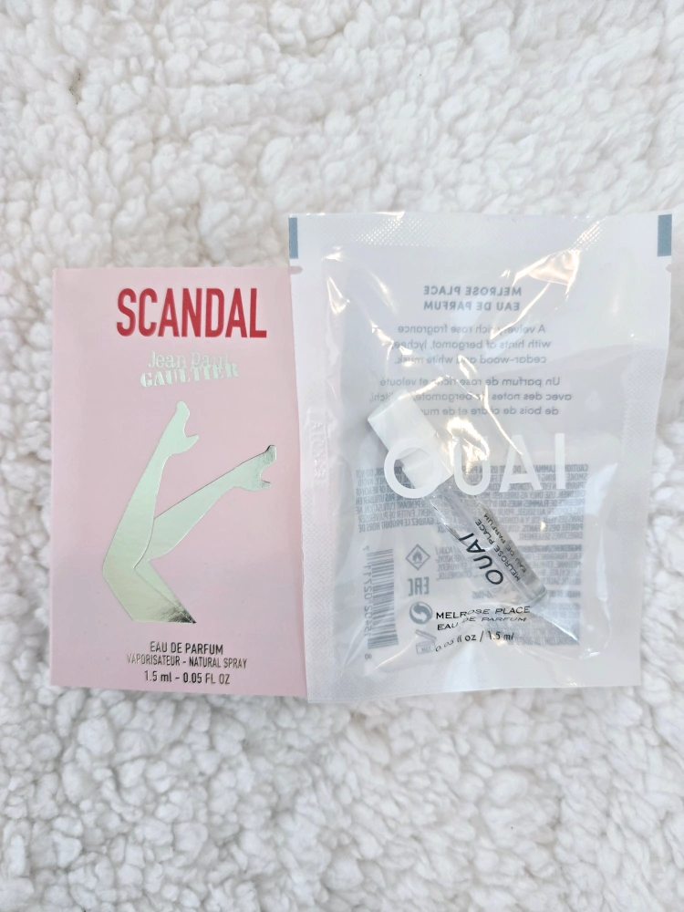 Miniature sample of Scandal by Jean Paul Gaultier. Includes a separate Melrose Place Eau de Parfum sample.