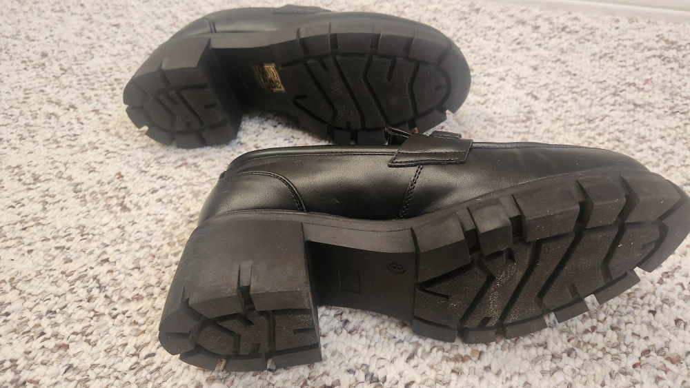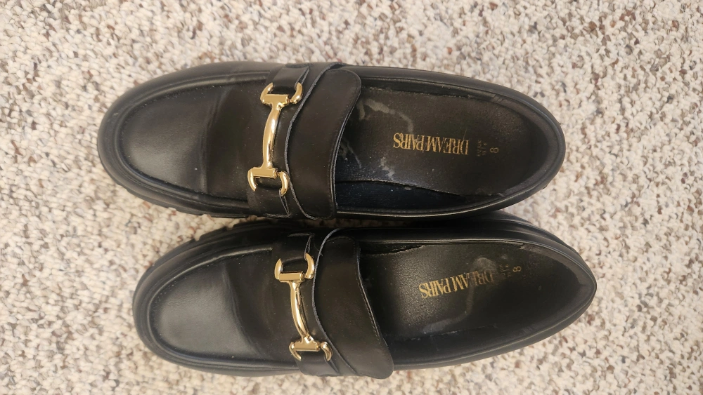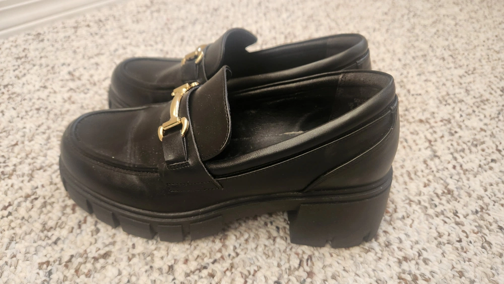 Women's black platform loafers. Gold buckle detail. Chunky platform sole. Size 8.