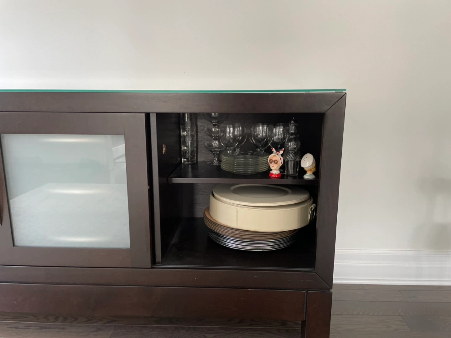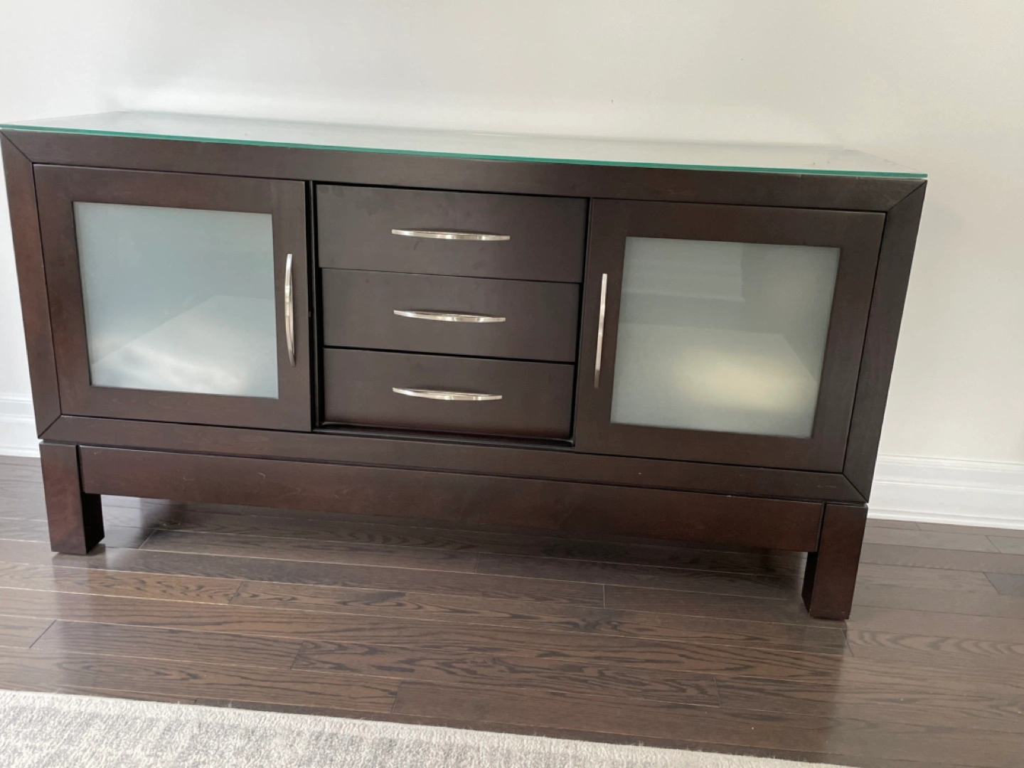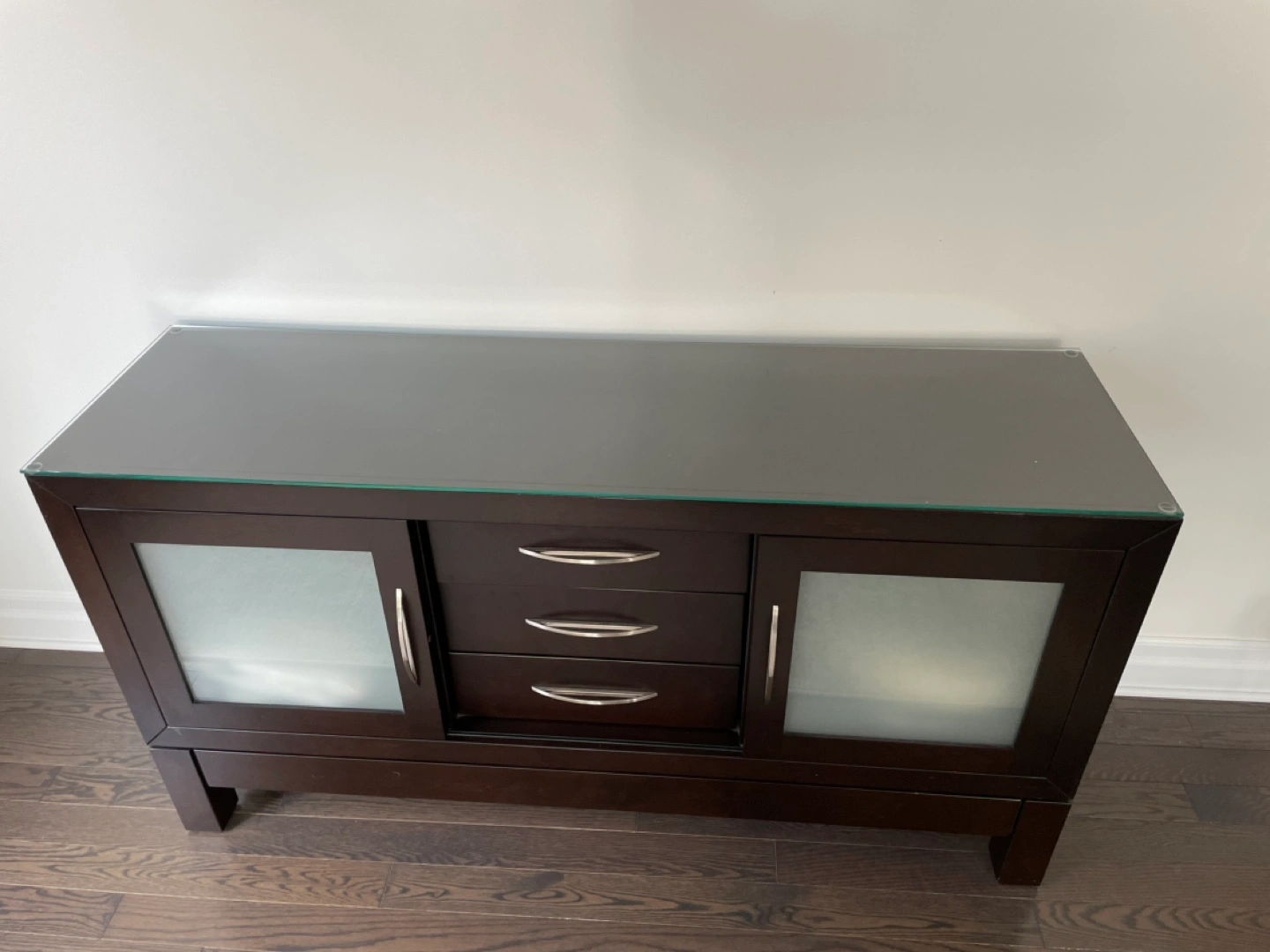 Dark brown wood buffet server. Features glass top, three drawers, and two glass-paned doors. Ample storage space. Modern design.