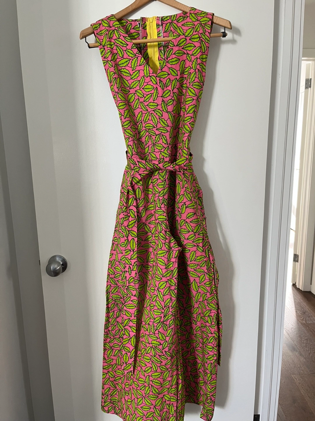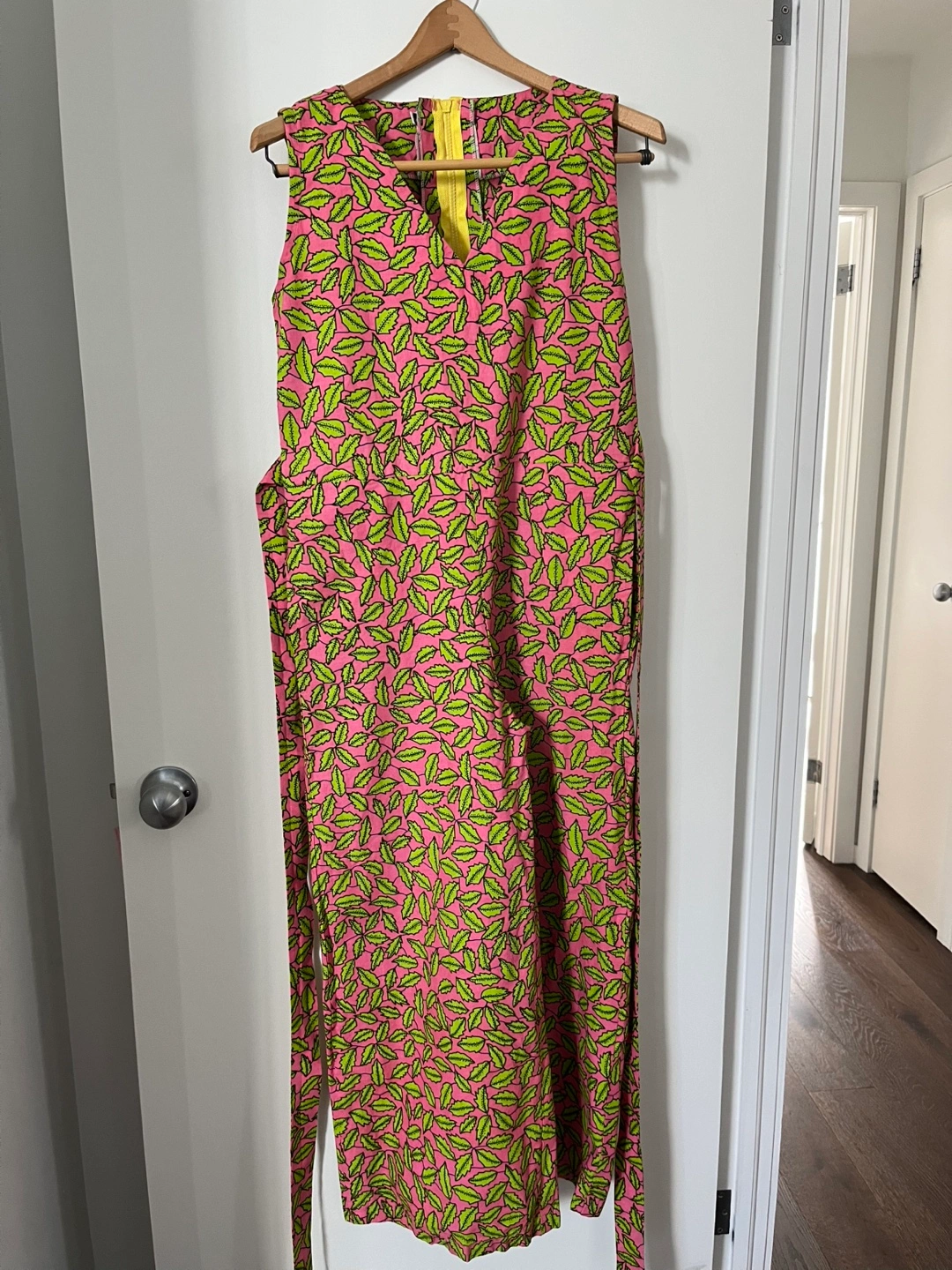 Sleeveless jumpsuit. Wide-leg pants. Pink background with a lime green leaf print. Features a self-tie belt. Hidden zipper closure at the back. Fits snug for a small