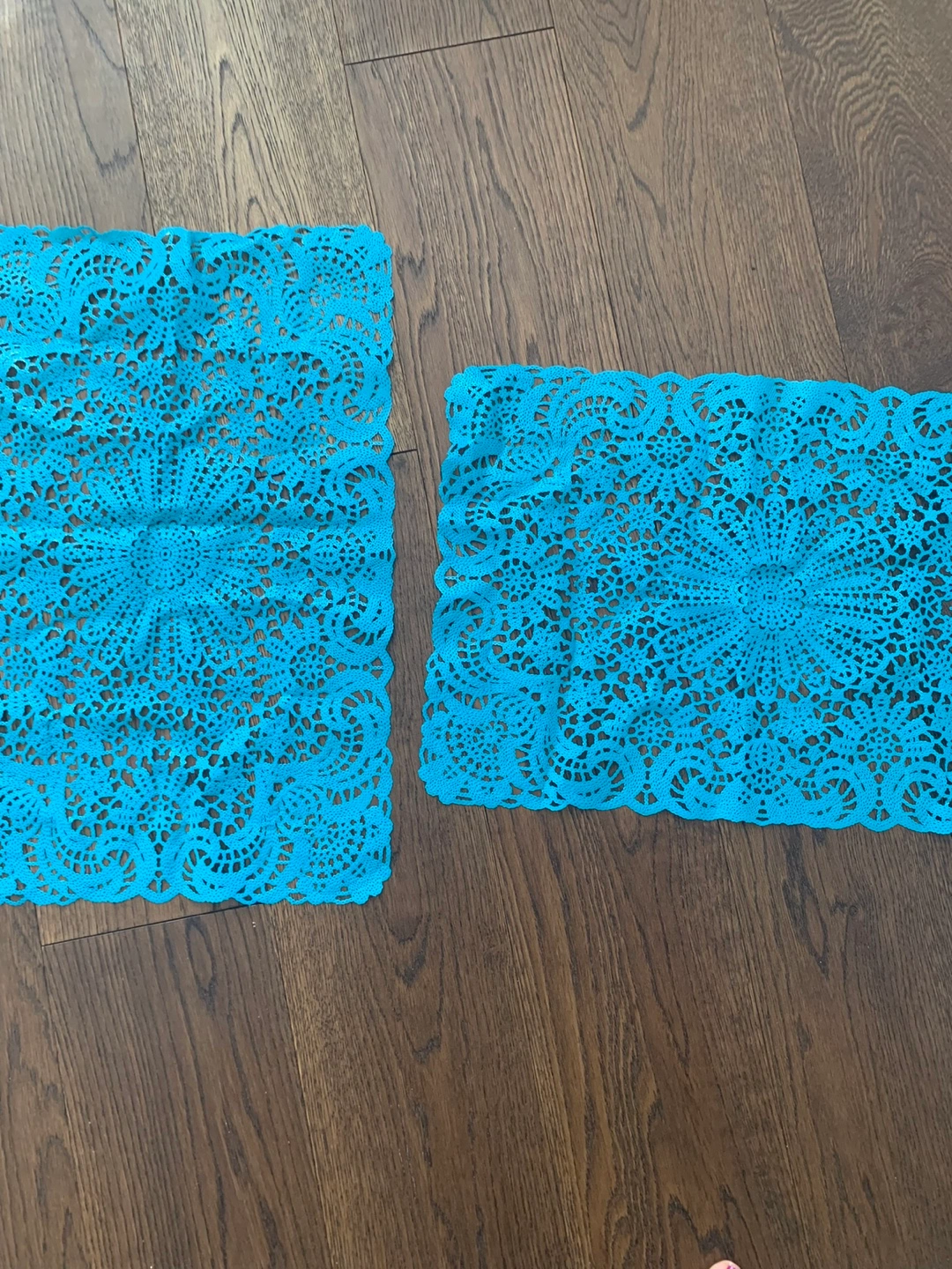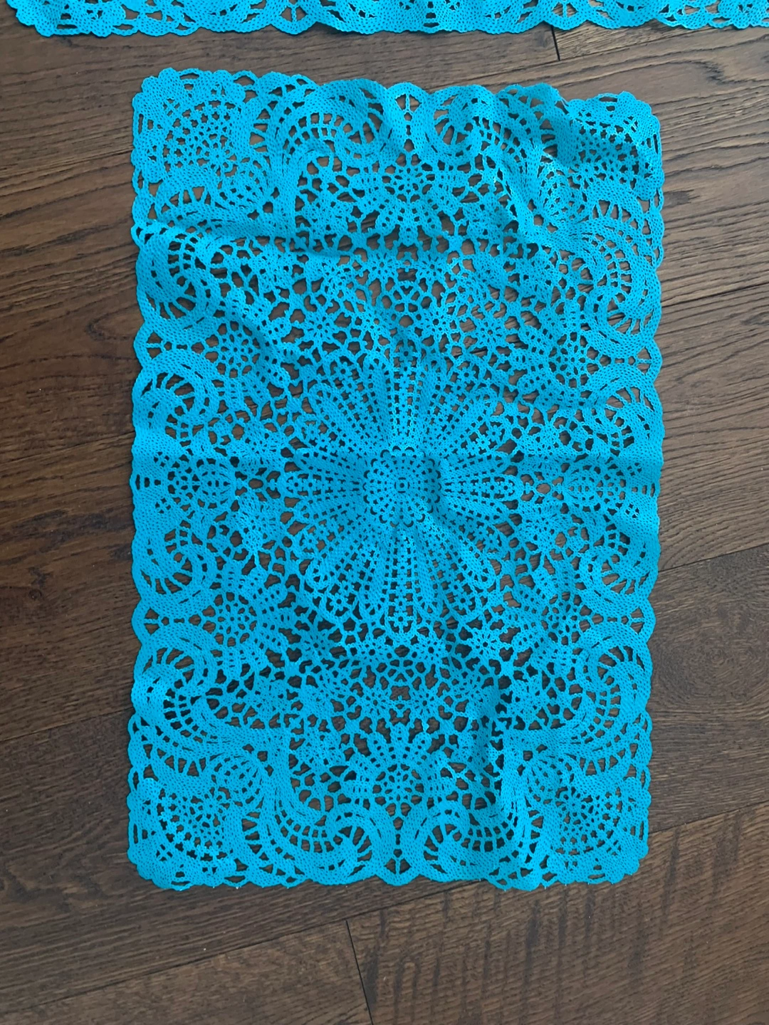 Two beautiful teal crochet vinyl placemats. Intricate design. Perfect for adding a touch of elegance to your table. Great condition.