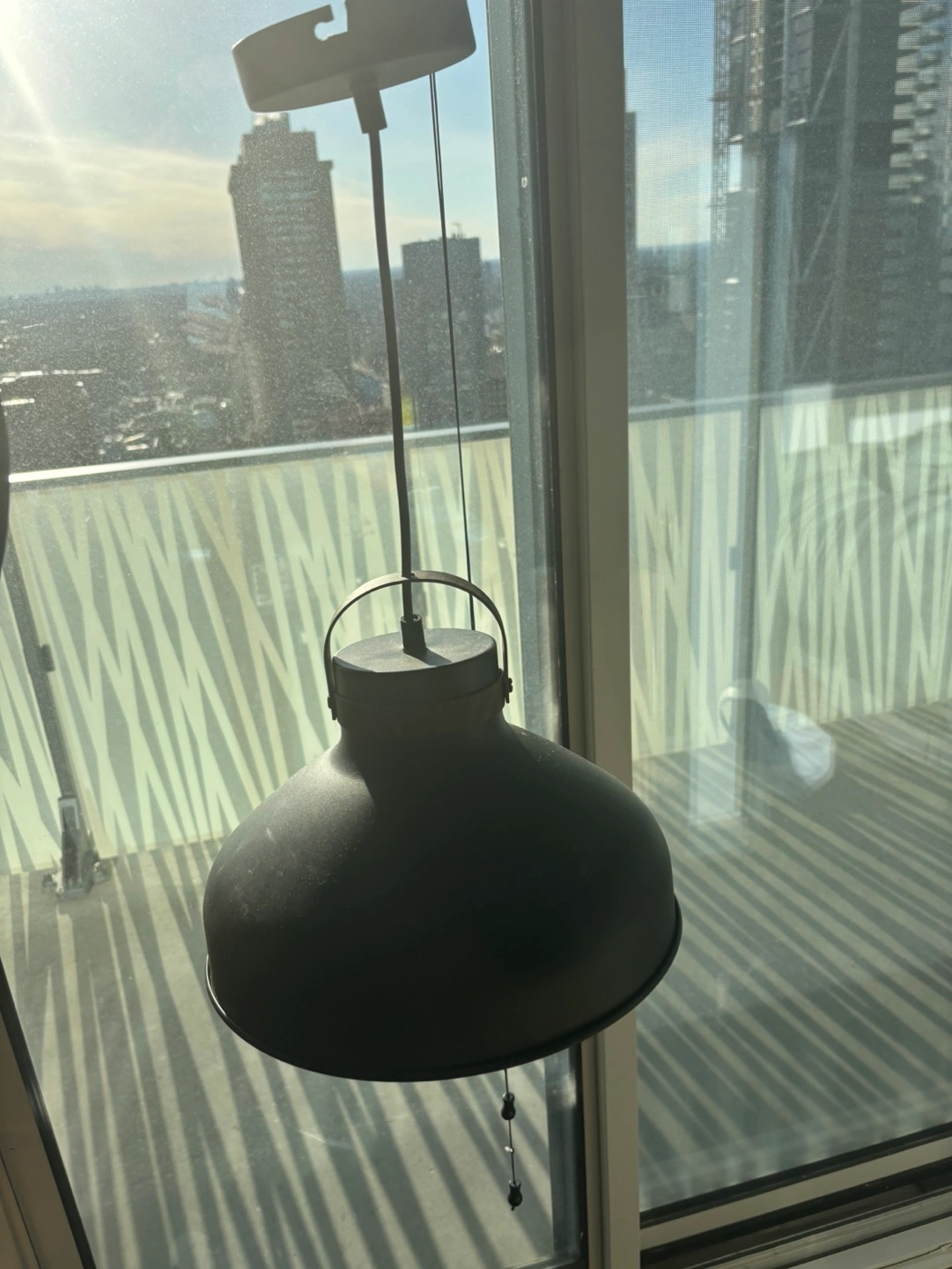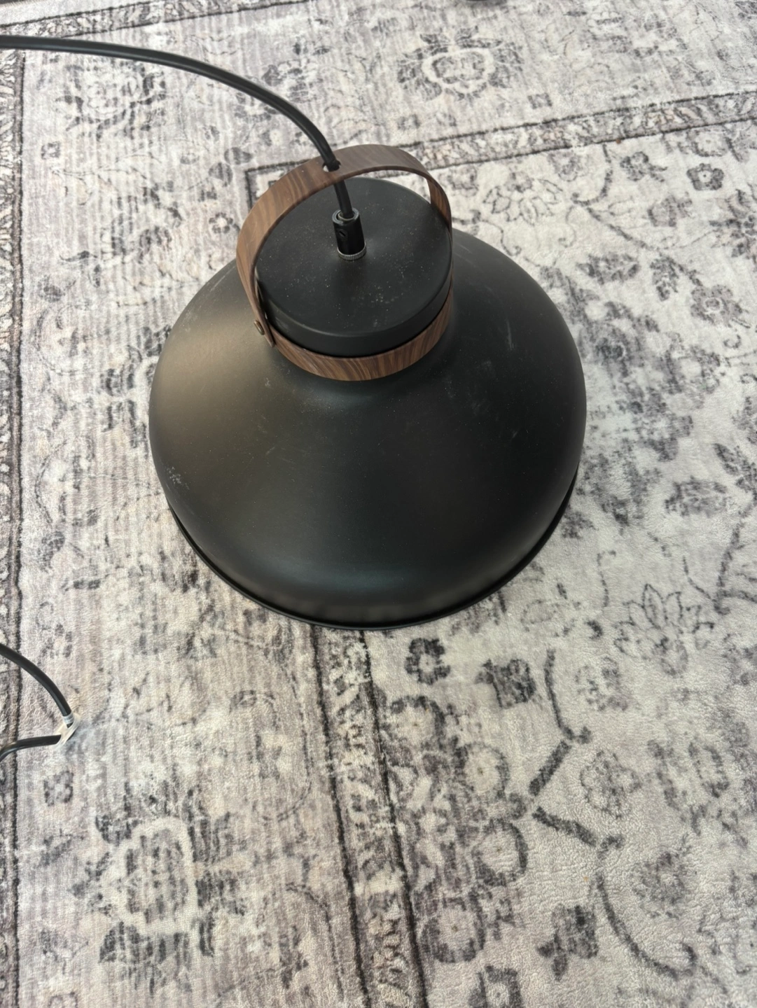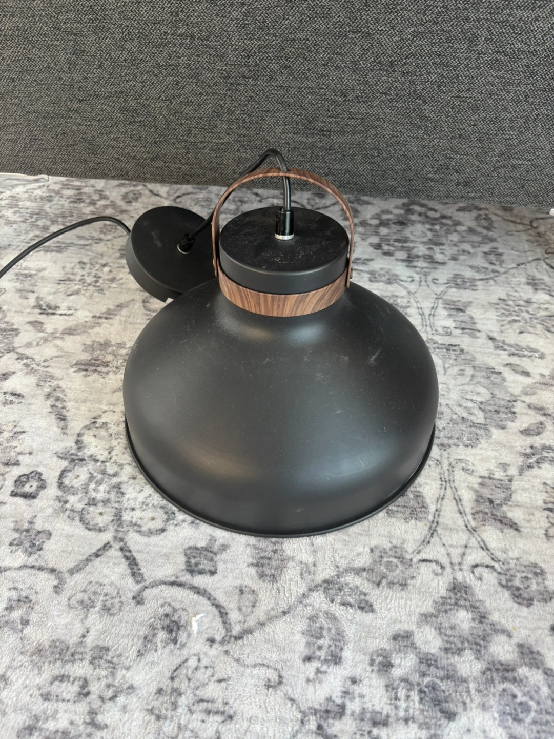 Modern pendant light fixture. Black metal shade with a wood accent around the top. Simple design, perfect for various spaces. Includes hanging cord and ceiling mount.