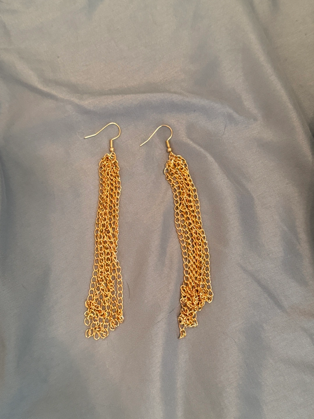 Long gold chain drop earrings. Perfect for adding a touch of elegance to any outfit. Lightweight and comfortable to wear.