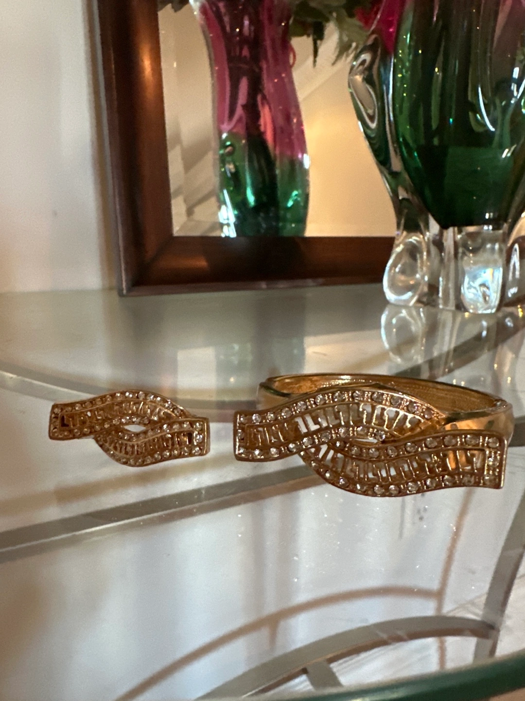 Stunning gold tone bracelet and ring set. Features clear rhinestone accents. Elegant design. Perfect for a special occasion.