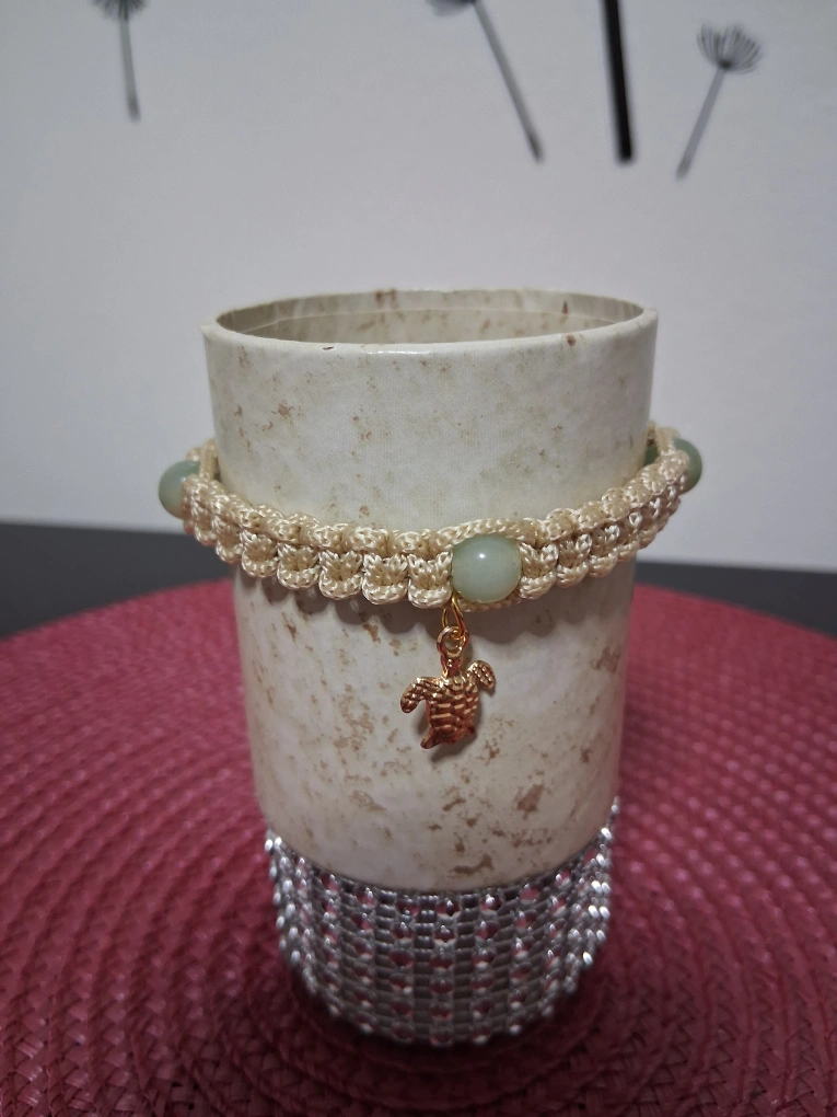 Macrame golden bracelet. Features a gold turtle charm and pale green beads. Adjustable closure. Pick up near GM Oshawa after 4 pm.