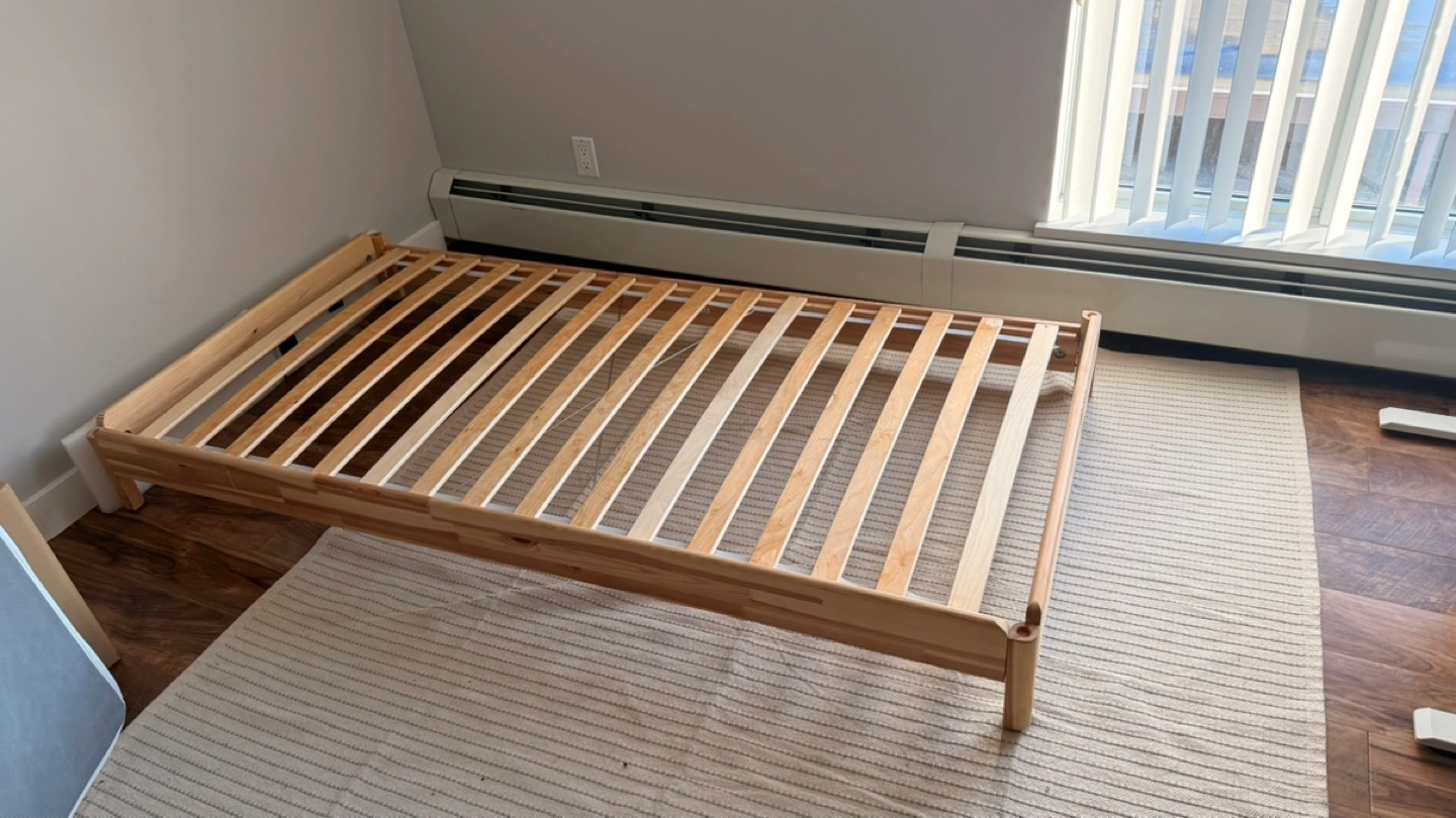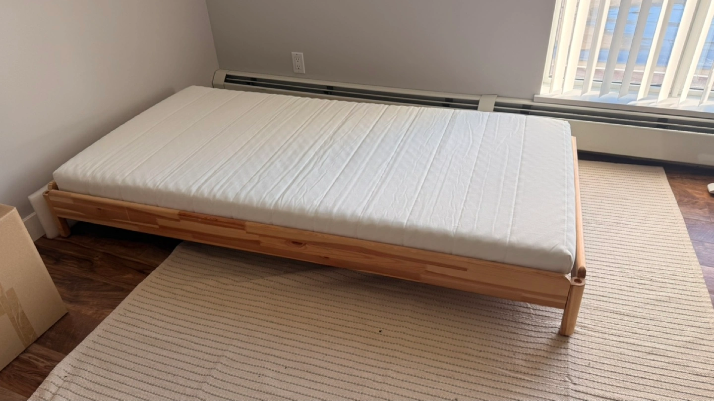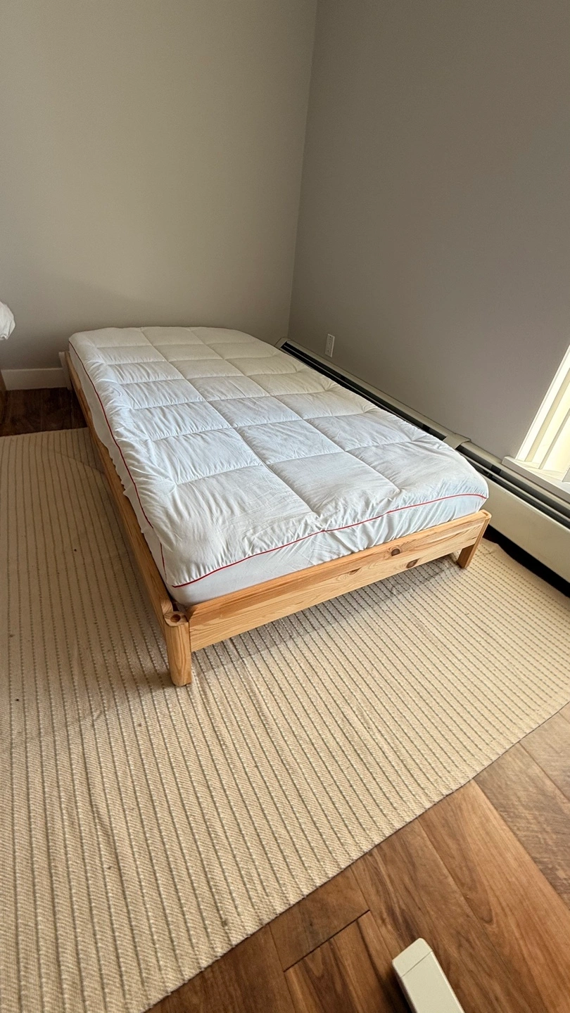 Solid pine wood bed frame. Includes a barely used white IKEA ASVANG mattress (purchased 4-5 months ago). Includes machine washable topper. Minimal assembly required.