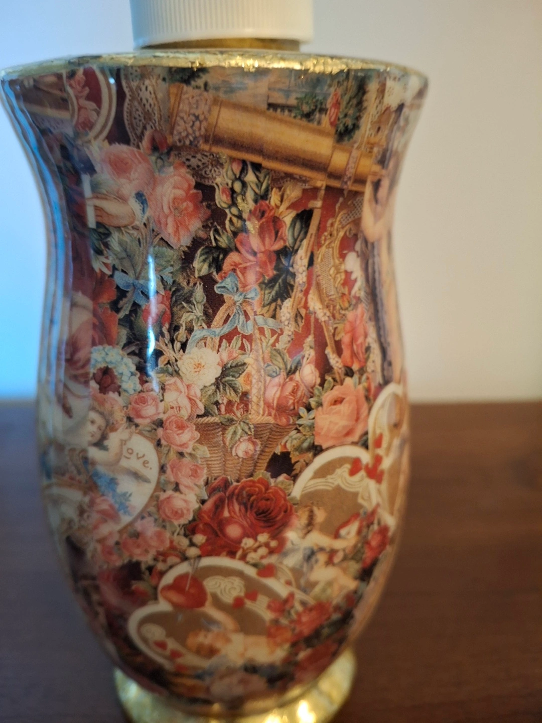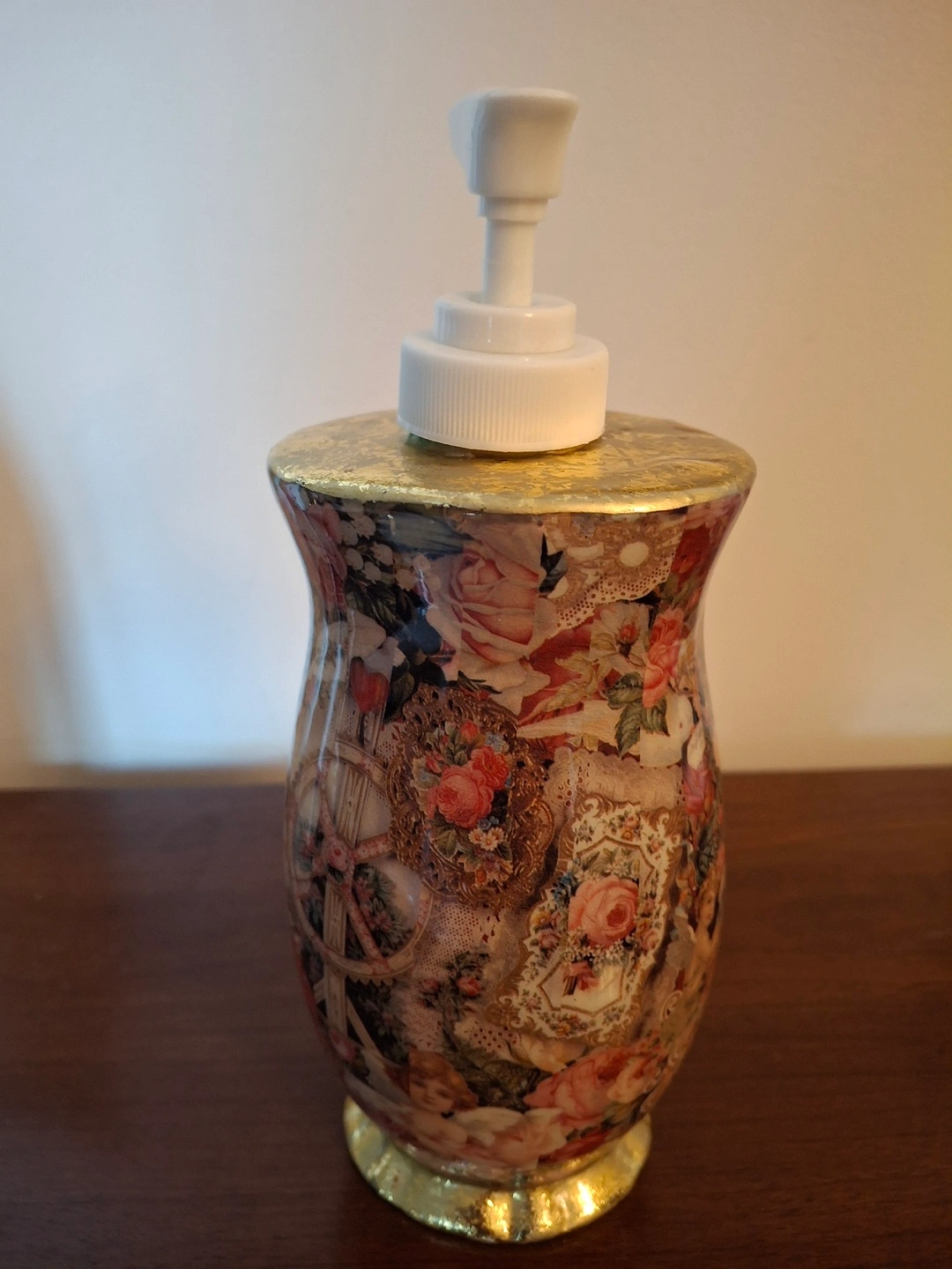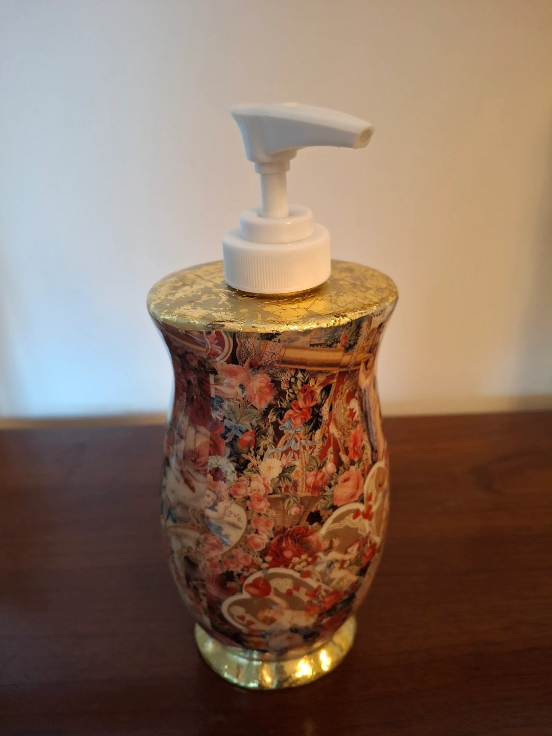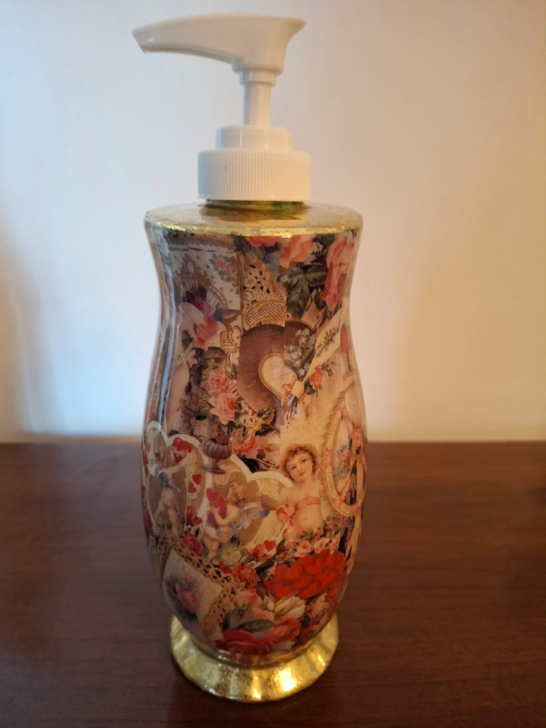 Beautiful ceramic soap dispenser. Features a floral and cherub design. Gold accents on the top and bottom. 6” bottle, 8” including spout. Excellent condition. Available for pickup in Markland Wood.