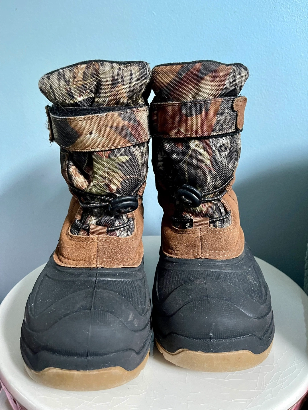 Brown and black winter boots. Camo print upper. Velcro closure. Good traction soles. Suitable for snow and cold weather.