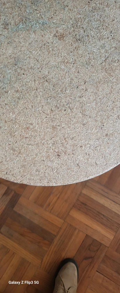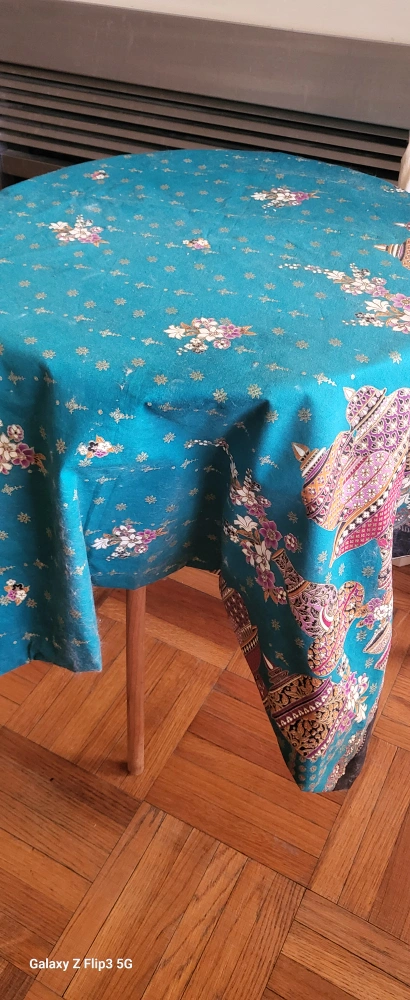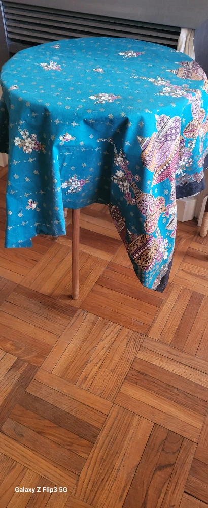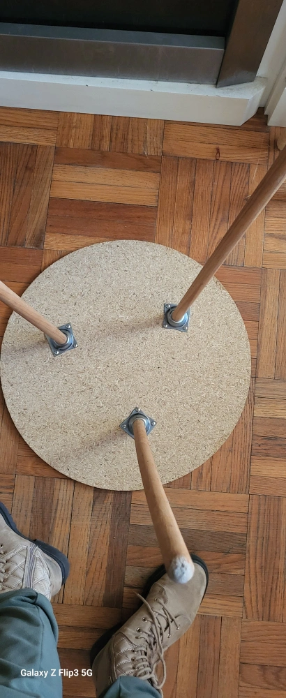 Unique round side table. Features a particleboard top and three light brown wooden legs. Perfect for a small space. Could use a bit of dusting. Fabric not included.